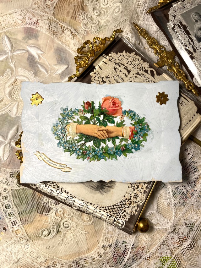 【送料込み表示】ref: 2319D Antique French Chromolithograph Postcard/アンティーク フランス クロモリトグラフ ポストカード《握手とブーケ》1900年前後