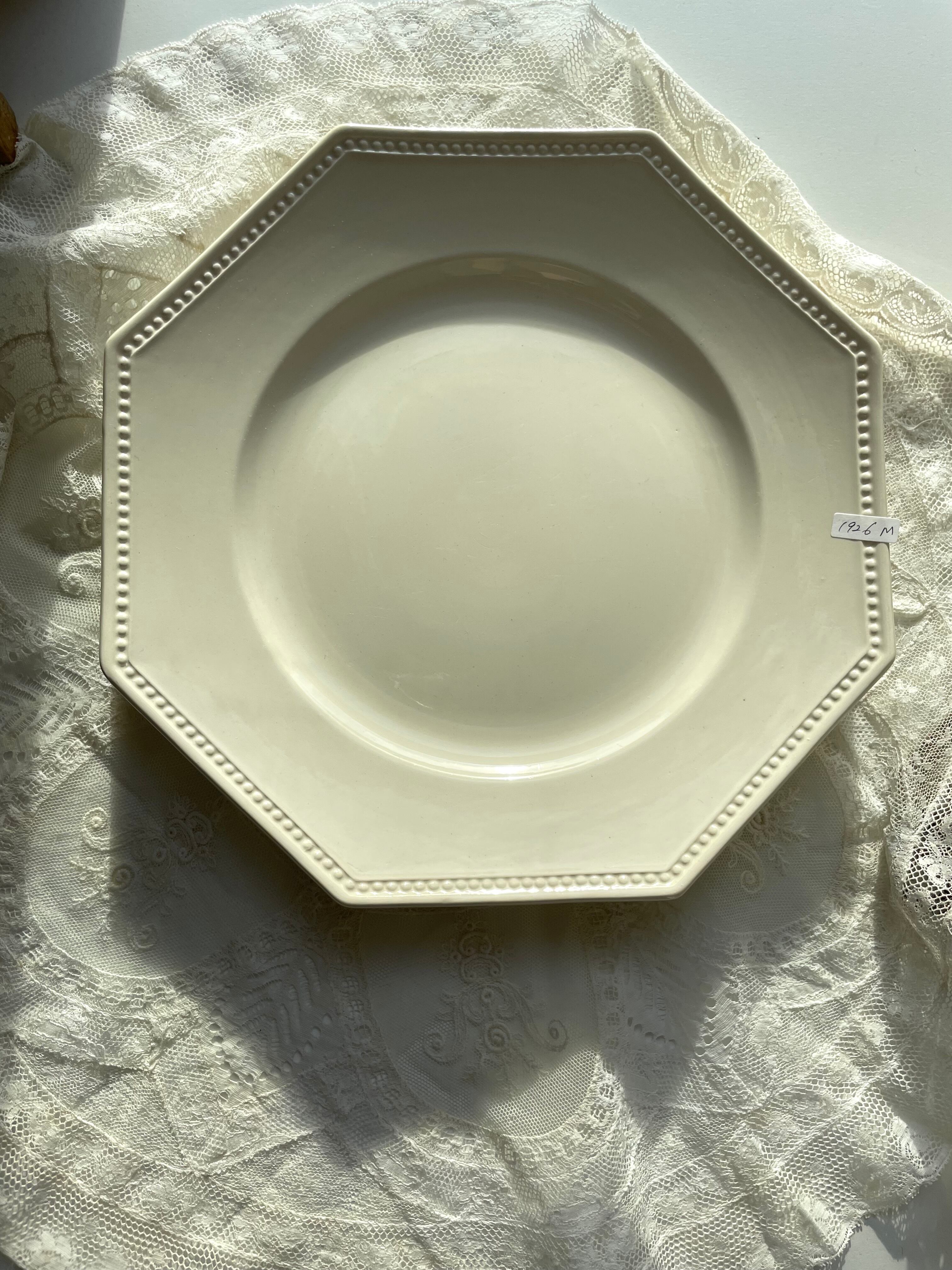 サルグミンヌのオクトゴナルのディナープレート。象牙色の色合いと縁に入ったパールの装飾がエレガントです。