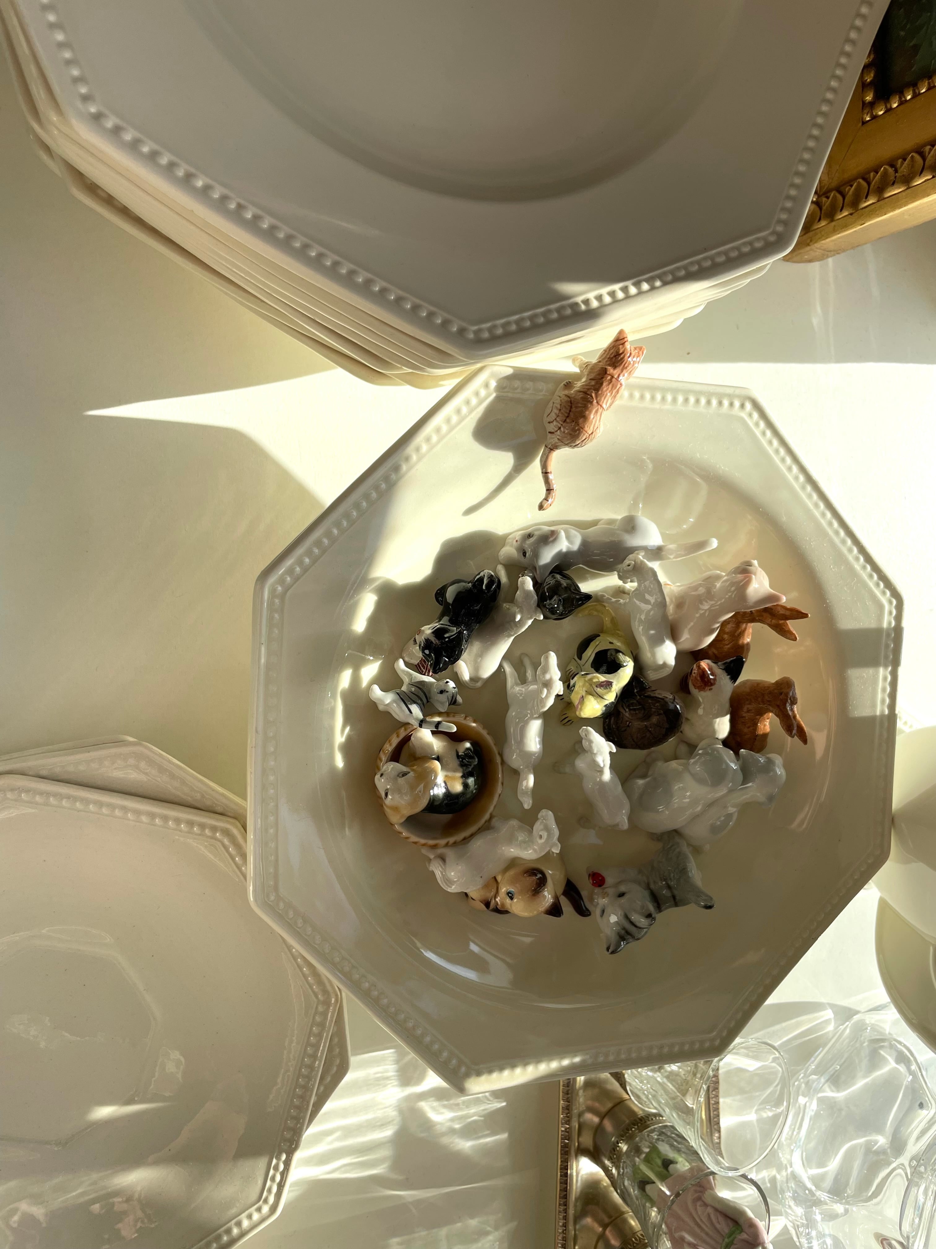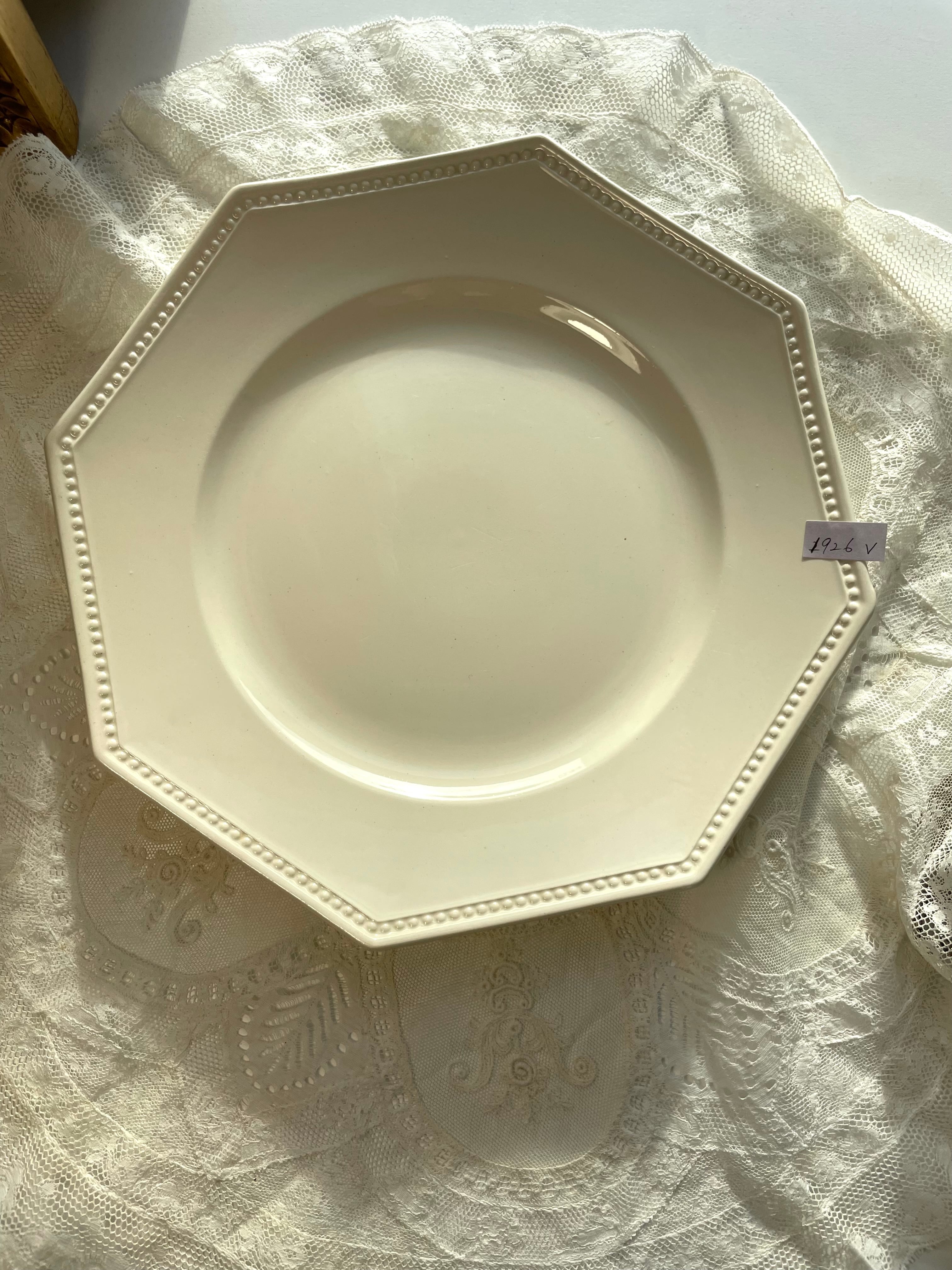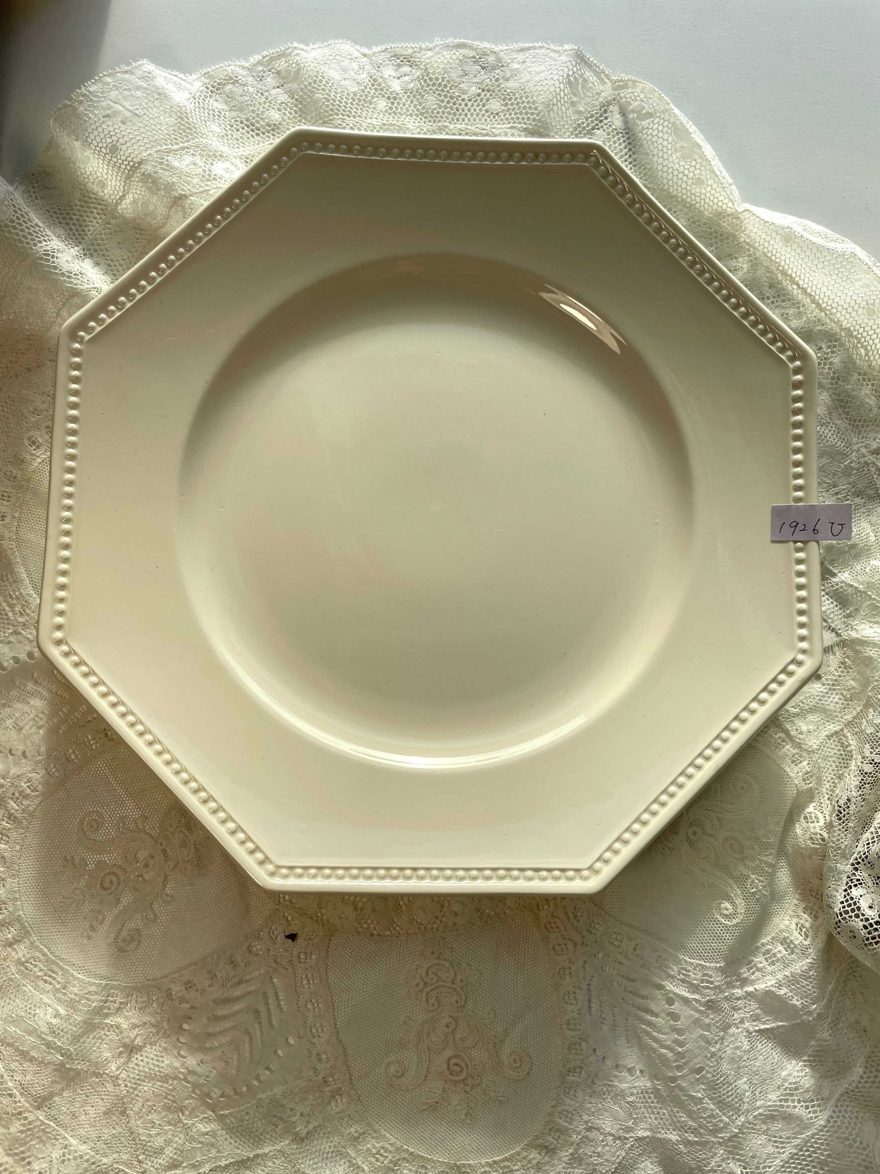 サルグミンヌのオクトゴナルのディナープレート。象牙色の色合いと縁に入ったパールの装飾がエレガントです。