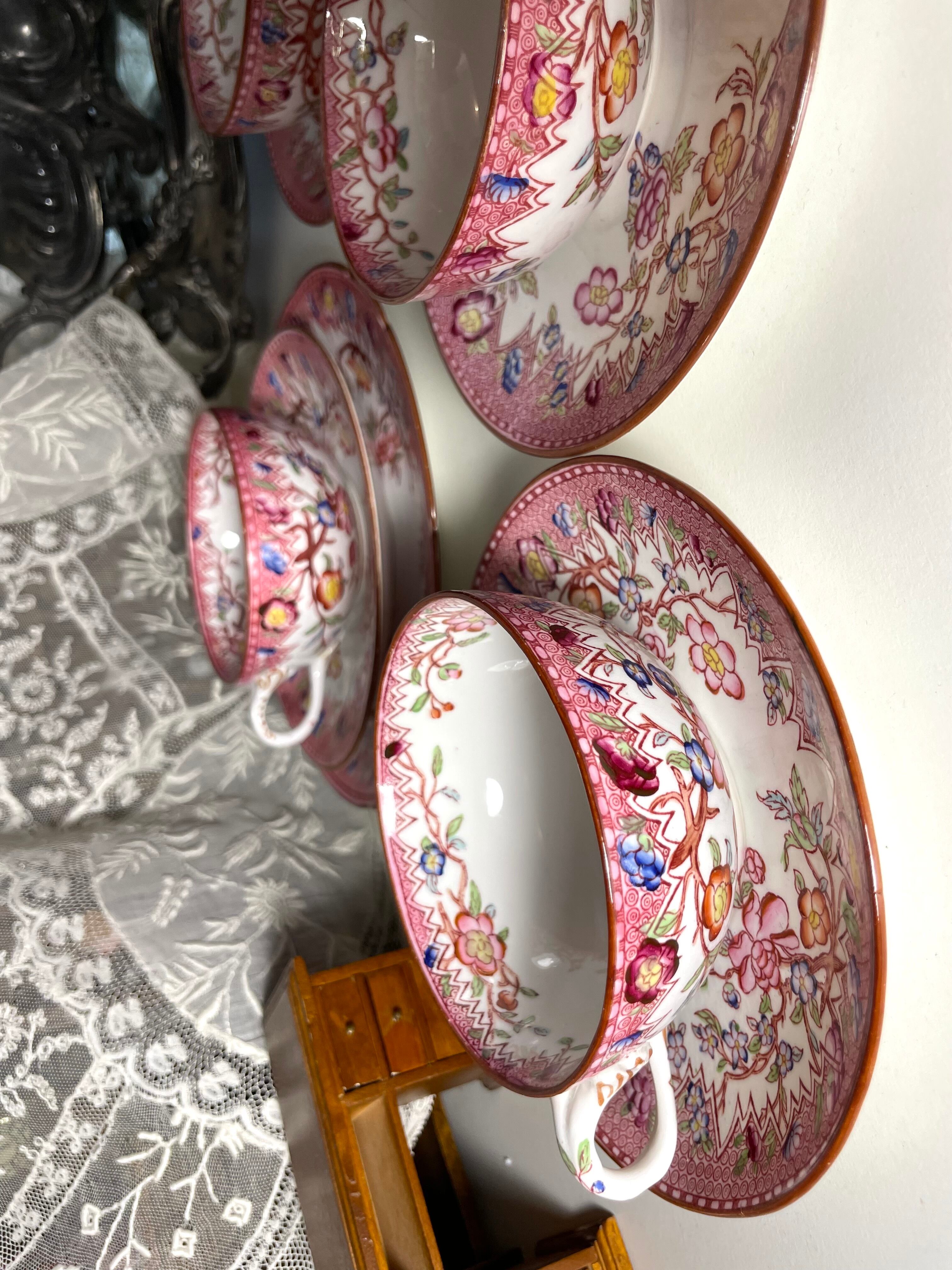サルグミン製陶所による "ミントン "柄の美しい手描きのファイアンス製ティーカップとソーサーです。