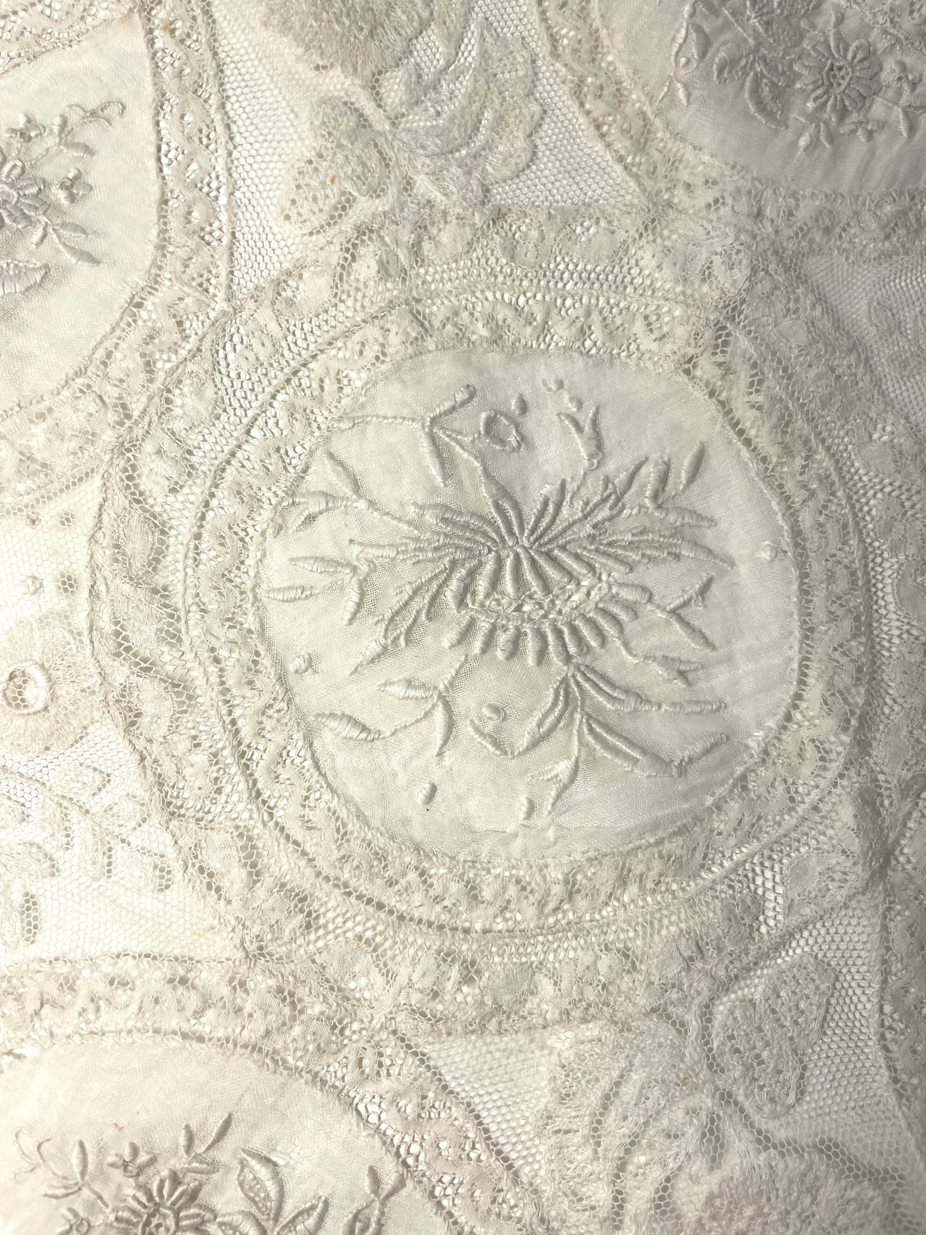 花々の刺繍が施された極薄手のコットンローン生地に、様々なフランスレースをつなぎ合わせたレースのパッチワークの至宝、フランス、ノルマンディー地方を発祥とする美しいレース手法で作られた白に近い、オフホワイトのノルマンディーレースです。