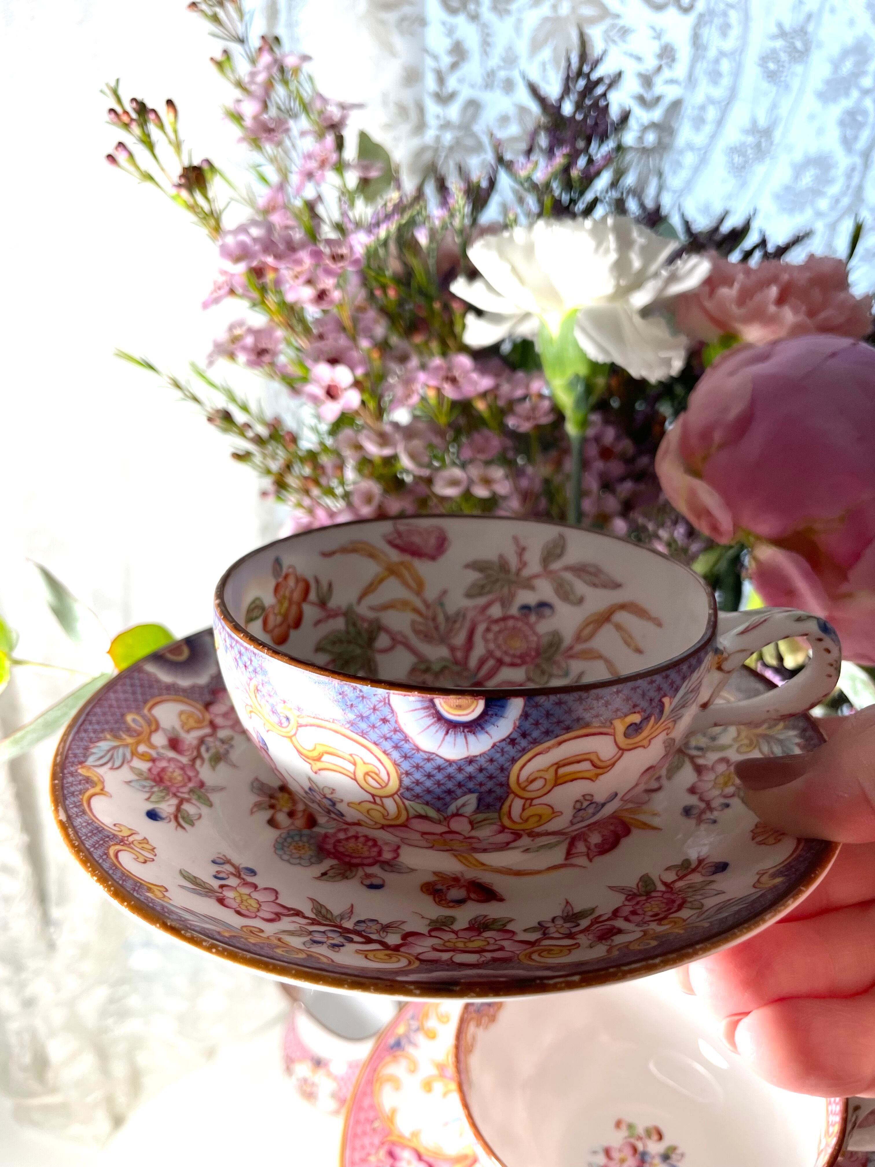 サルグミン製陶所による "ミントン"柄の美しい手描きのファイアンス製ティーカップ です。
