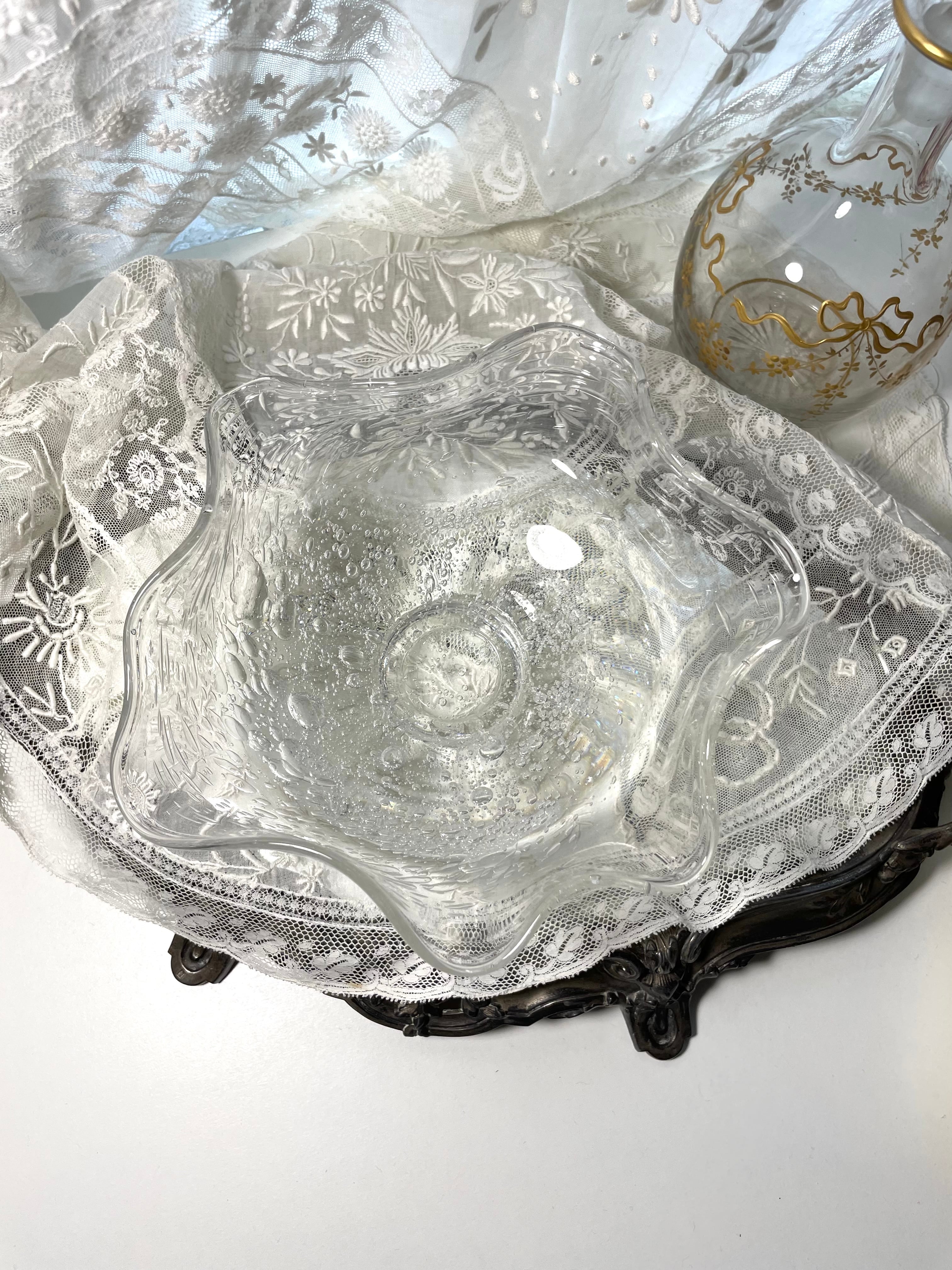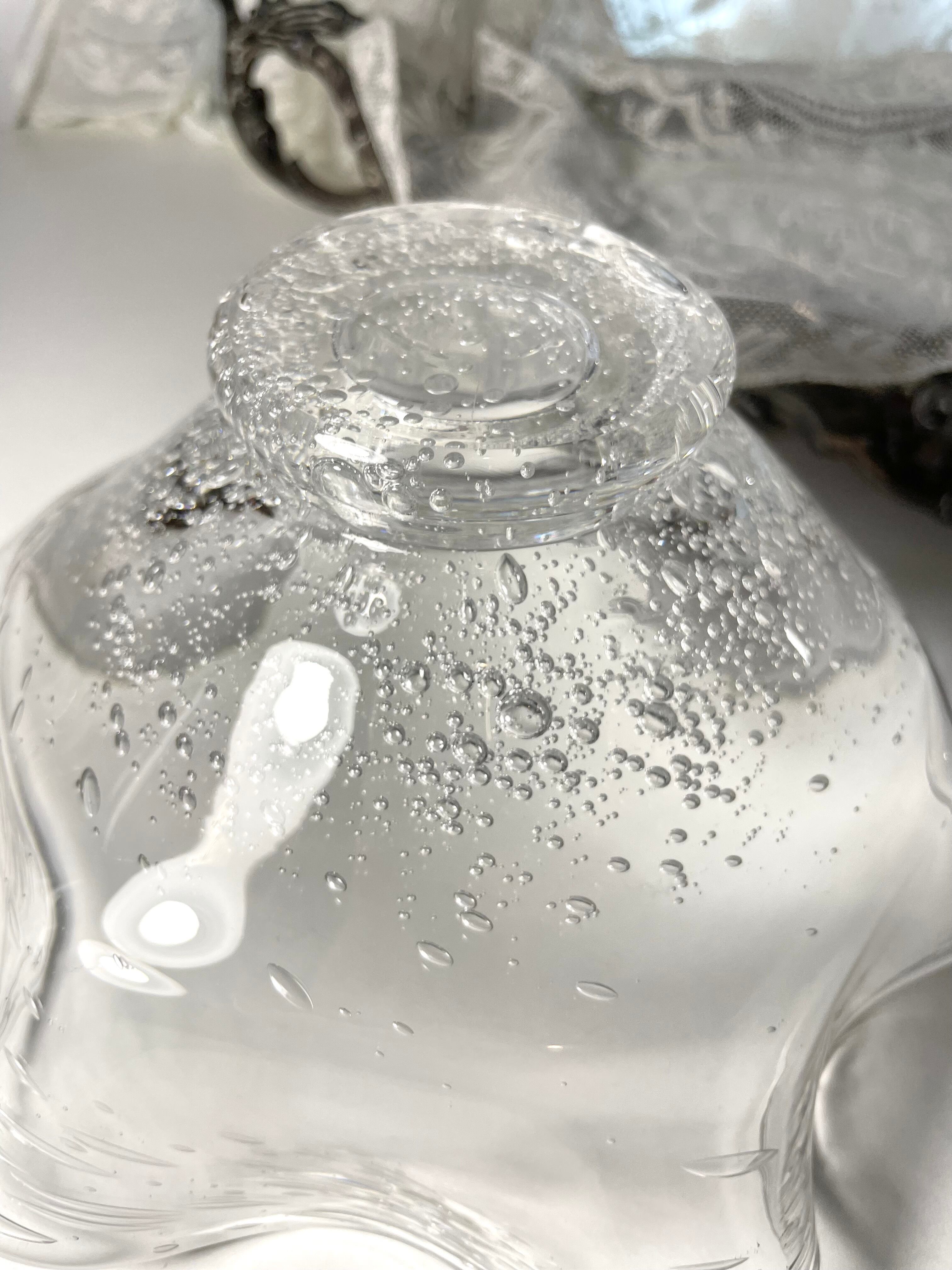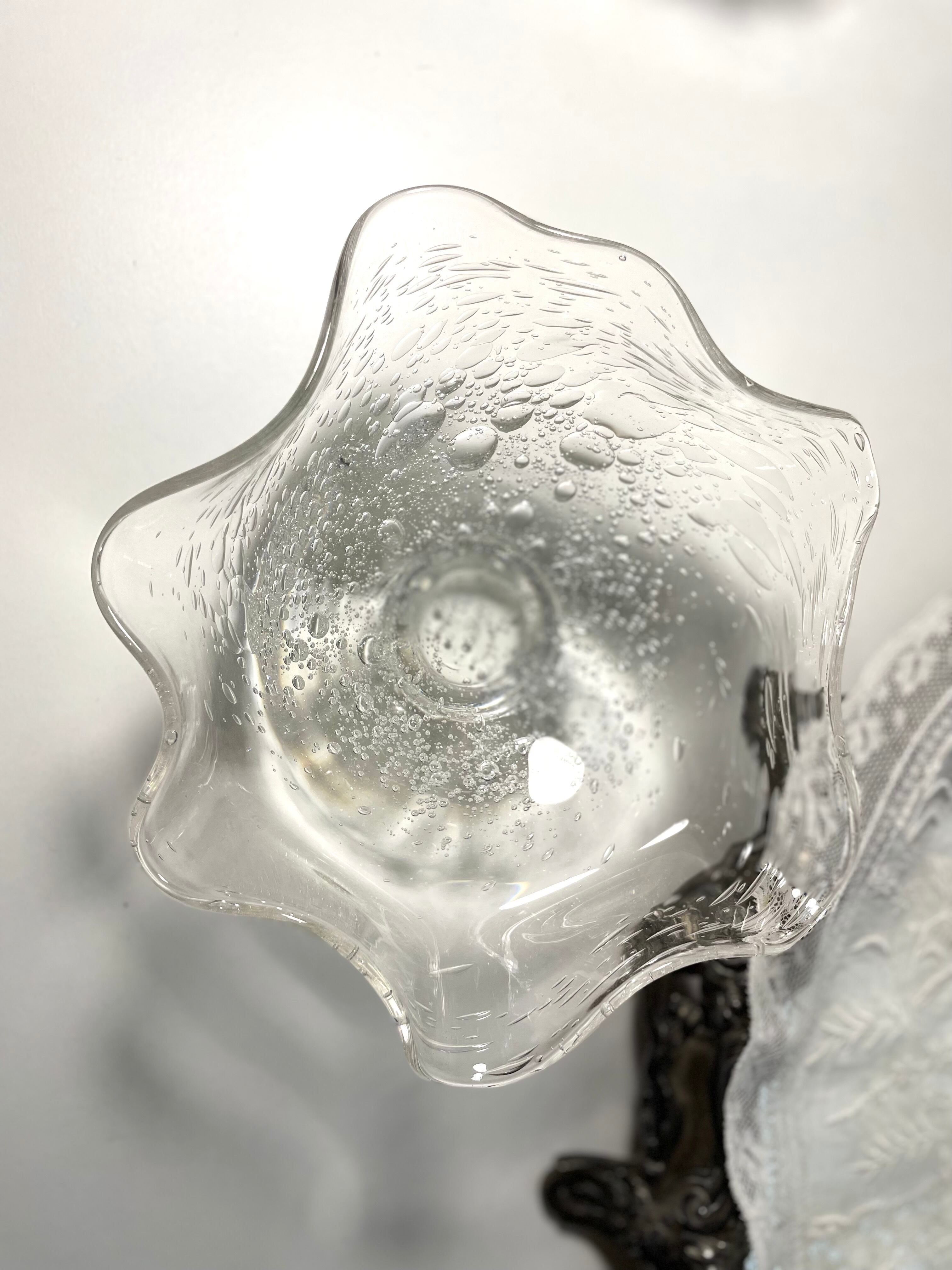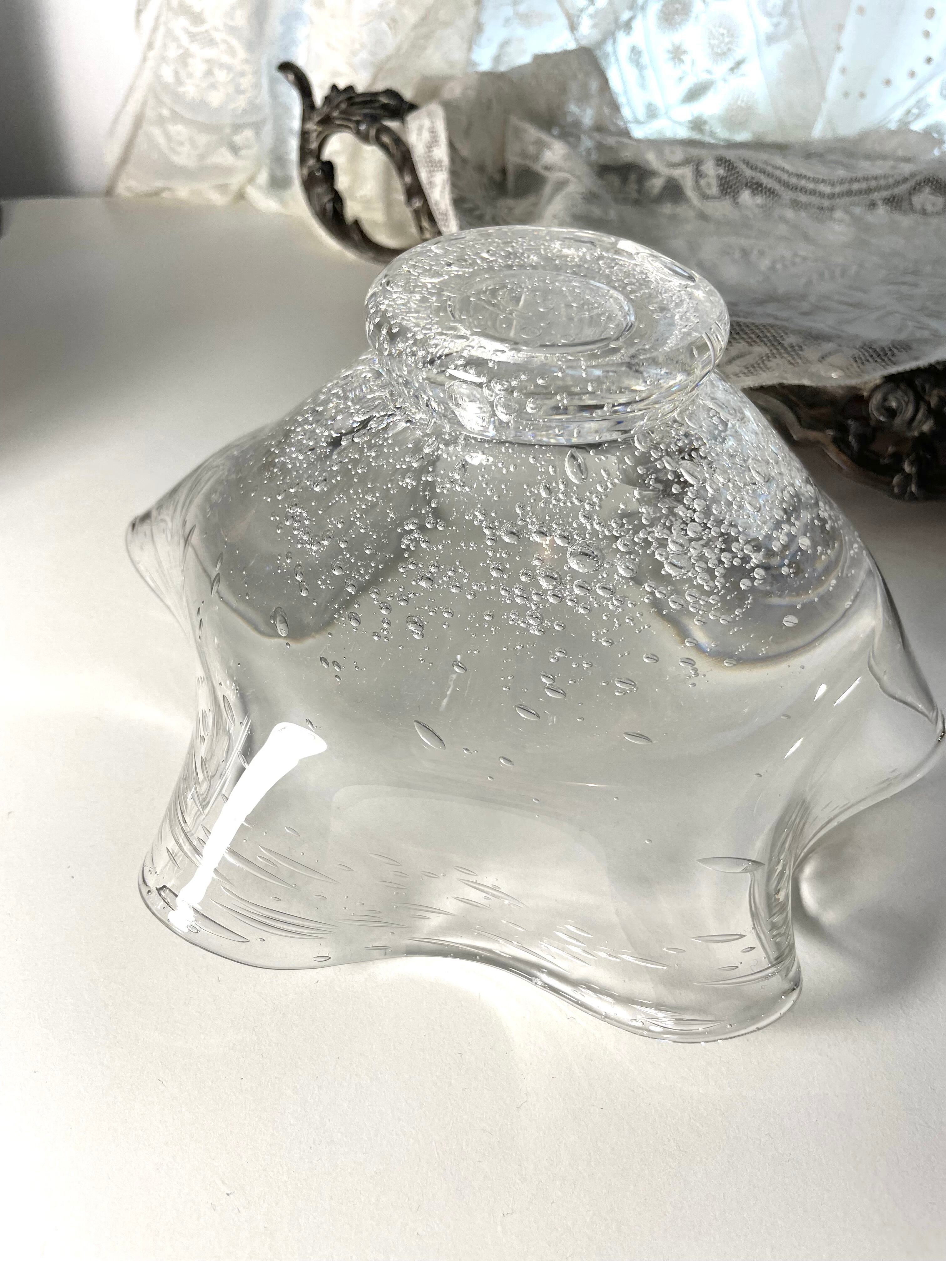 波打つ花びらのようなリムと、全体に散りばめられた気泡が美しい吹きガラスのボウル。