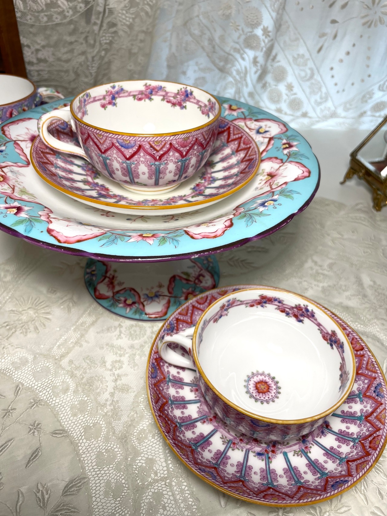 1860年代、ミントン社ではオリエンタル調の装飾が主流となり、陶磁器やボーンチャイナ製のかなり独創的な作品でも、中国の七宝や日本のうるしに象牙、イスラムの金属細工にトルコの陶器などを感じさせるものが多く制作されました。シノワズリとも、時には、ジャポニズムとも、言われるこのシリーズです。