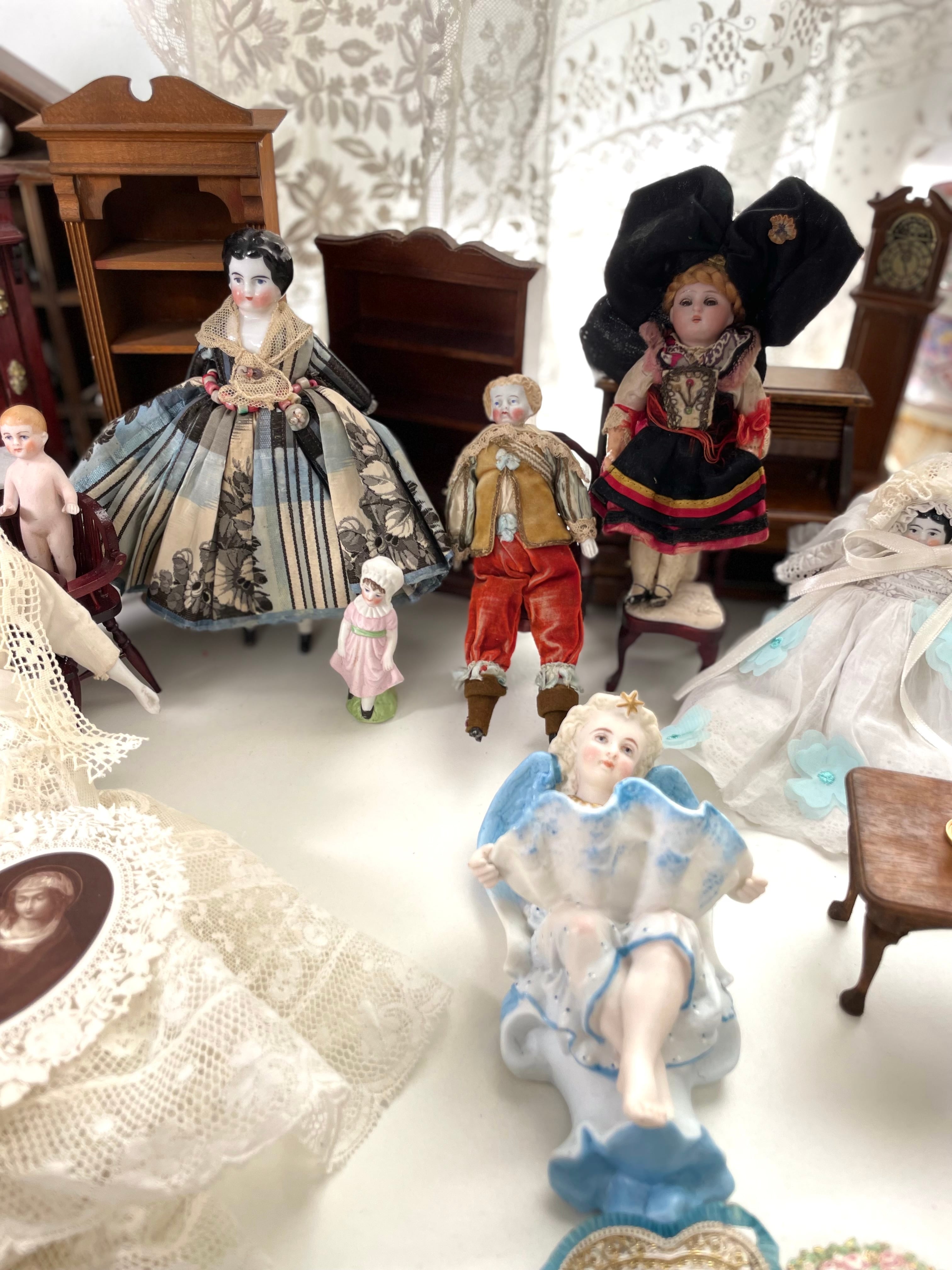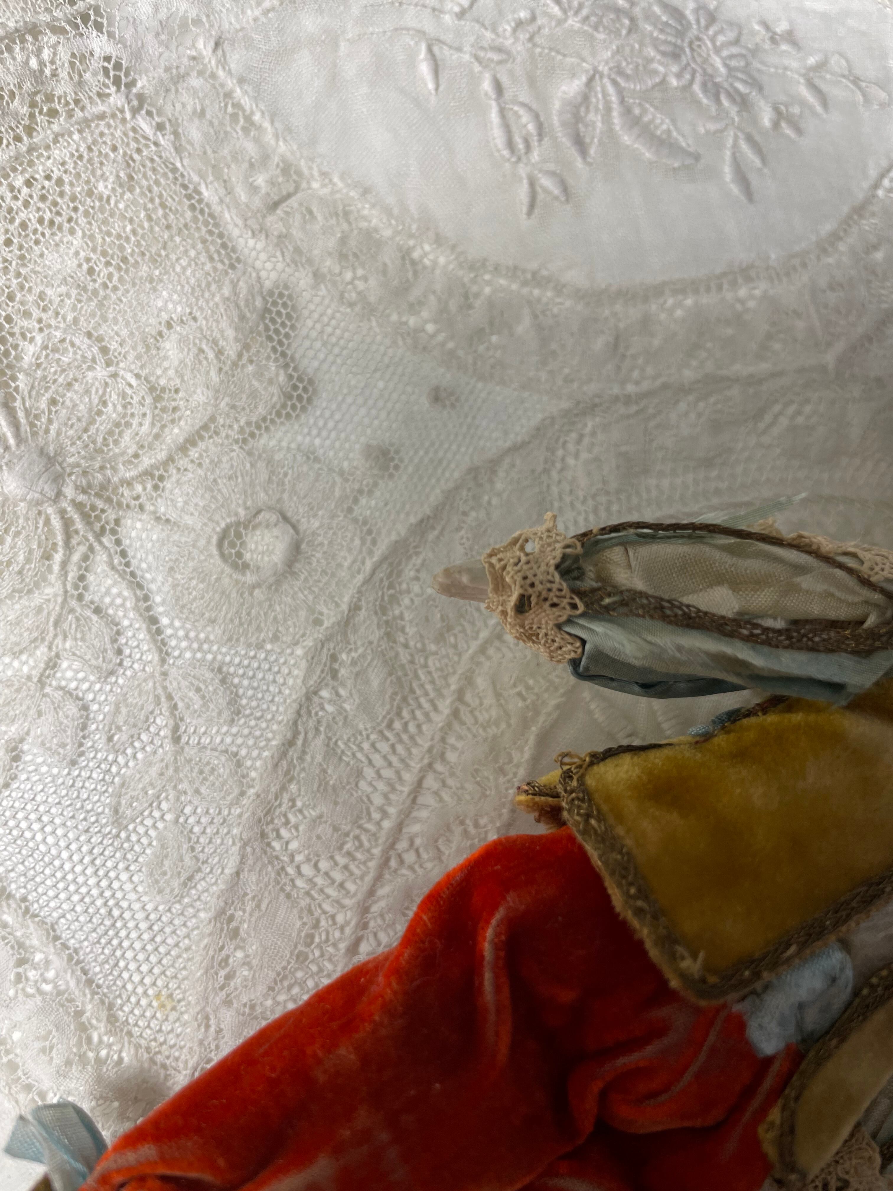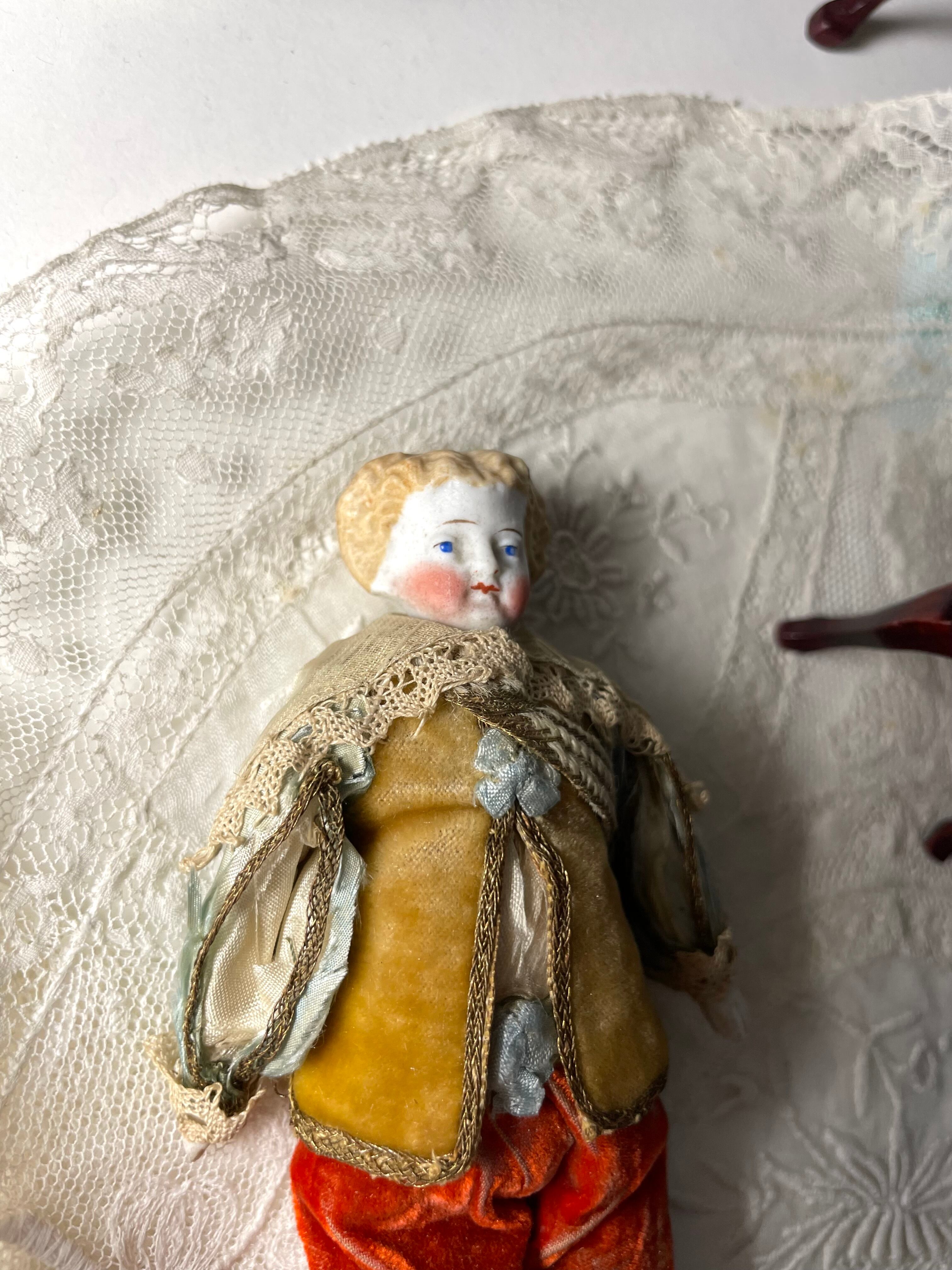 胴体は布製、腕や脚は磁器。衣装にはベロアやアンティークレースが使われており、時代を感じさせる佇まいが魅力的です。服はアンティークの経年の劣化が一部にございます。