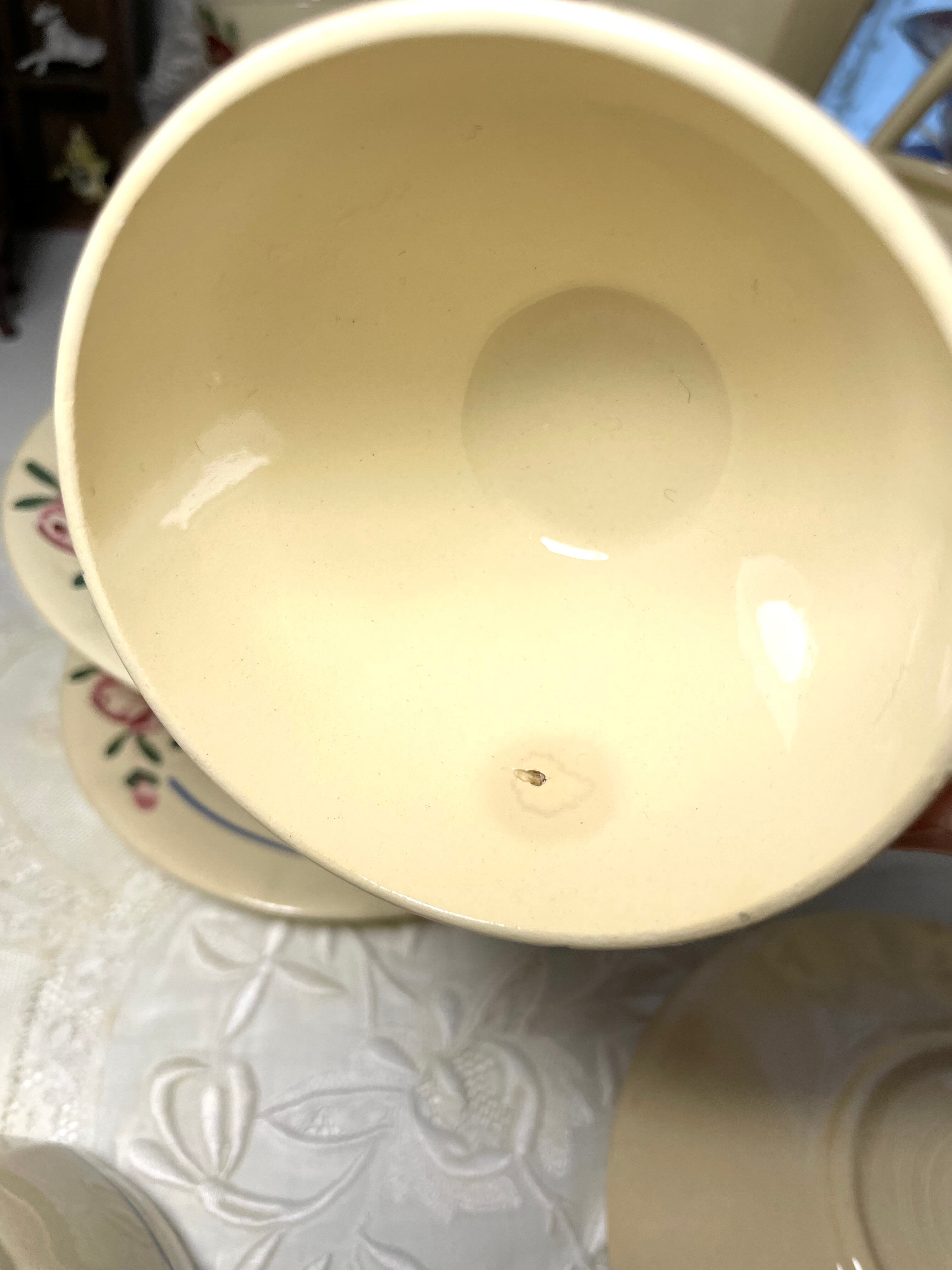 カップには製造時のカップ内側の凹み、粘土の剥がれのような箇所、ライン、欠け、などがあります。一つは持ち手の部分が修復されています。ソーサーは比較的綺麗です。