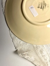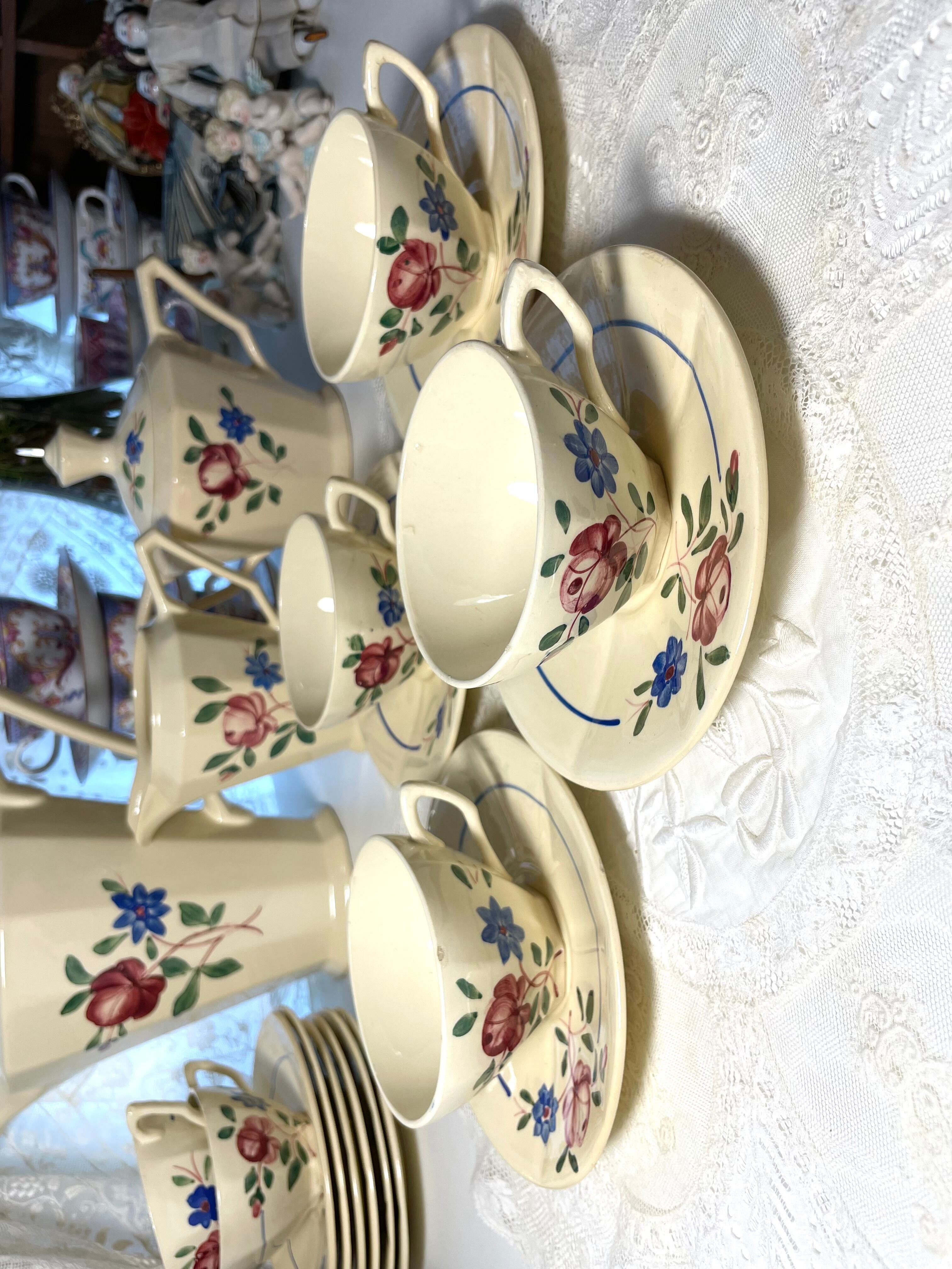 小さな欠け有り1点、製造時の変色のあるもの1点、釉薬の剥がれがあるもの2点、ソーサー2点は良い状態で、他1点は裏に欠けあり、1点、製造時の凹みありです。