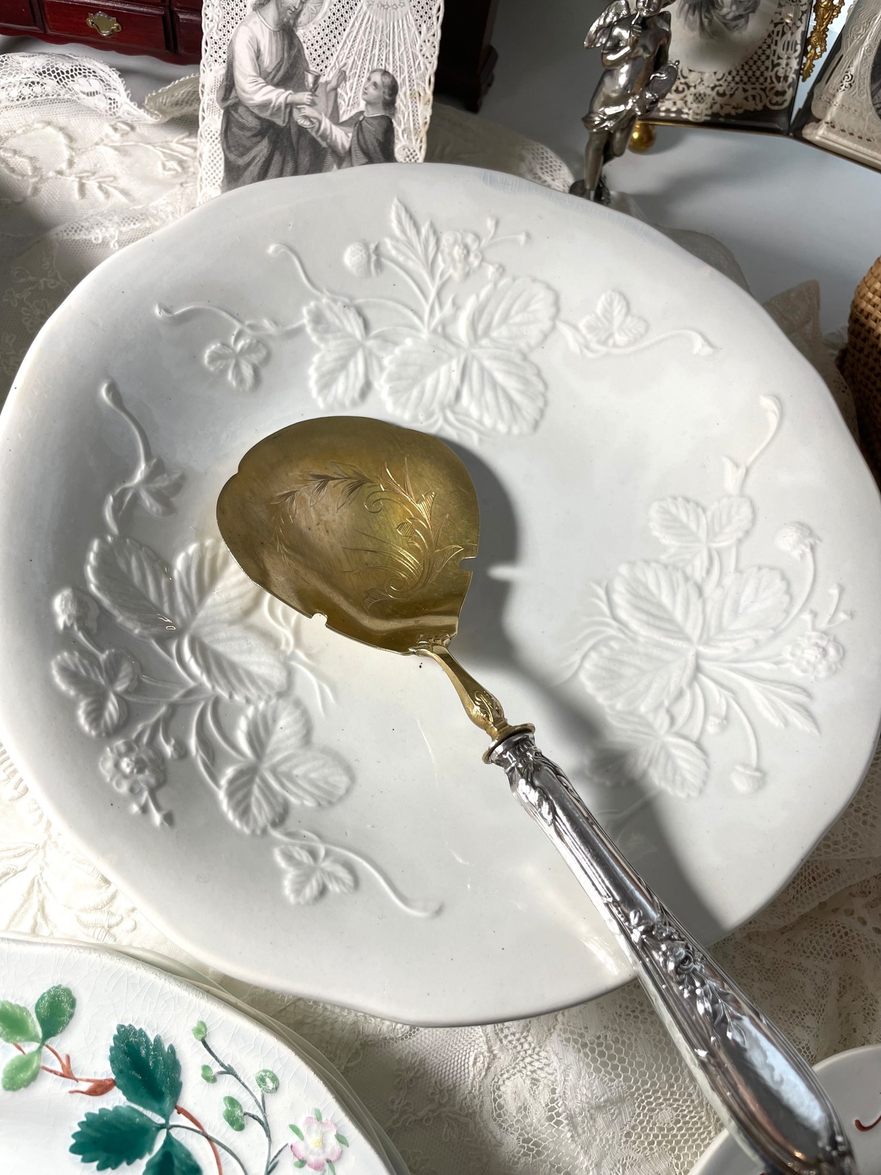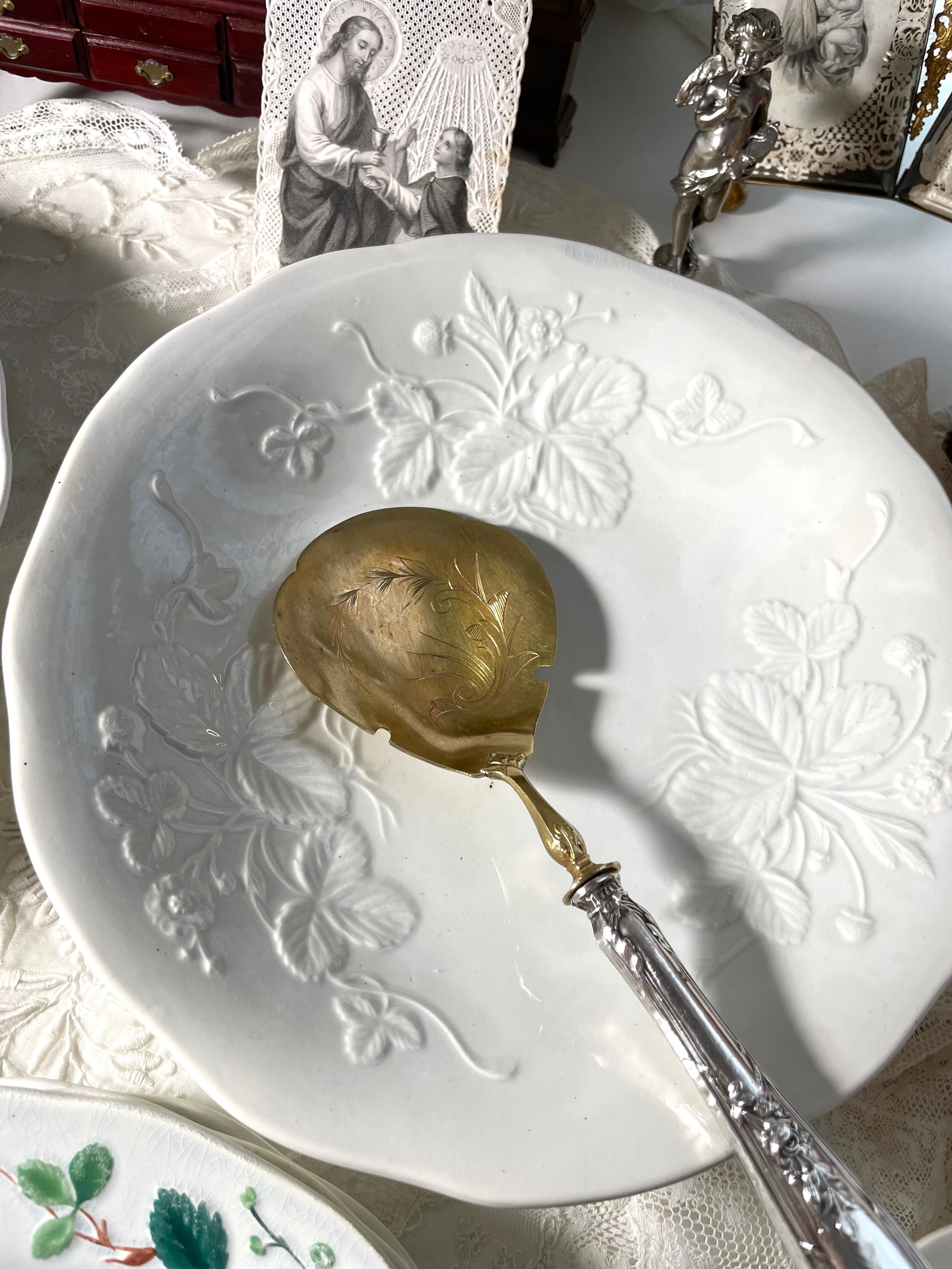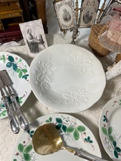 ショパンの恋人だった作家のジョルジュ・サンド(George Sand、1804~1876年)が愛用していたシリーズ。フランスでは「クレイユのジョルジュ・サンド」と呼ばれます。色付きのものが多い中、こちらは白磁のレリーフのエレガントなコンポティエ。クレイユモントロー特有の少し、水色がかった釉薬のニュアンスの美しい作品です。