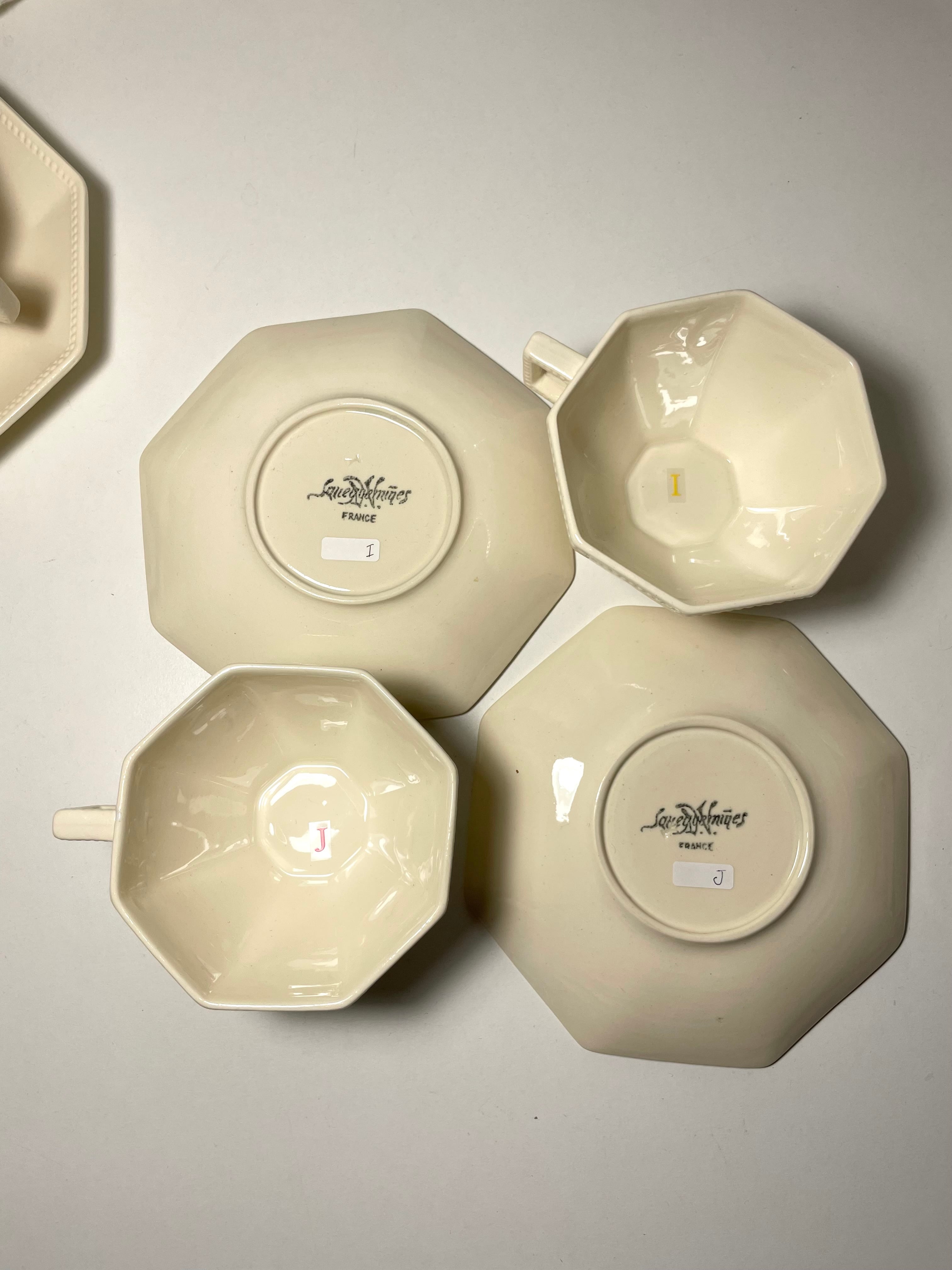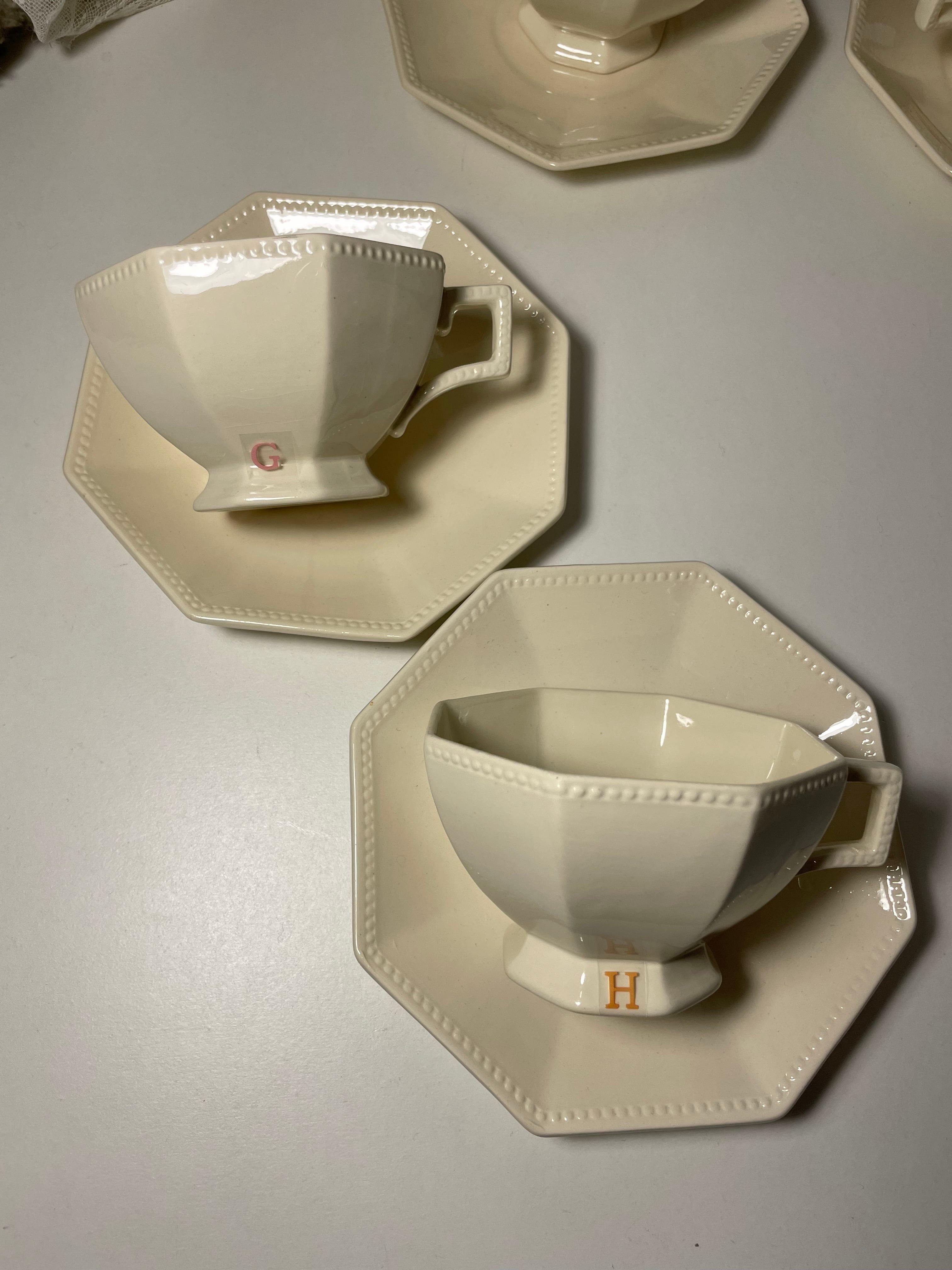 サルグミンヌ窯のオクトゴナル。クレイユ・モントローに比べると、やさしく色調も質感も柔らかくエレガントな雰囲気です。こちらは希少なティーカップです。