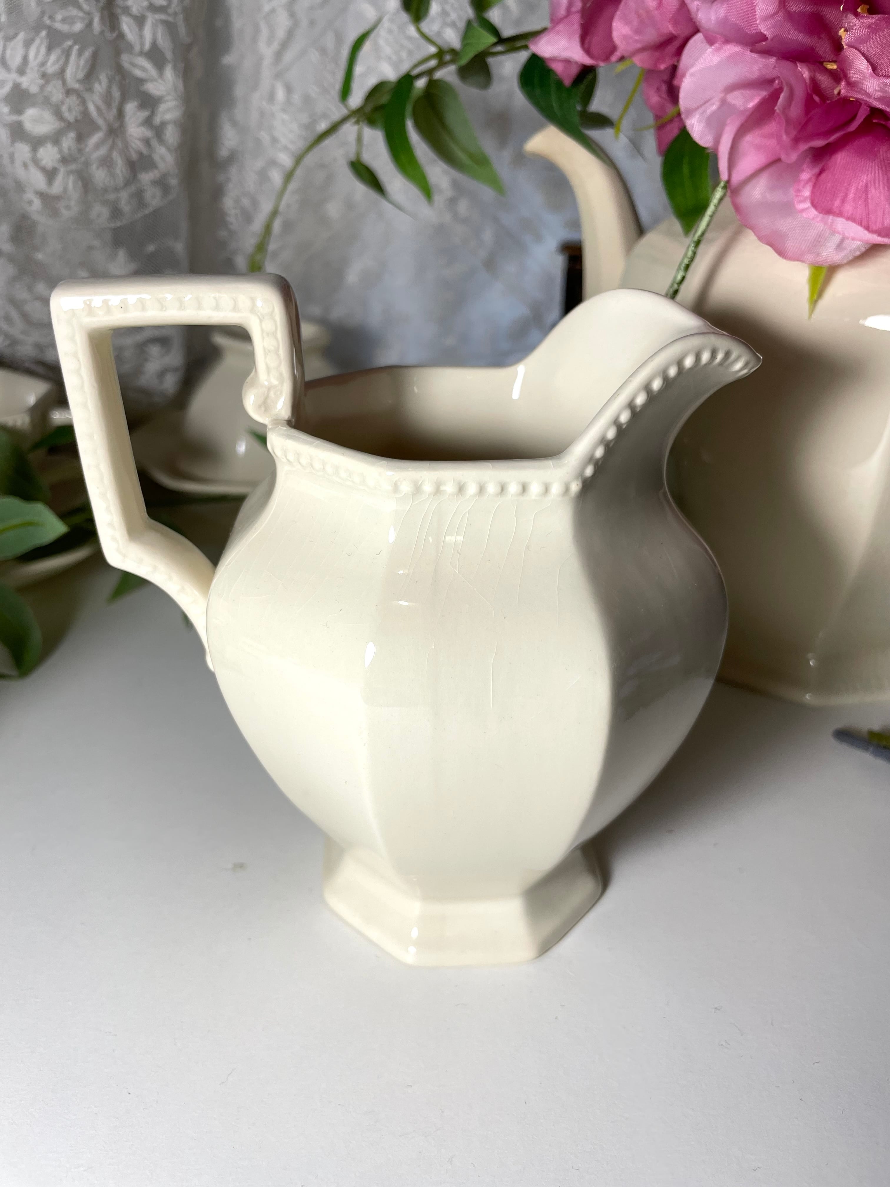サルグミンヌのオクトゴナルのミルクピッチャー。象牙色の色合いと縁に入ったパールの装飾がエレガントです。