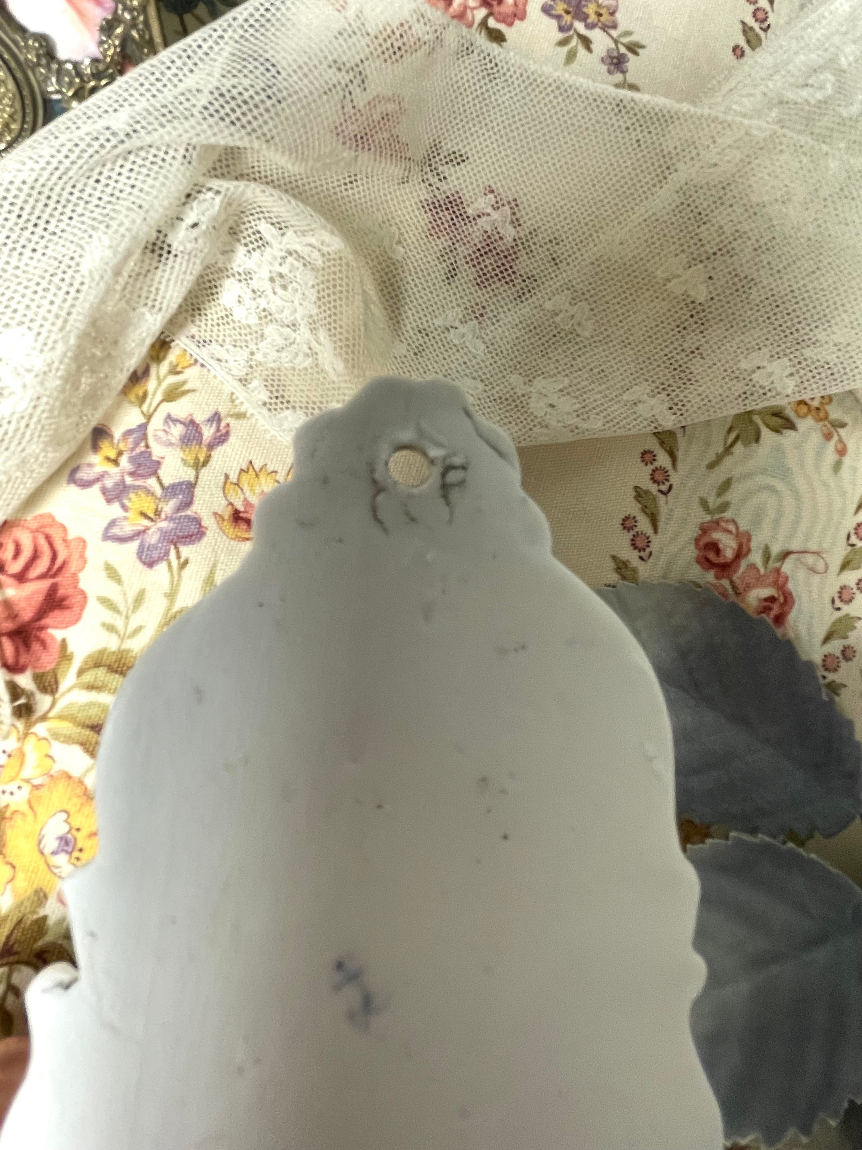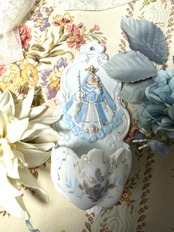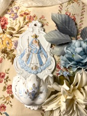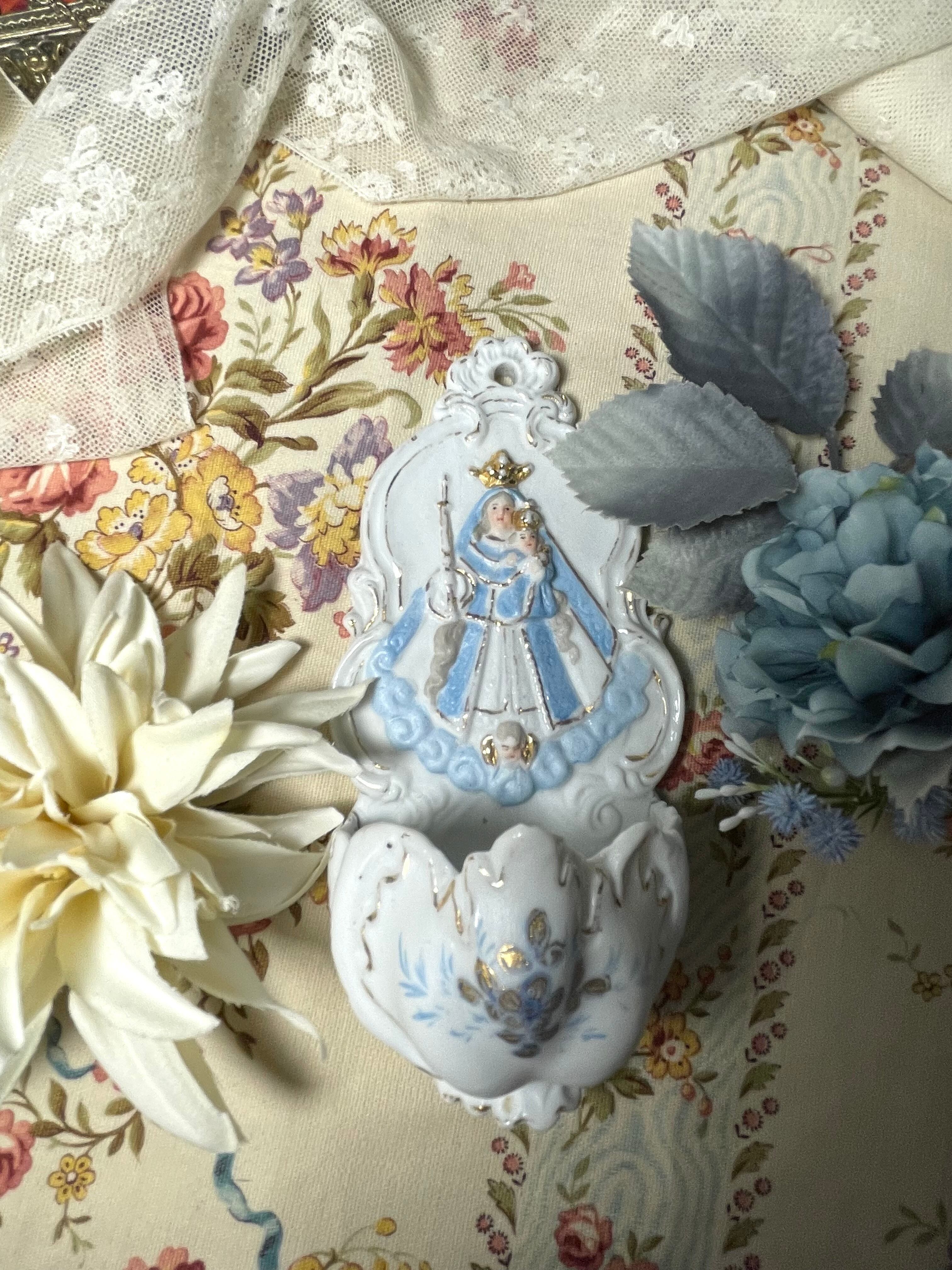 ビスクならではの、清々しい素焼きに美しく手画きで色付けされた、聖水を溜めるに相応しい佇まいの逸品です。