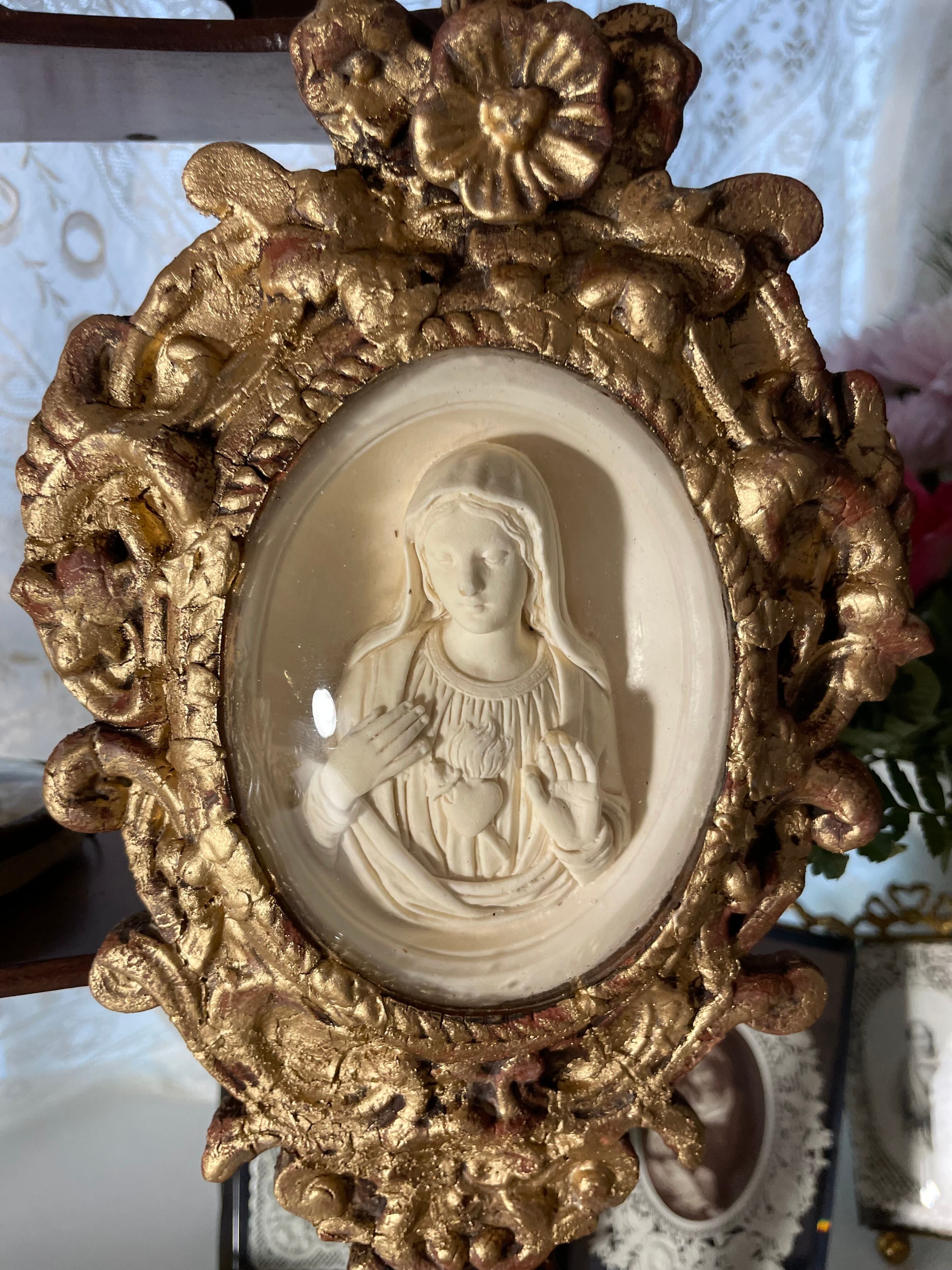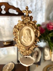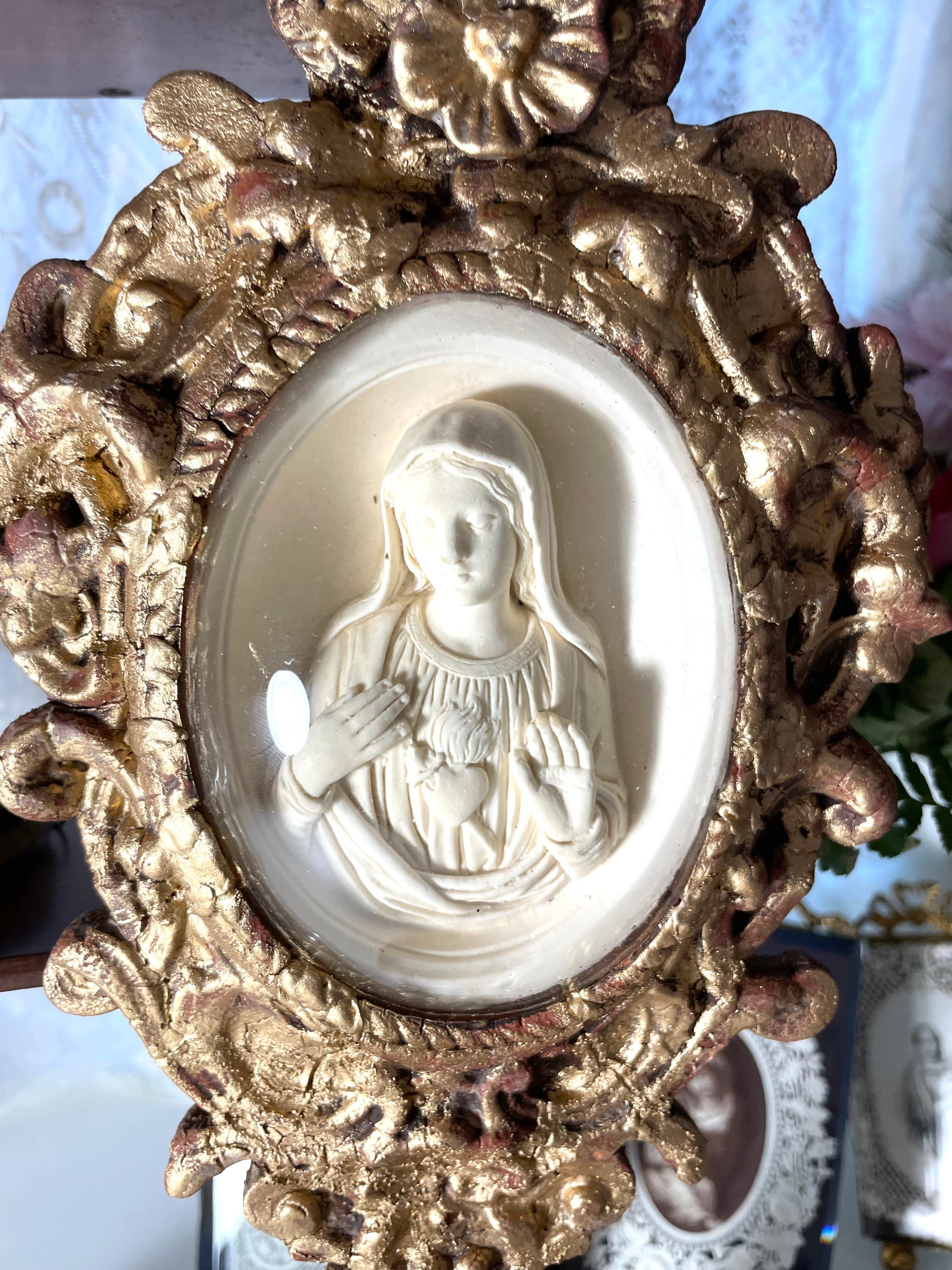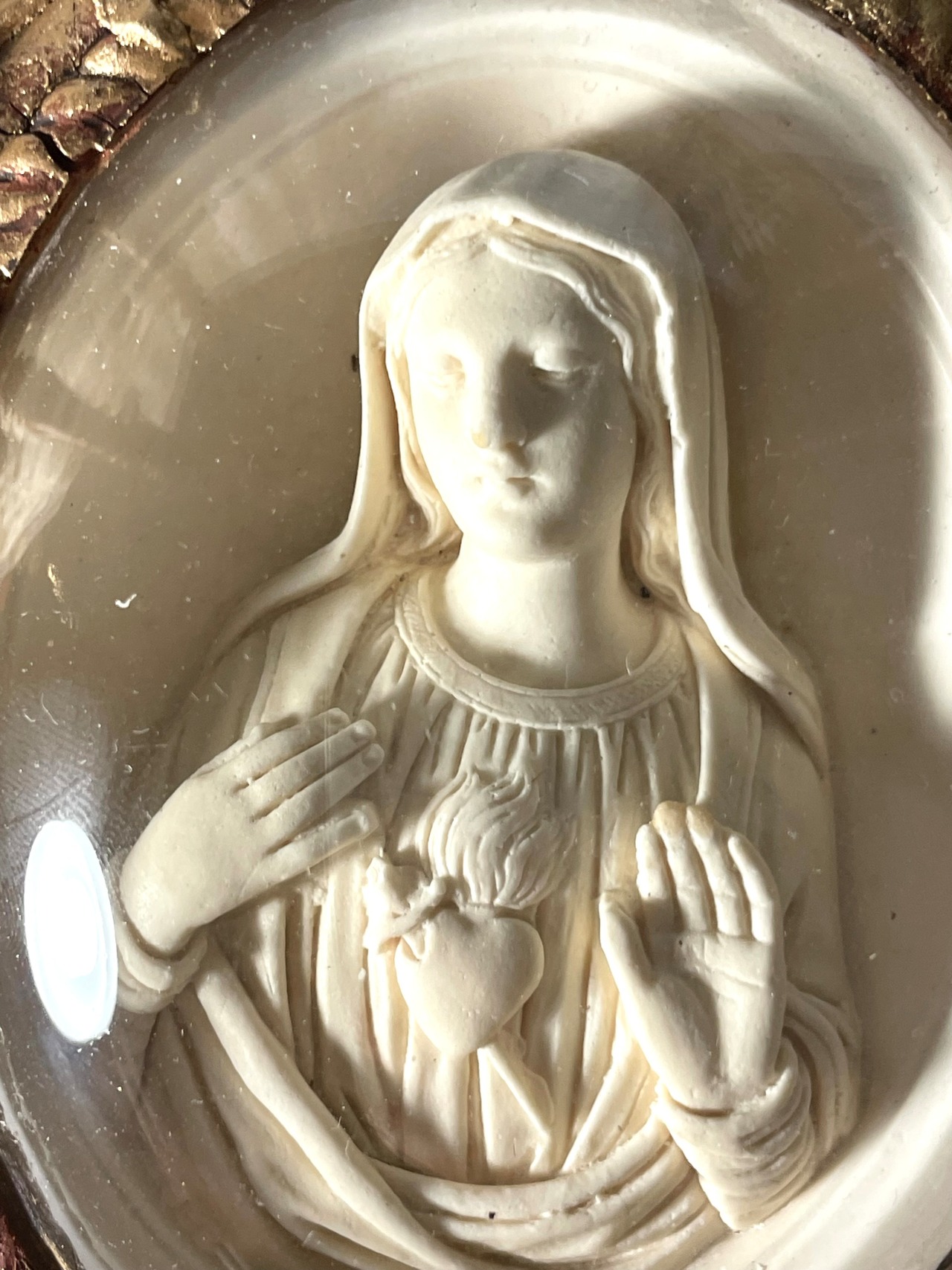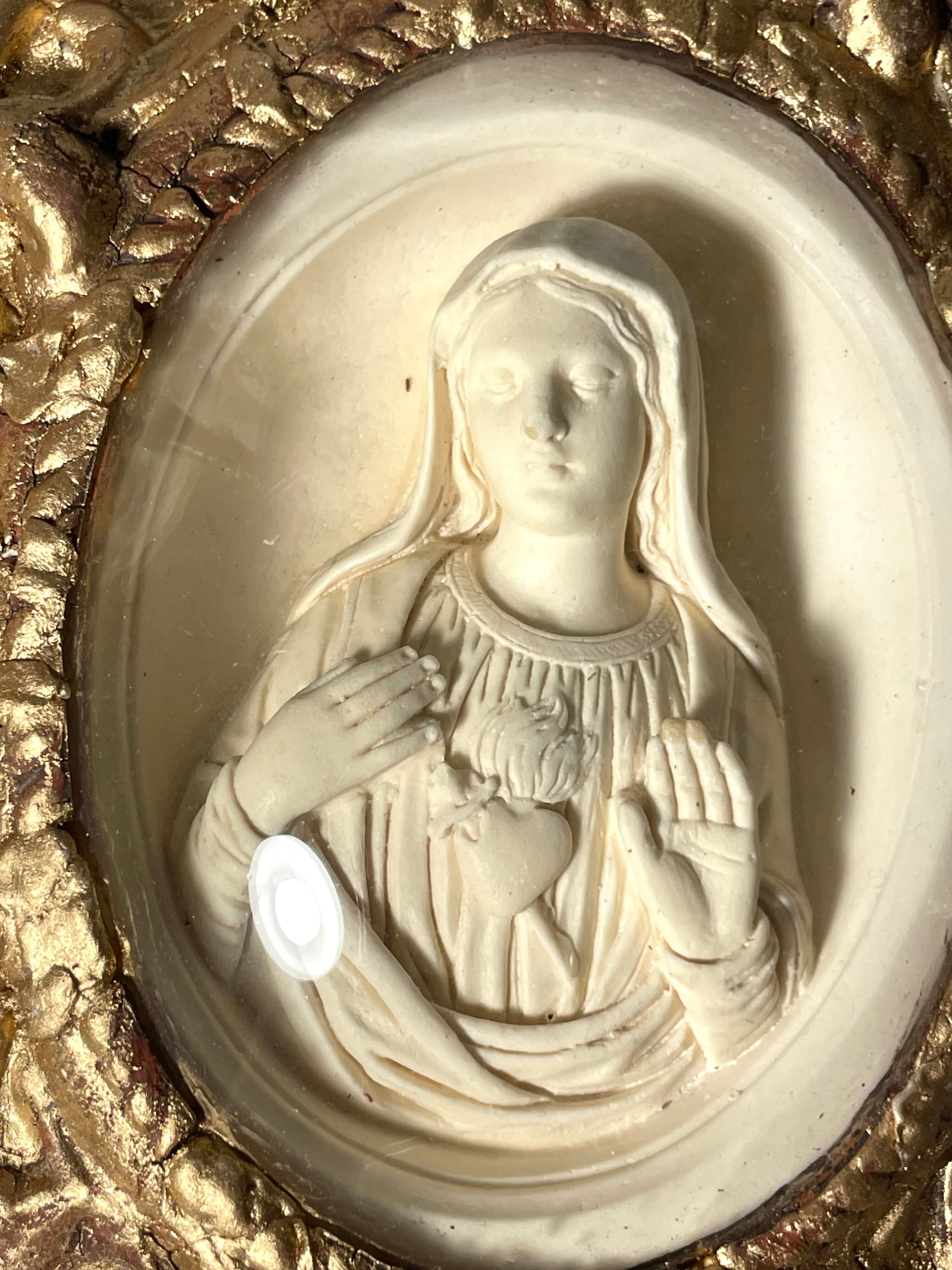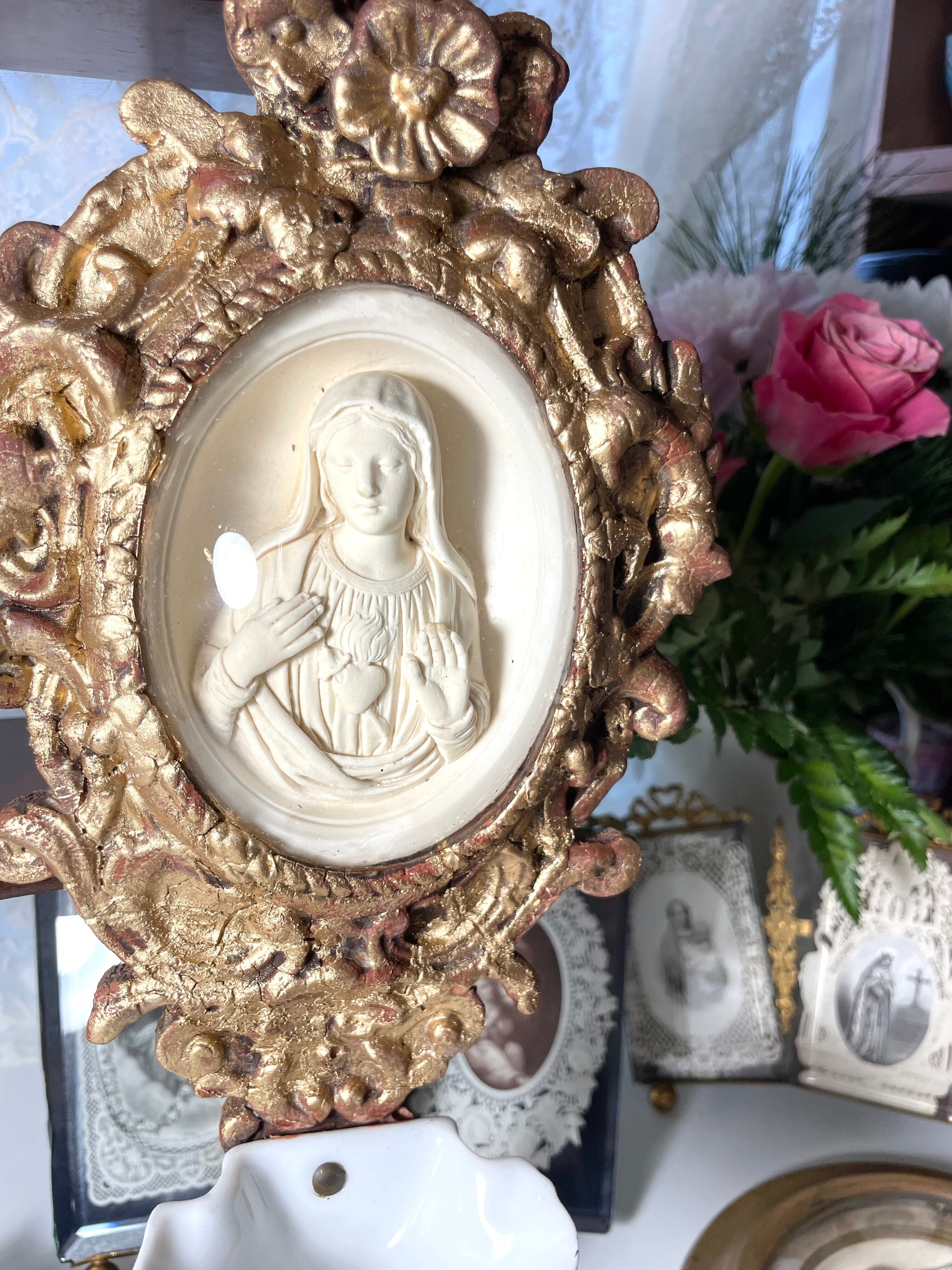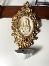 マリア像のせっこう彫刻を収めたドーム入りメダイヨンの聖水盤です。