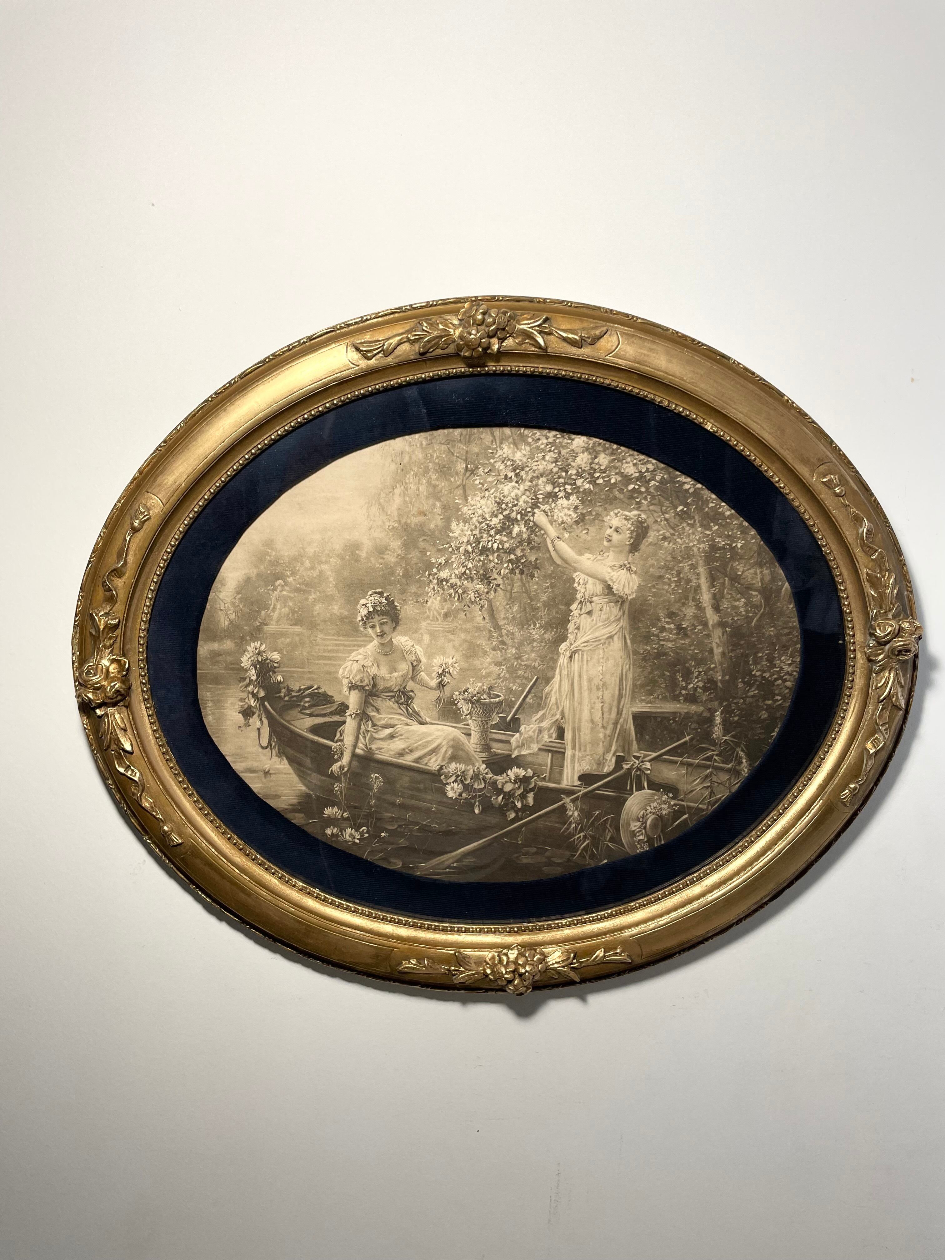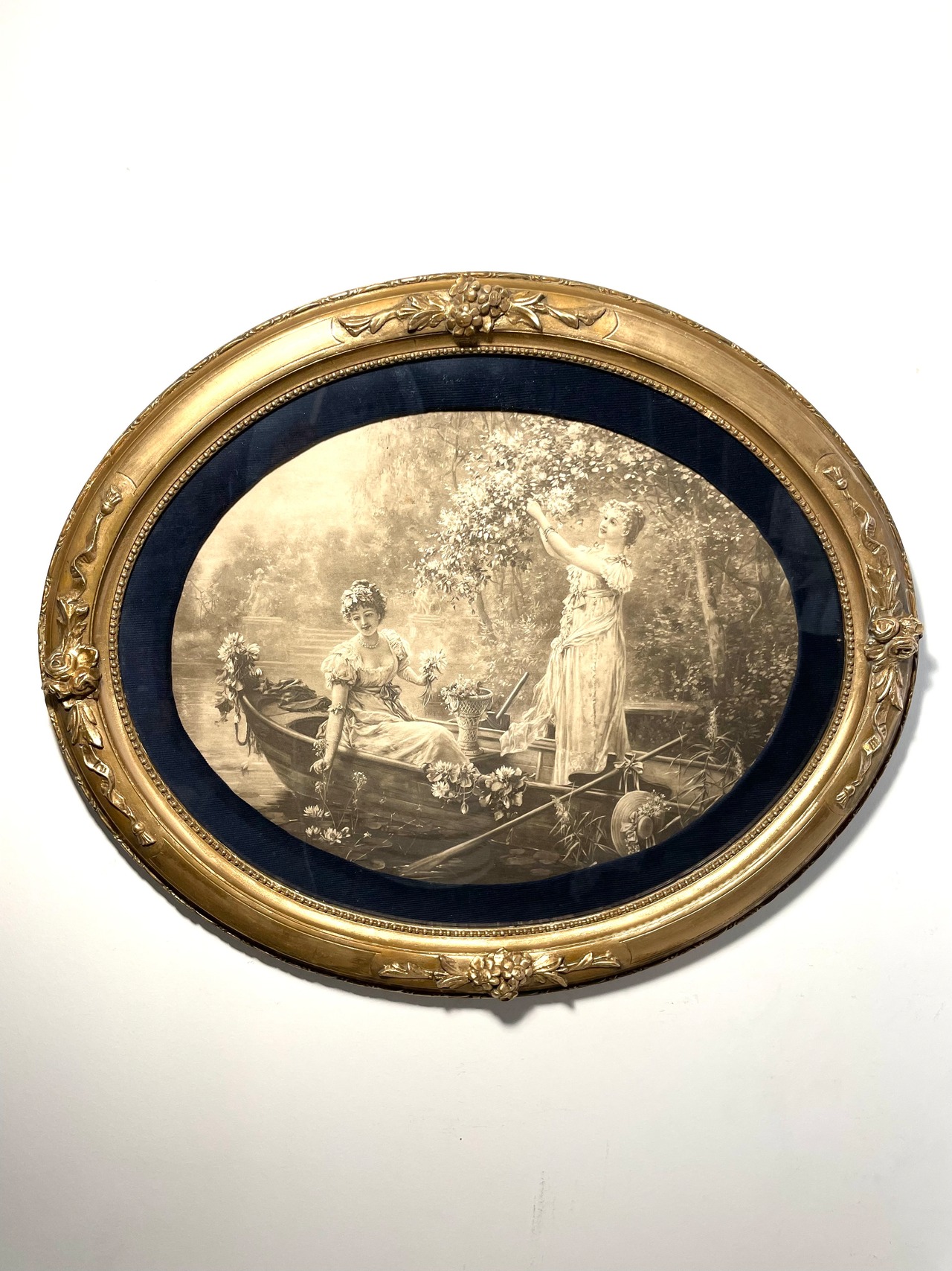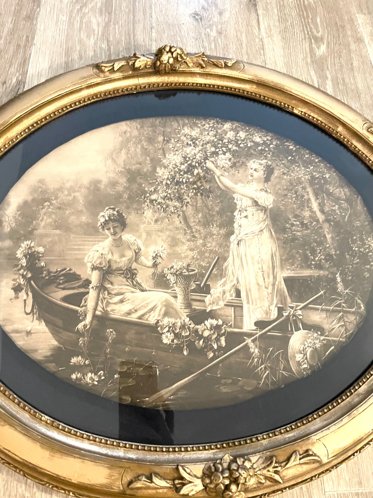 穏やかな水辺に舟と二人の女性を描いた、ロマンティックで優雅な雰囲気の一枚。