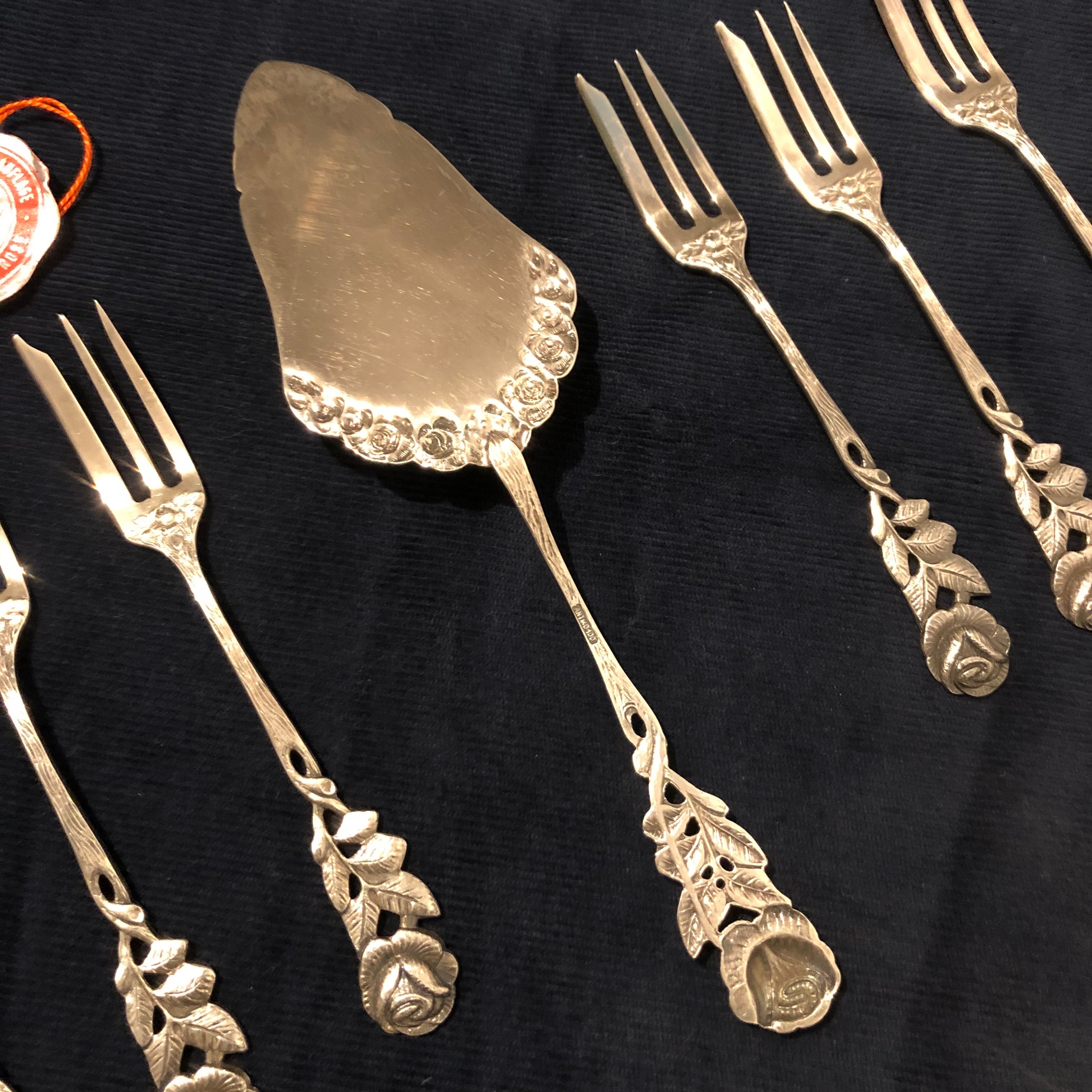 ケーキサーバーと、ケーキ用フォーク6本セットの銀食器です。
