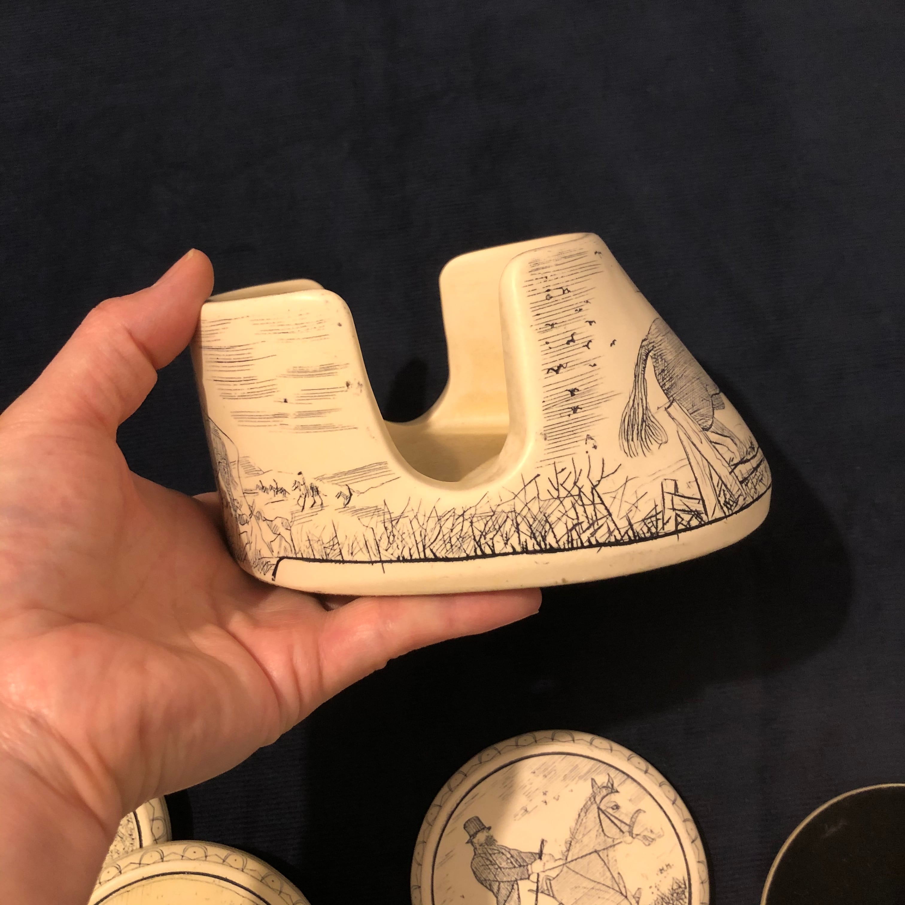 陶器で、しっかりとした手触りの、裏面がベロアでテーブルを傷つけない、作りになっております。デッサンが一枚づつ異なります。デコレーションにも良いと思います!