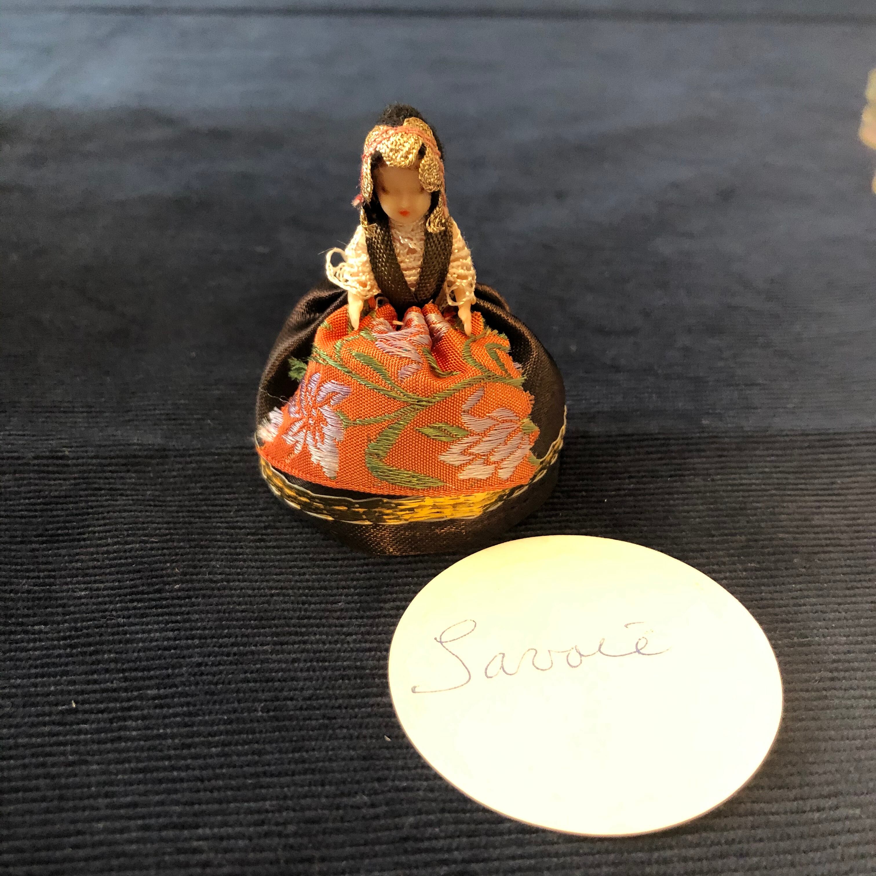 一つ一つにノルマンディー、チェコスロバキア、アルザス、バスク等地名が入っています。ケース付きですが、いくつかヒビや欠けが有ります。お店で売っていただいても、コレクションしていただいても良いのではないかと思います。衣装の素敵なミニチュアドールです!