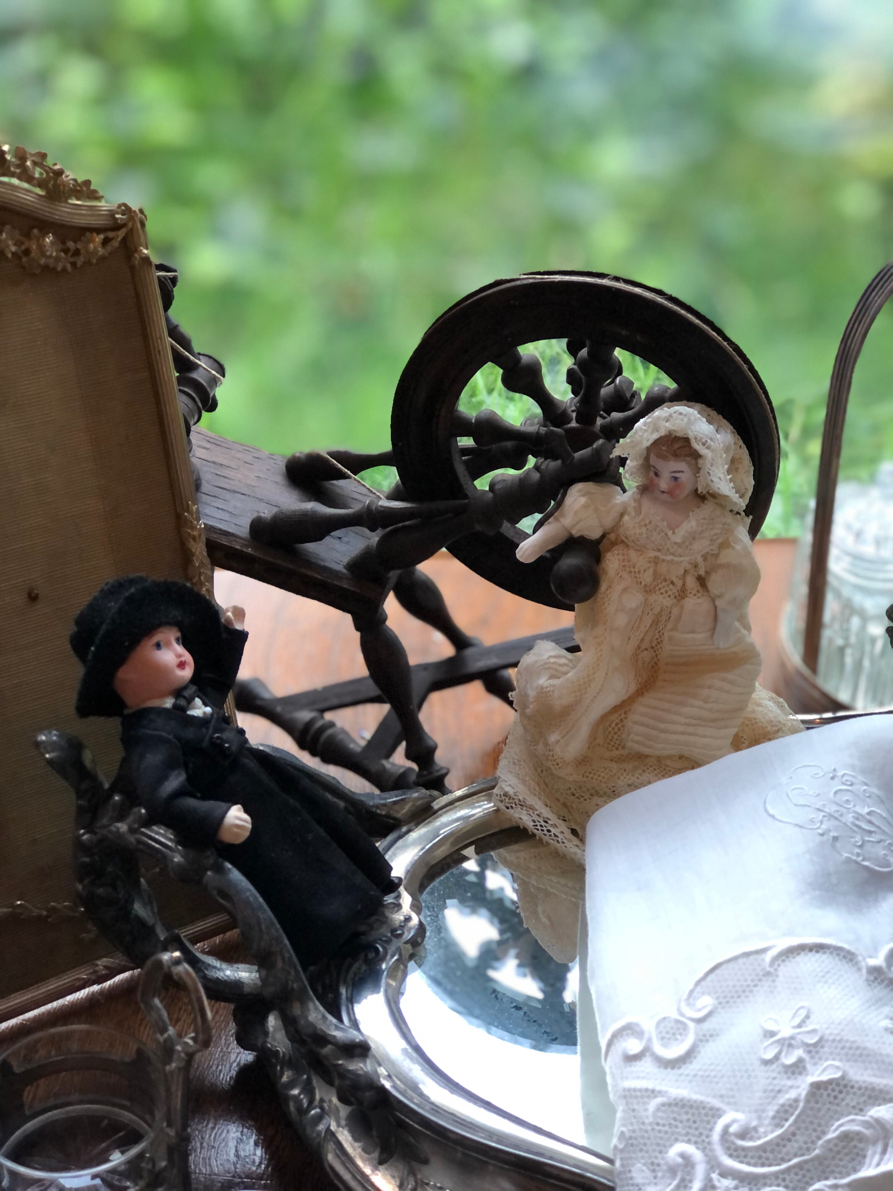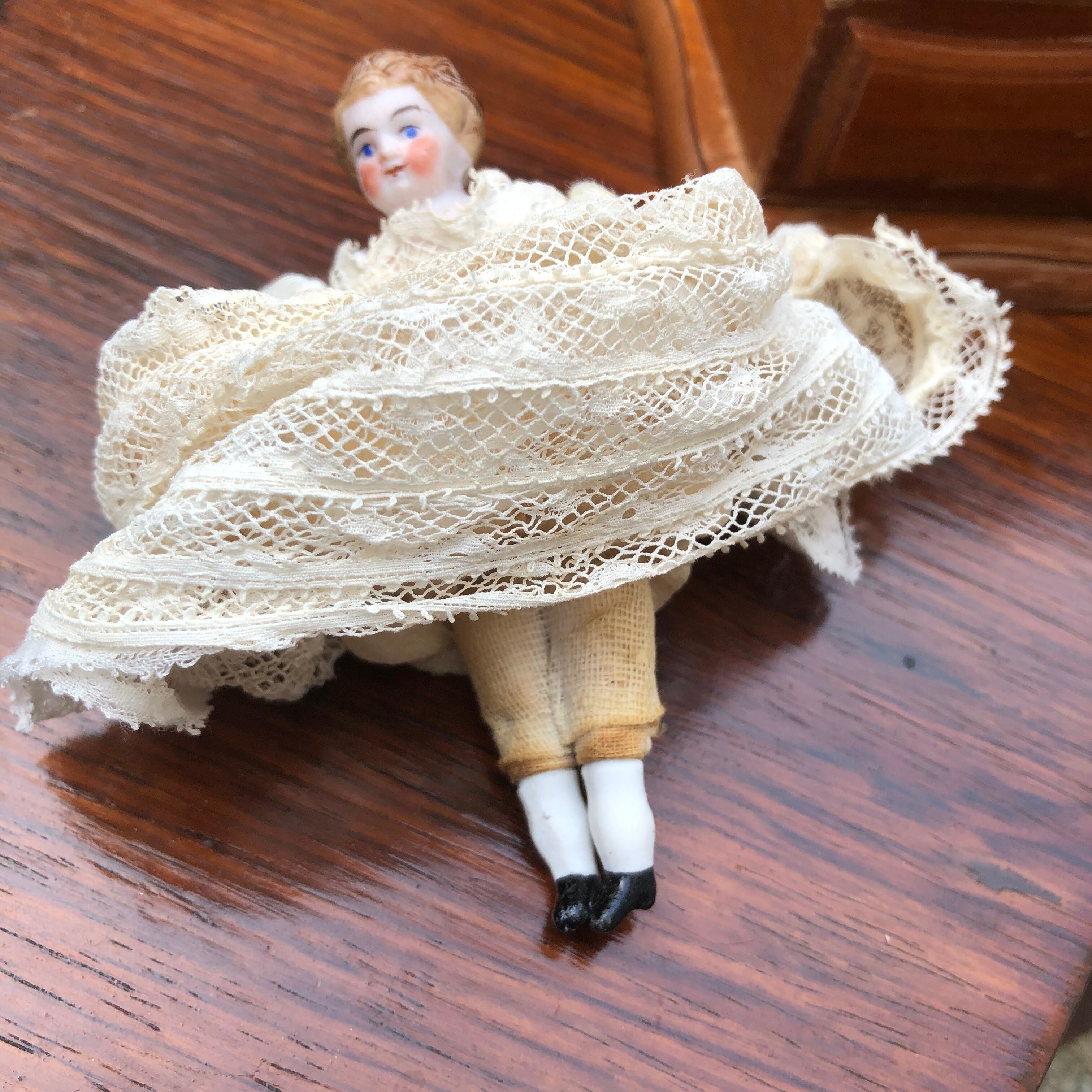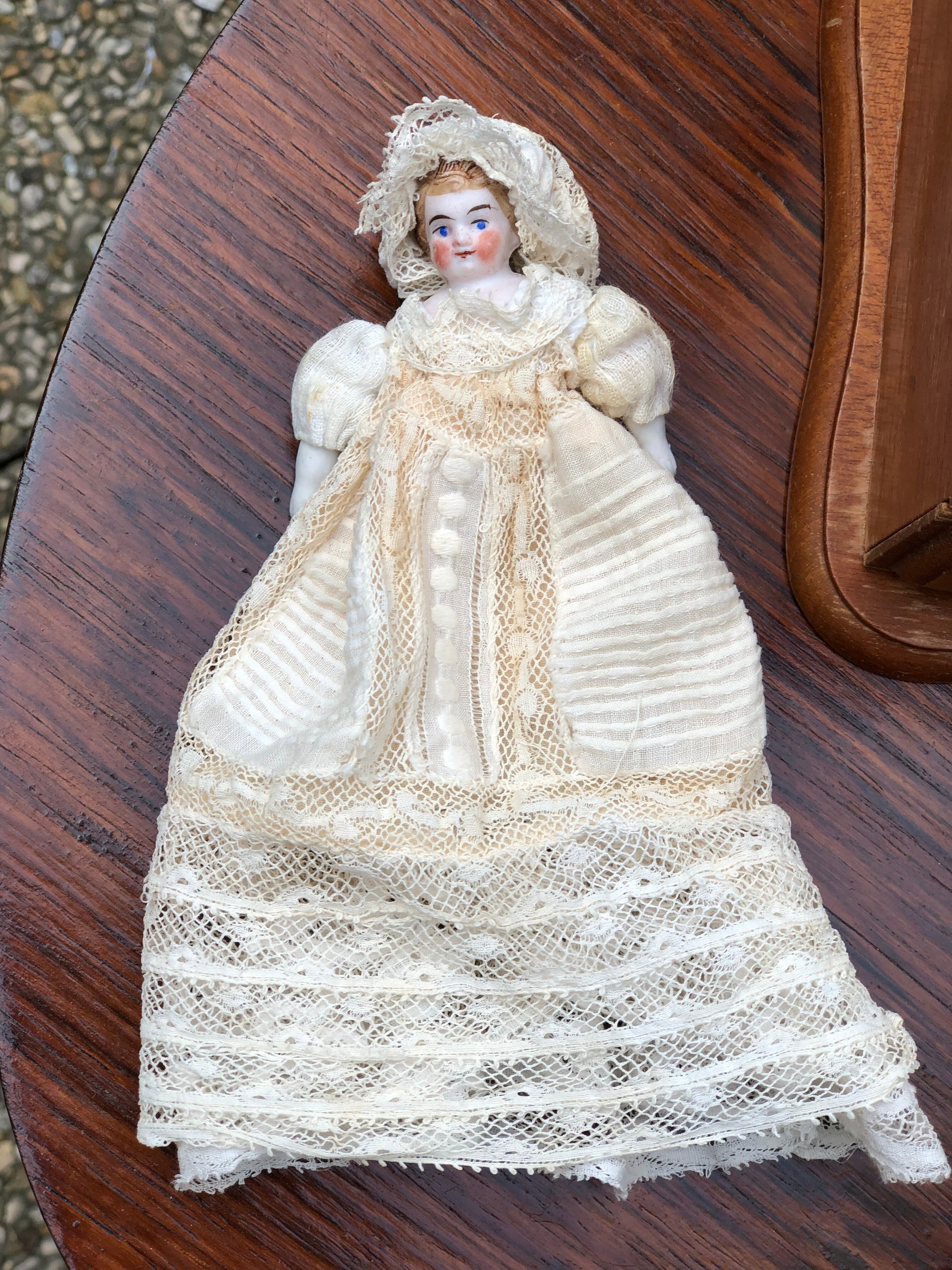 美しいドレスを着たミニチュアのビスクドールさんです。