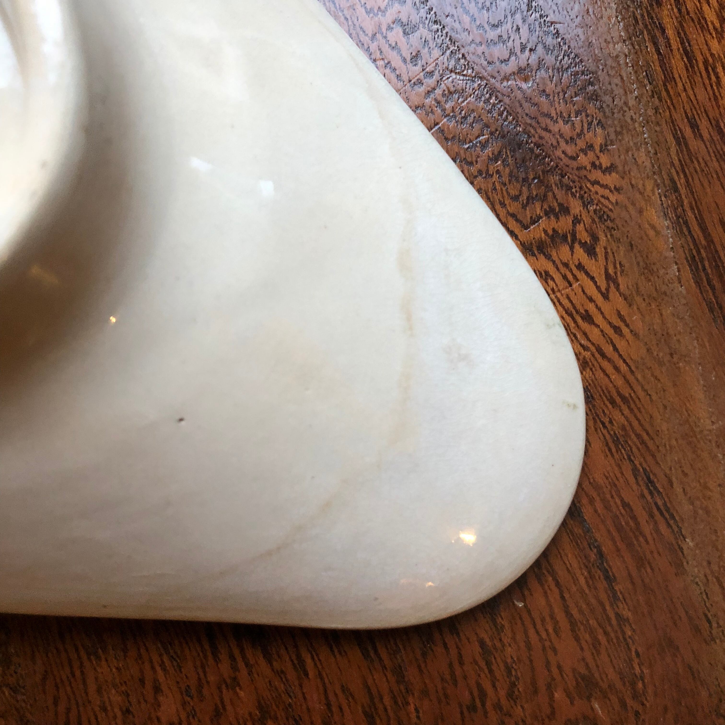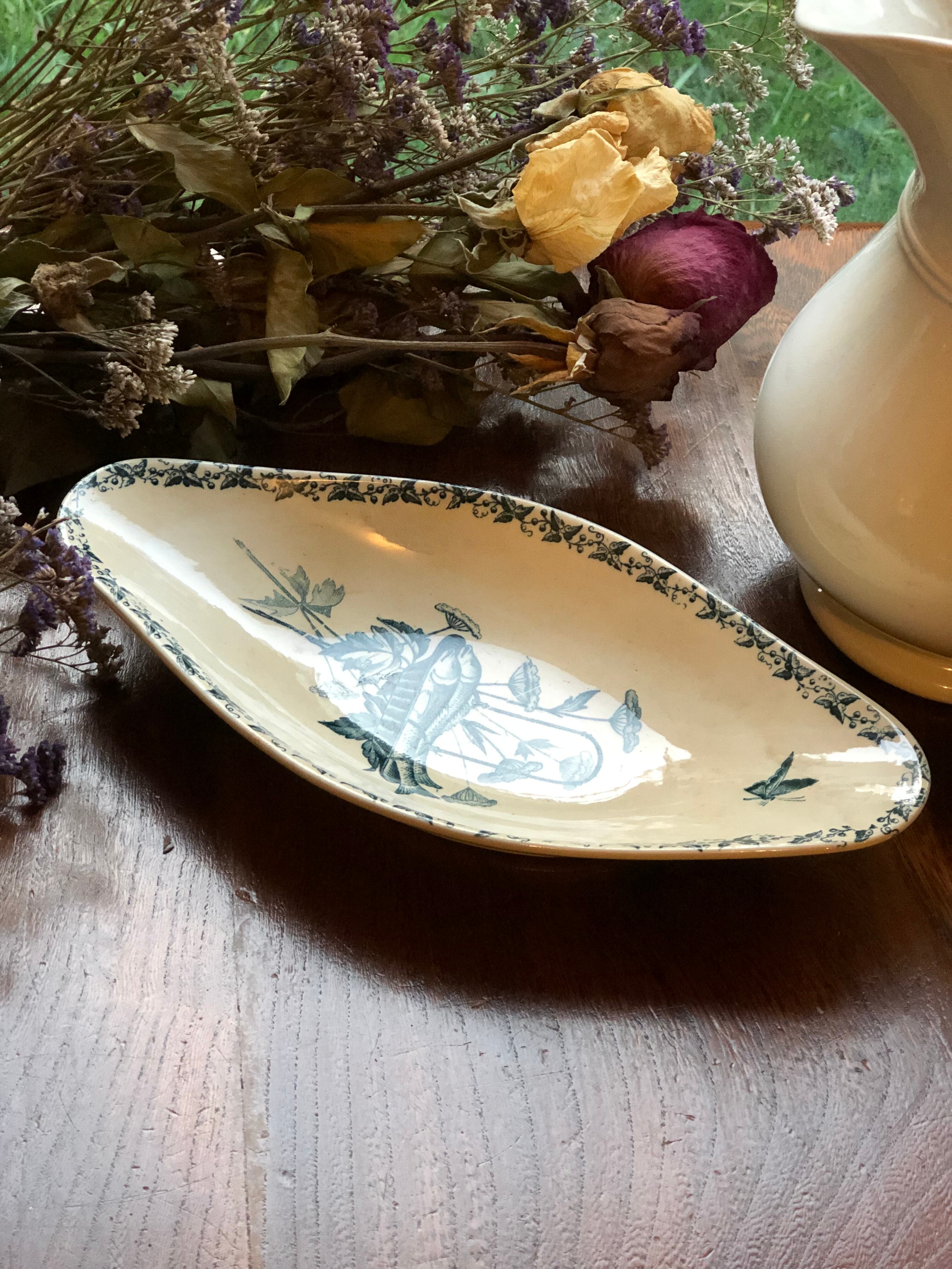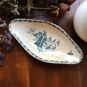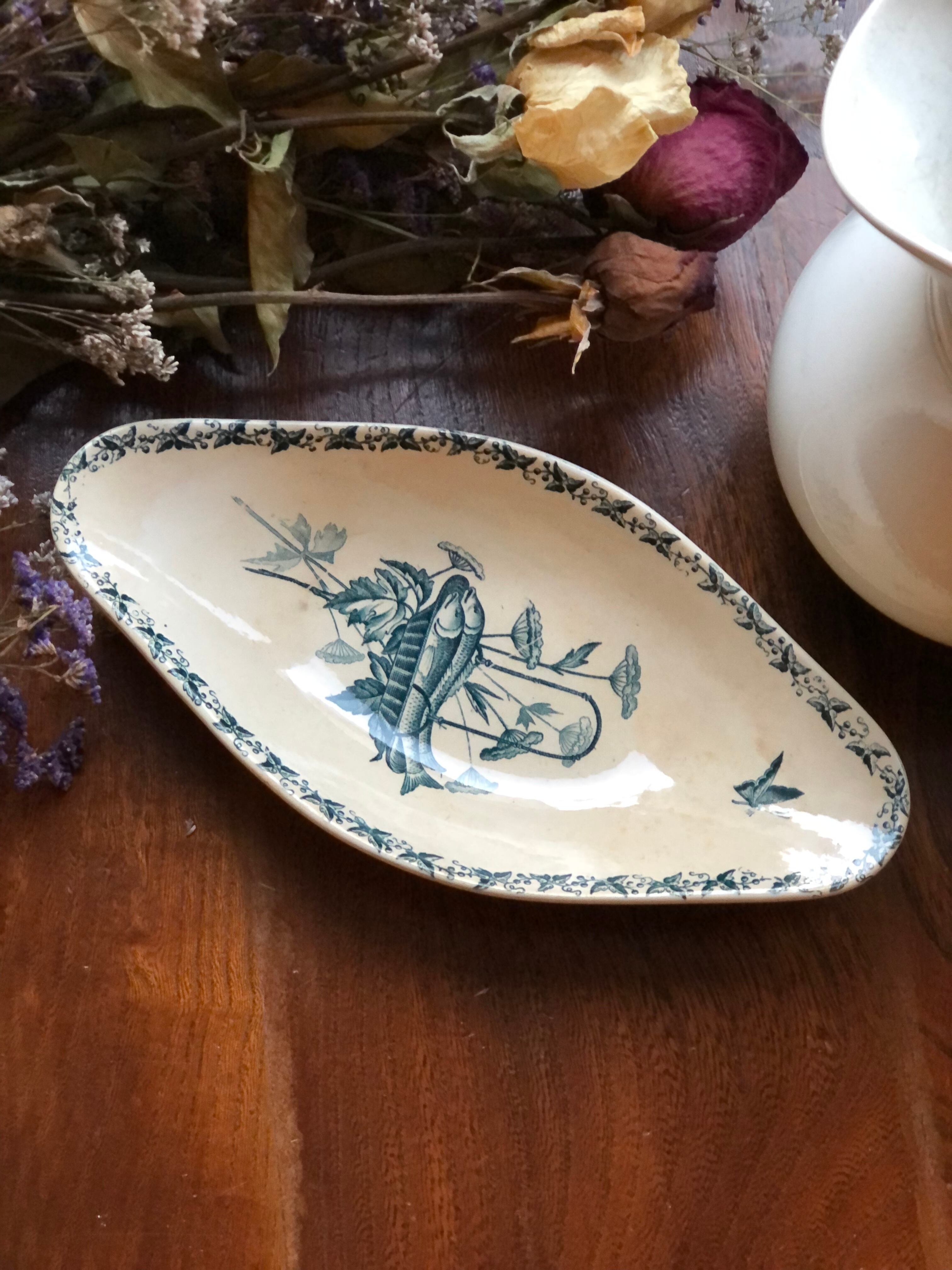 縁を飾るレリーフが美しく、中央のカゴに入った魚もレアなモチーフでユニークです。