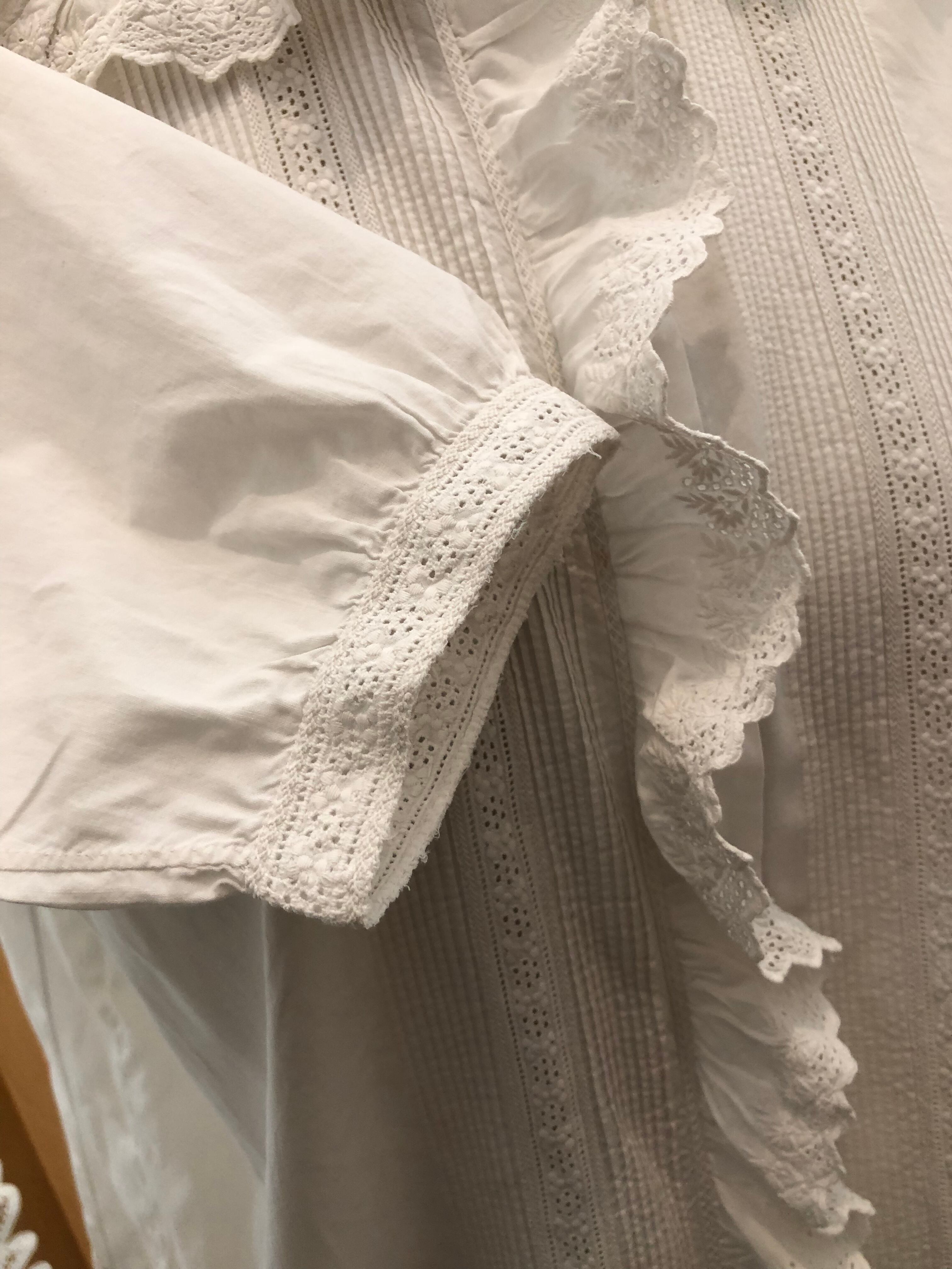 フリル襟の素敵なモノグラム 刺繍の入ったヴィクトリアン ブラウスです。たっぷり入った、大変小さなピンタックと大きなお襟のデザインが素敵です。