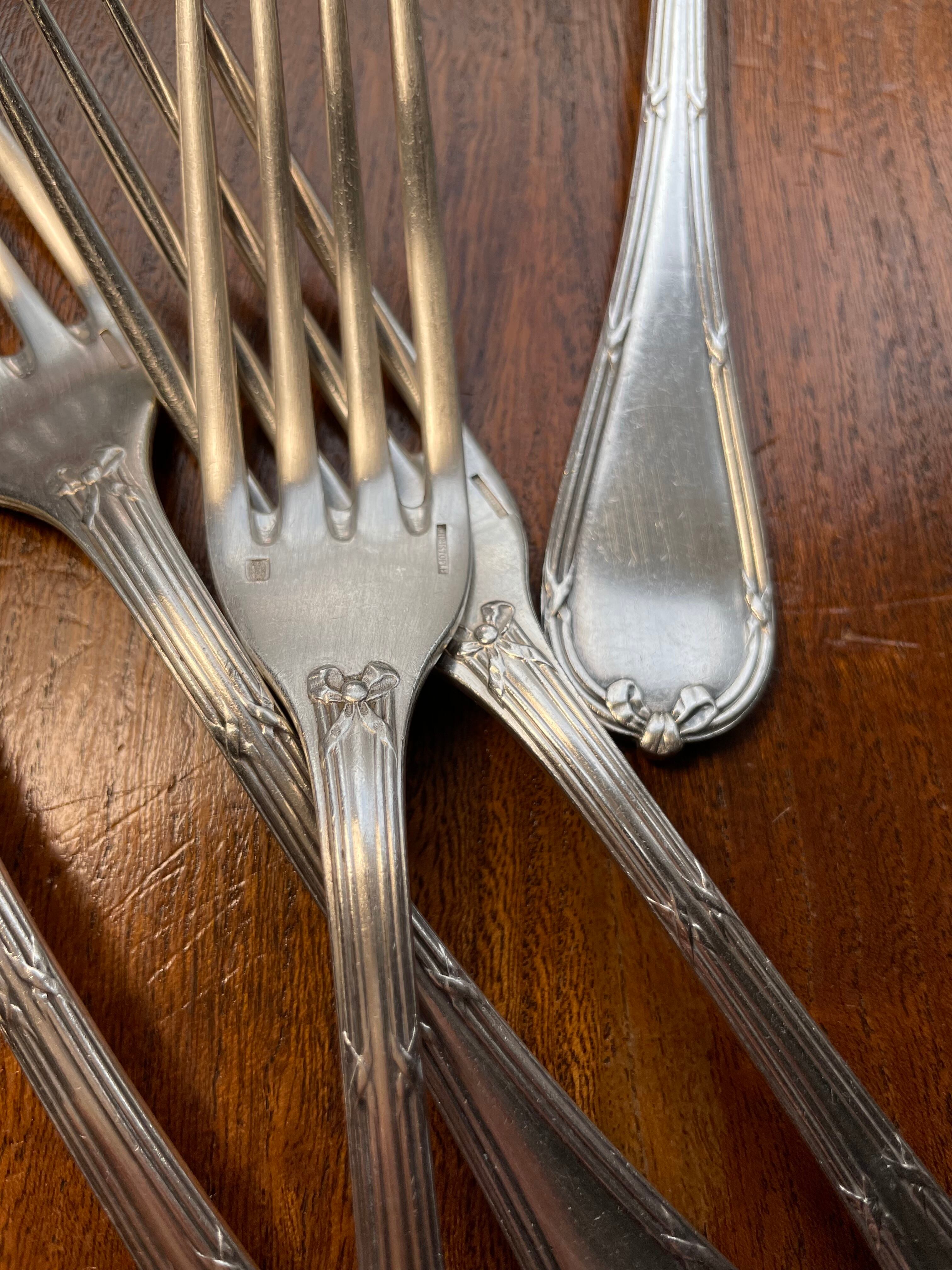 フランスのカトラリーらしく、しっかりしたボリューム感や、厚みのある造り、鮮やかなシルバープレートの輝きに、伝統に裏打ちされた自信が滲むような、美しいカトラリーです。