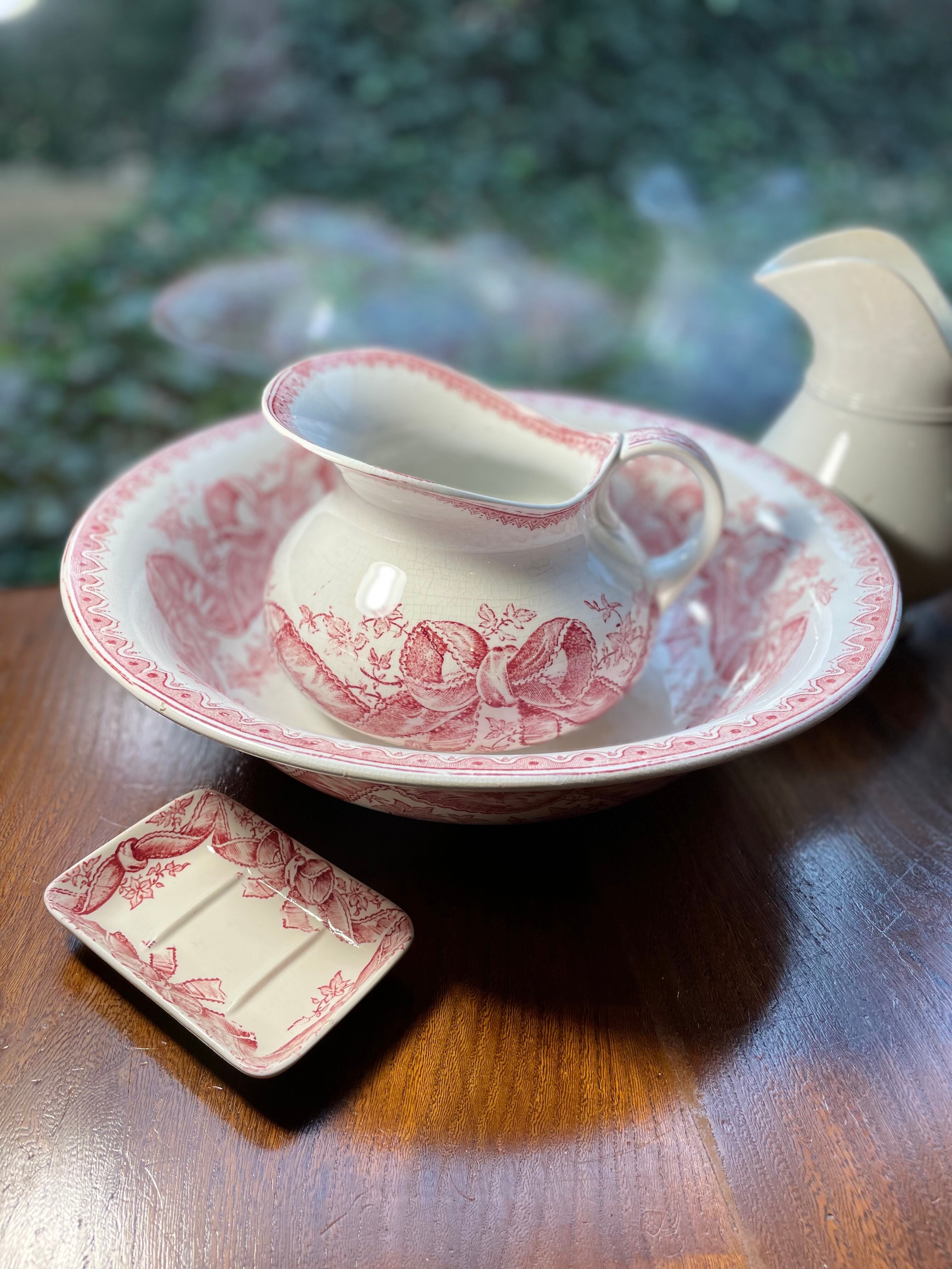 ref : 1246 アンティーク・Sarreguemines ROSETTE ピシェとベイスンとポルトサヴォンのセット