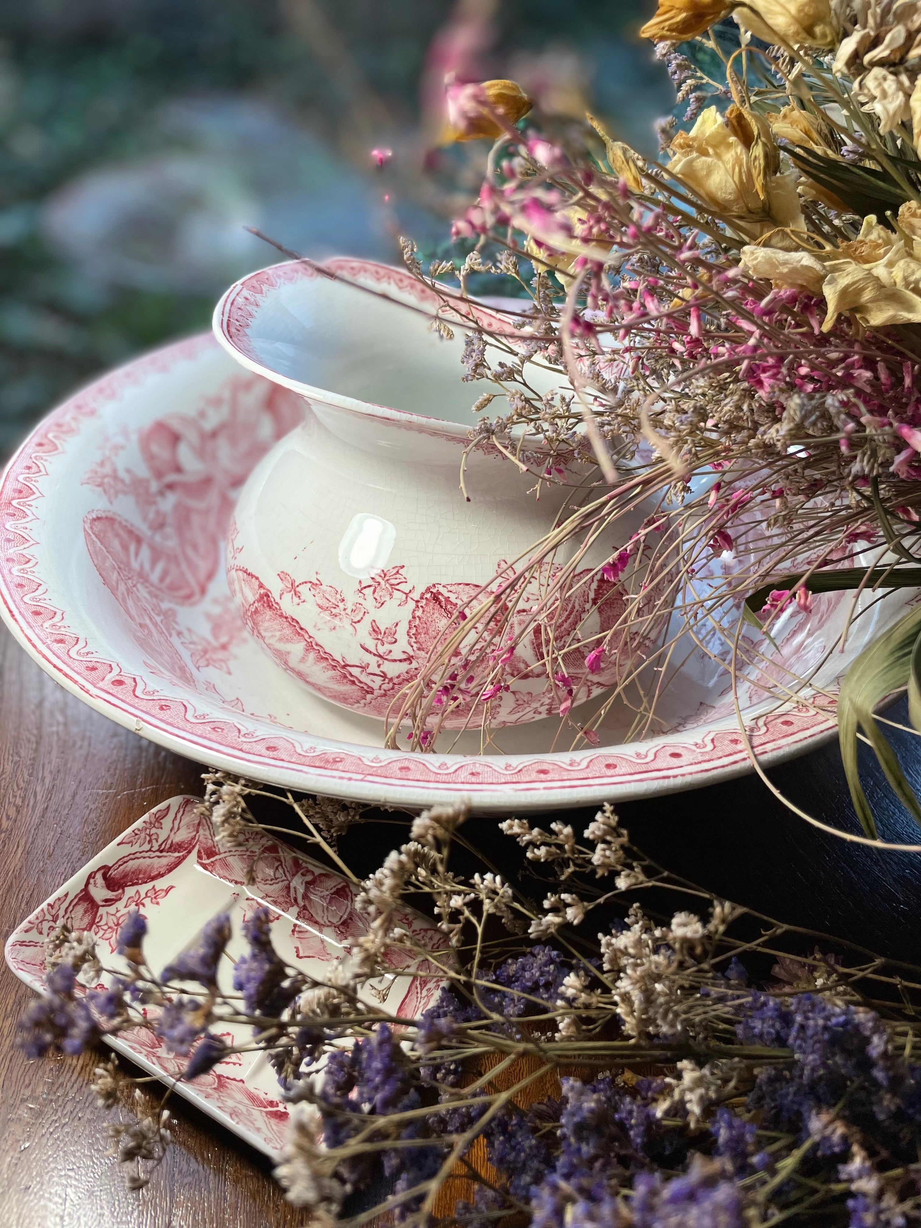 【送料込み表示】ref : 1246 アンティーク・Sarreguemines ROSETTE ピシェとベイスンとポルトサヴォンのセット