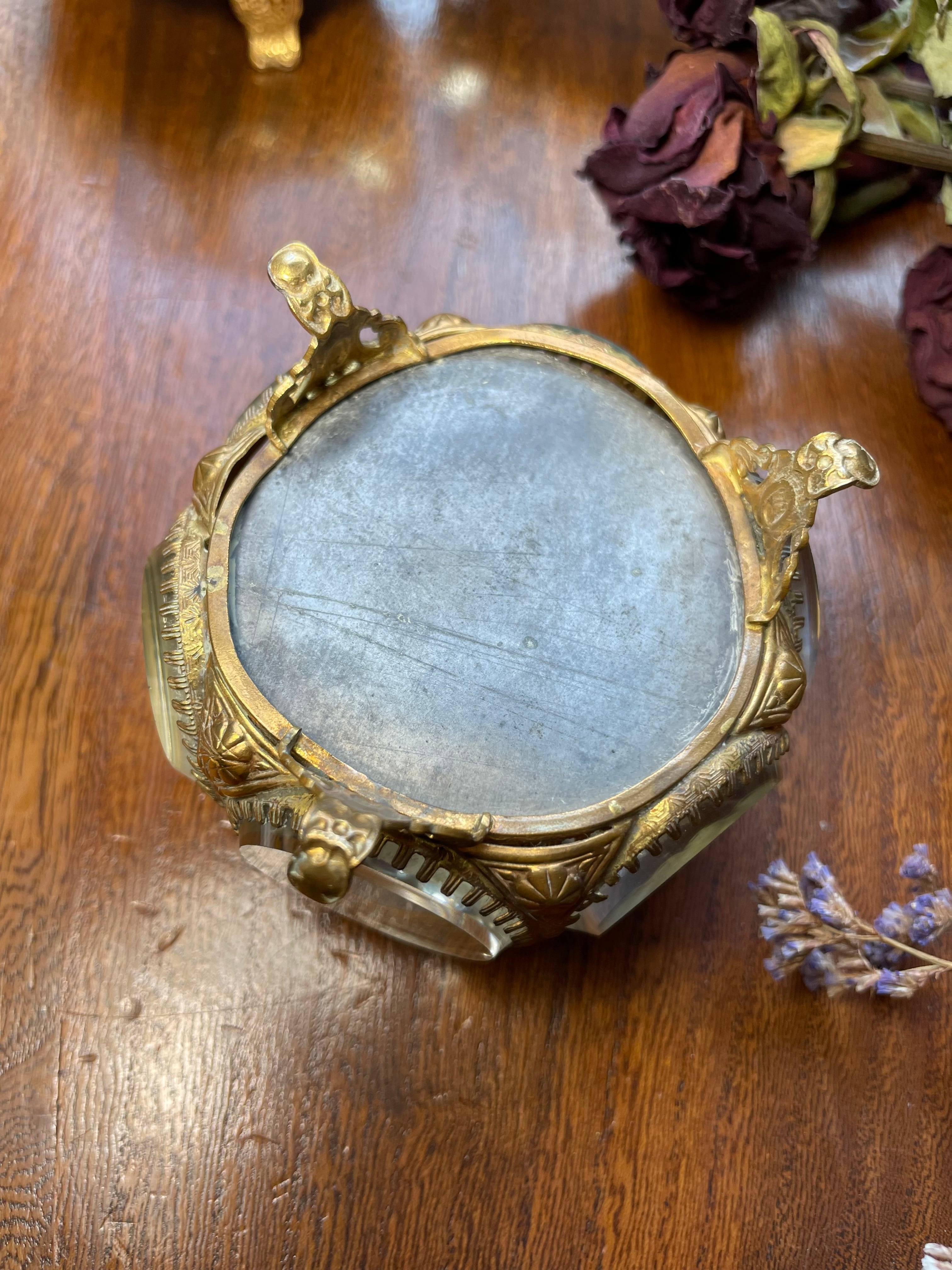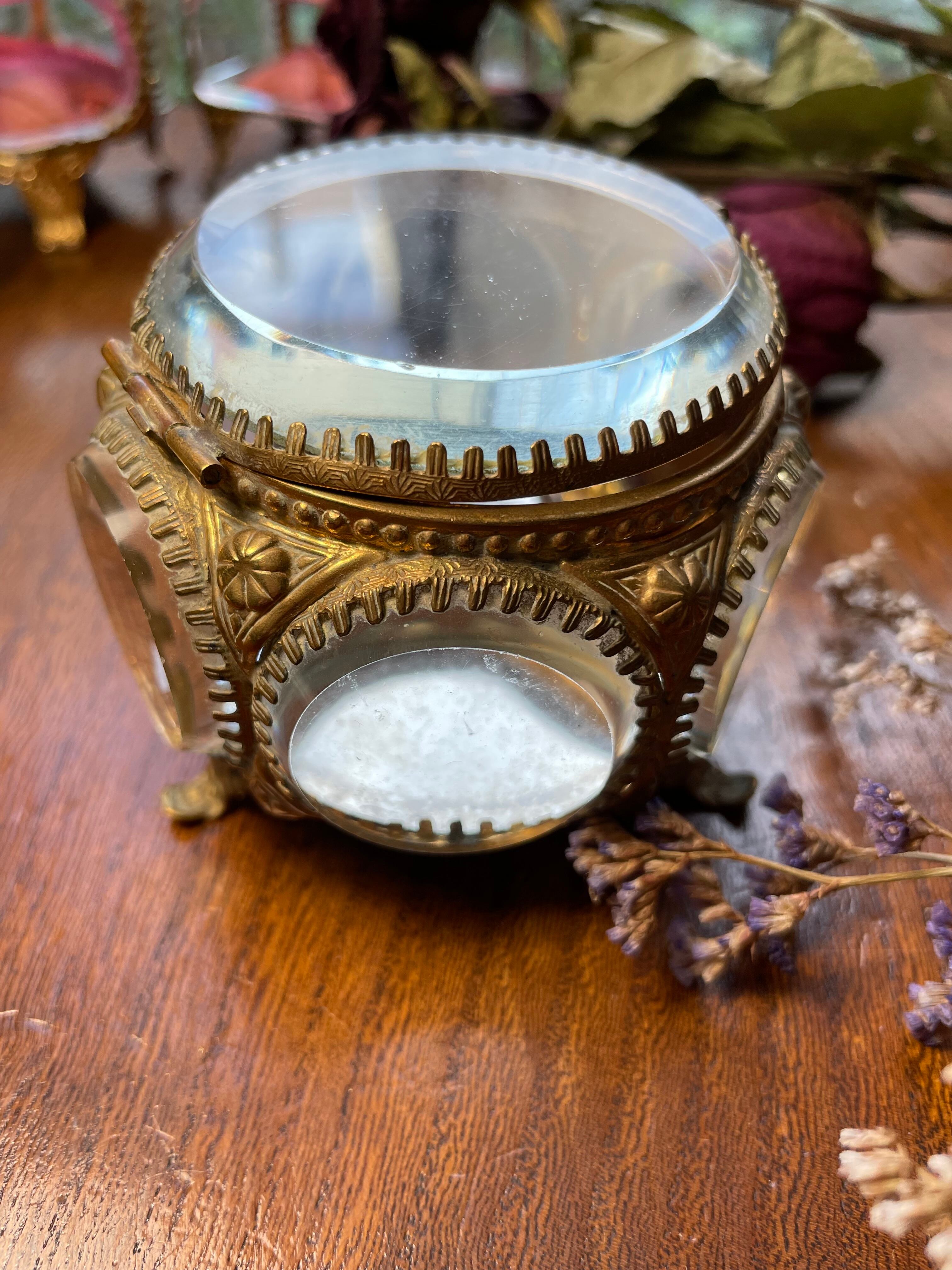 で覆われており、バベルガラスを囲む真鍮のゴールドの枯れたアンティークの風合いの素敵な、大変希少な形のジュエリーボックス です。