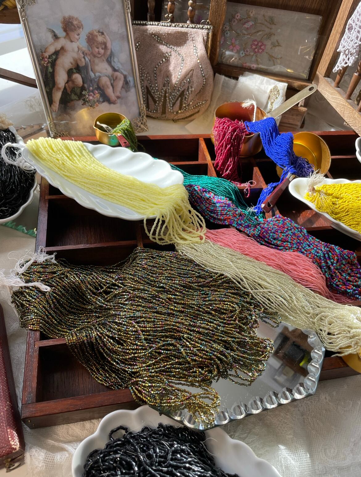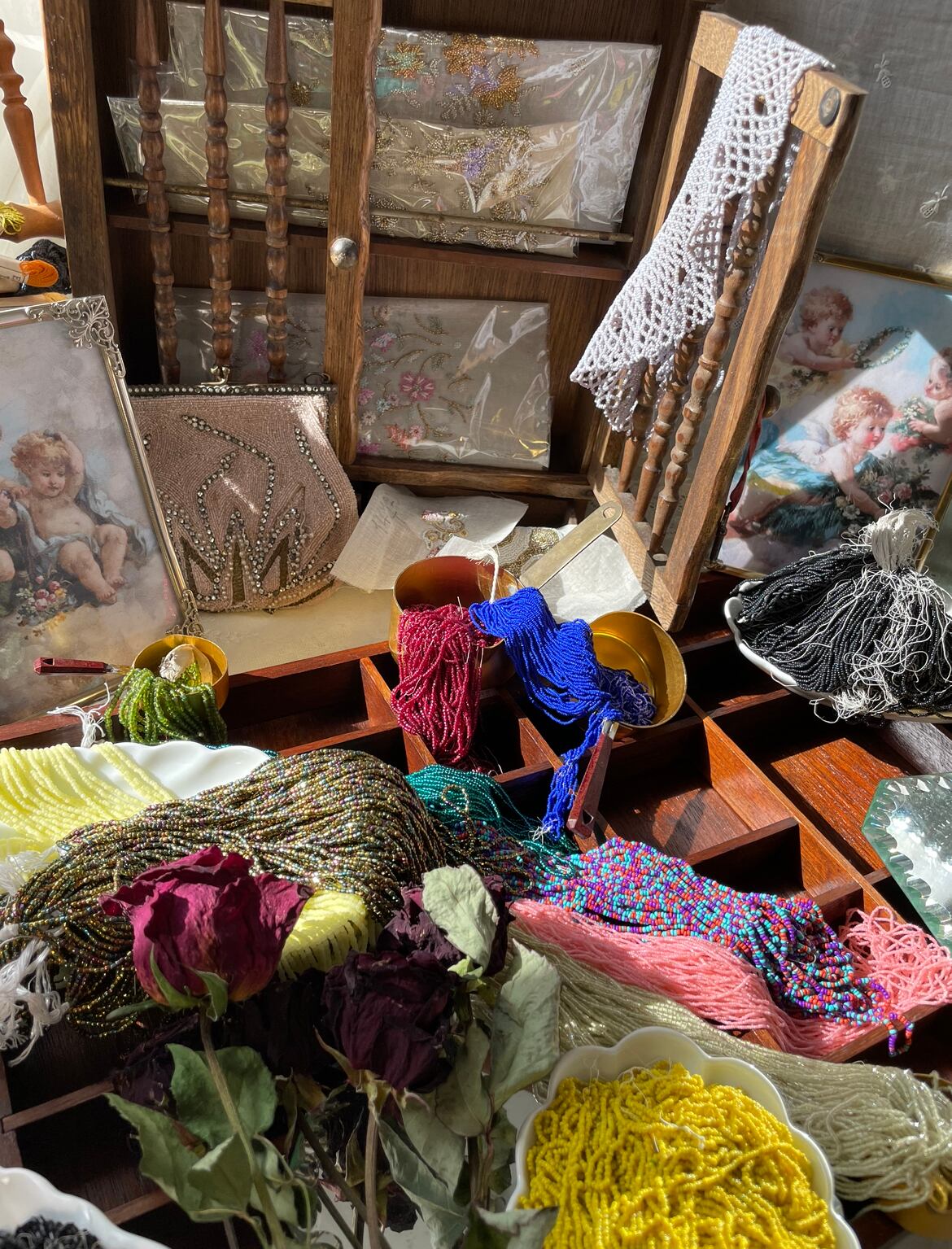 このコレクターさんは、当時、そのルサージュ刺繍の先生からアンティークビーズを購入されて、一部を、数十年間、そのまま持っていたとの事です。