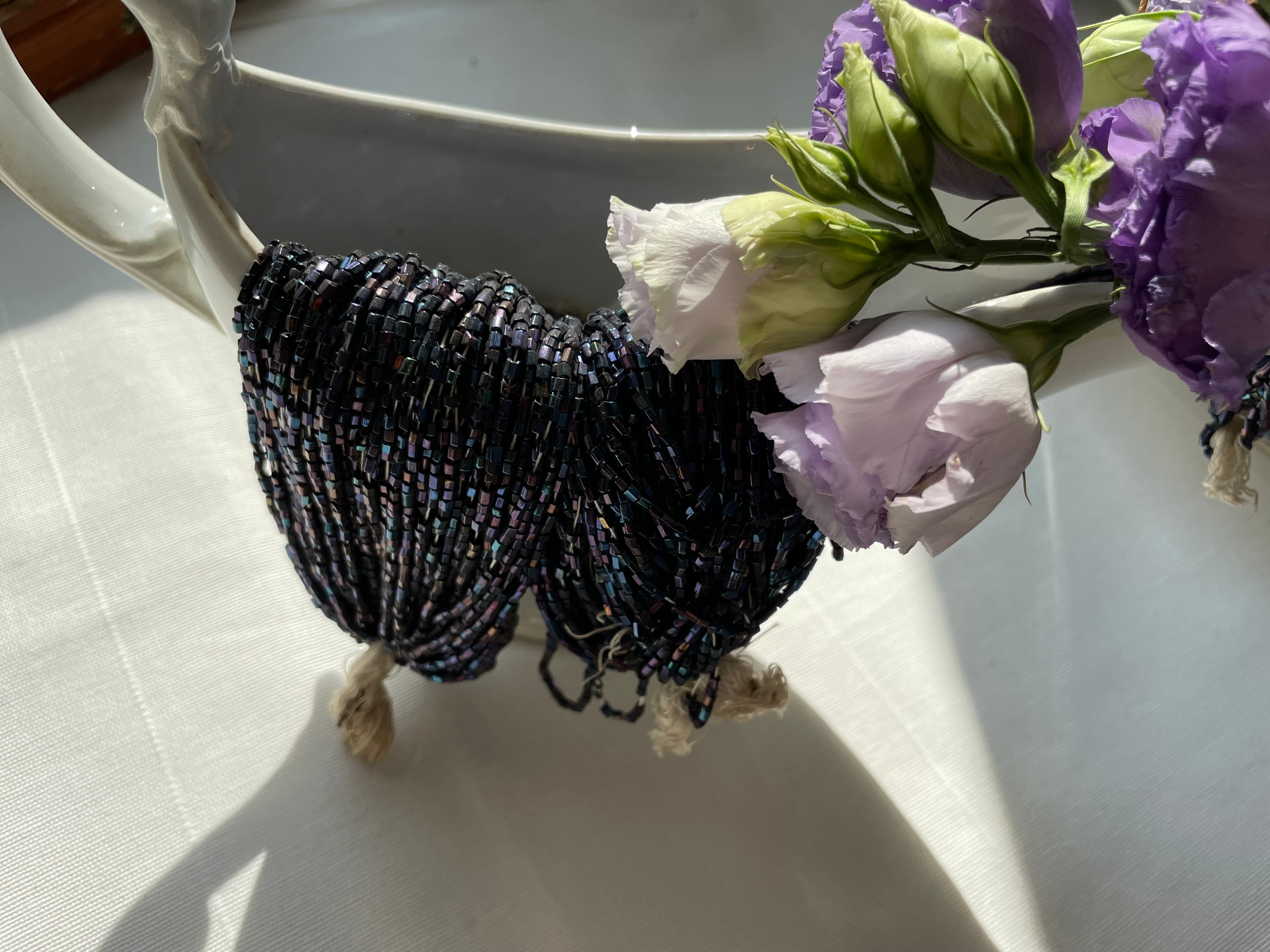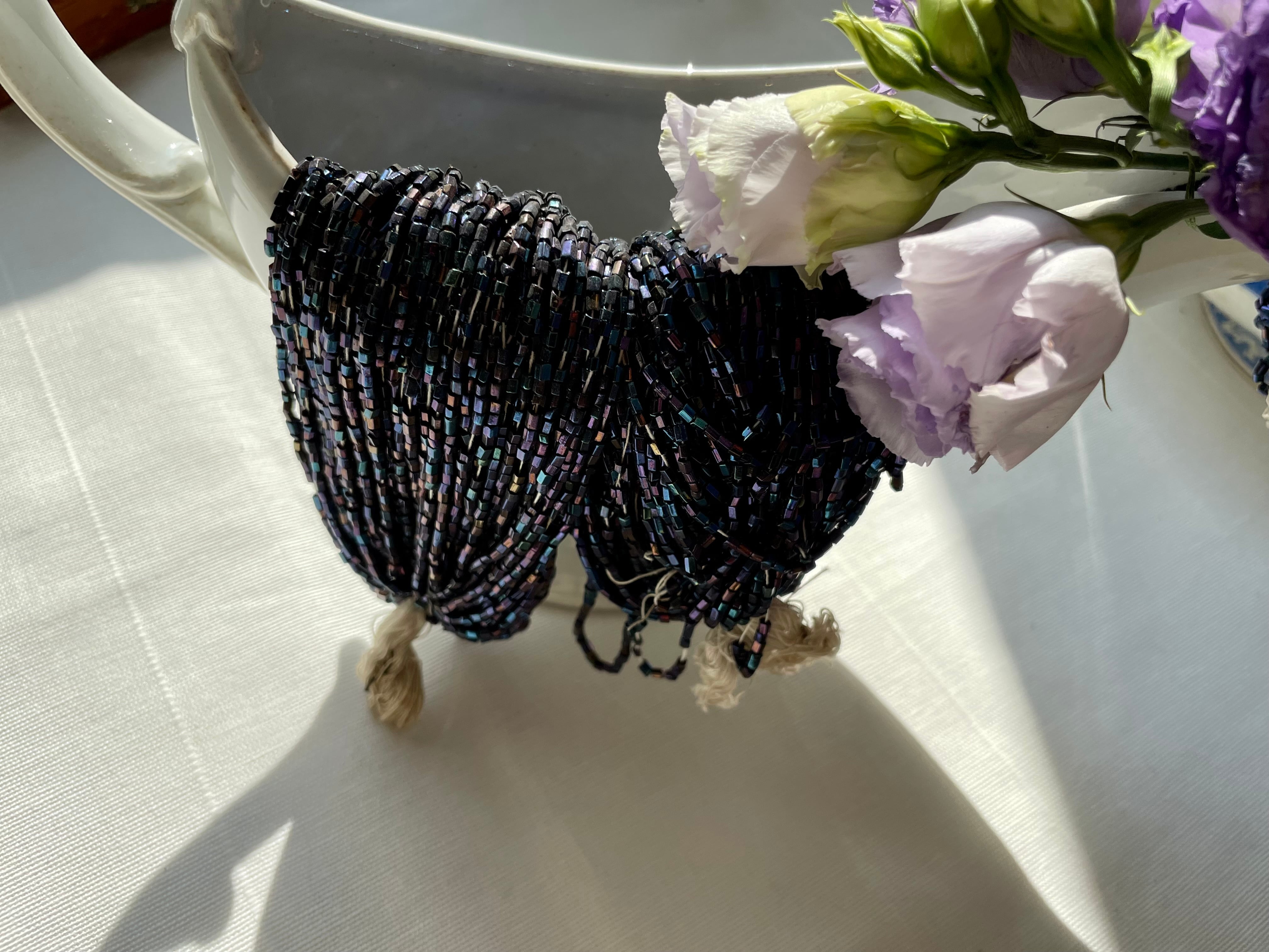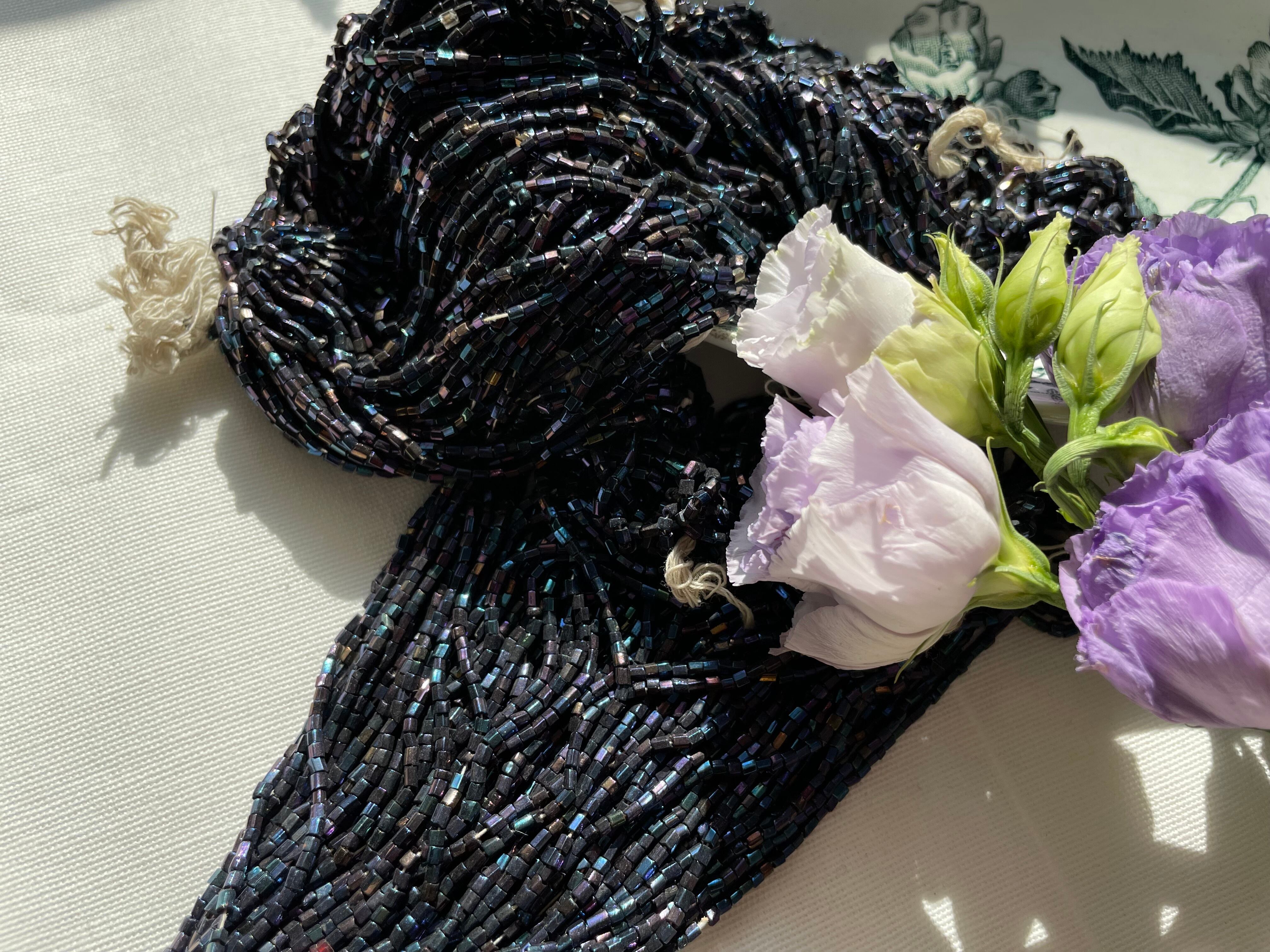 シルクの上に、ガラスやメタルビーズ で美しい刺繍を施していたのではないでしょうか。