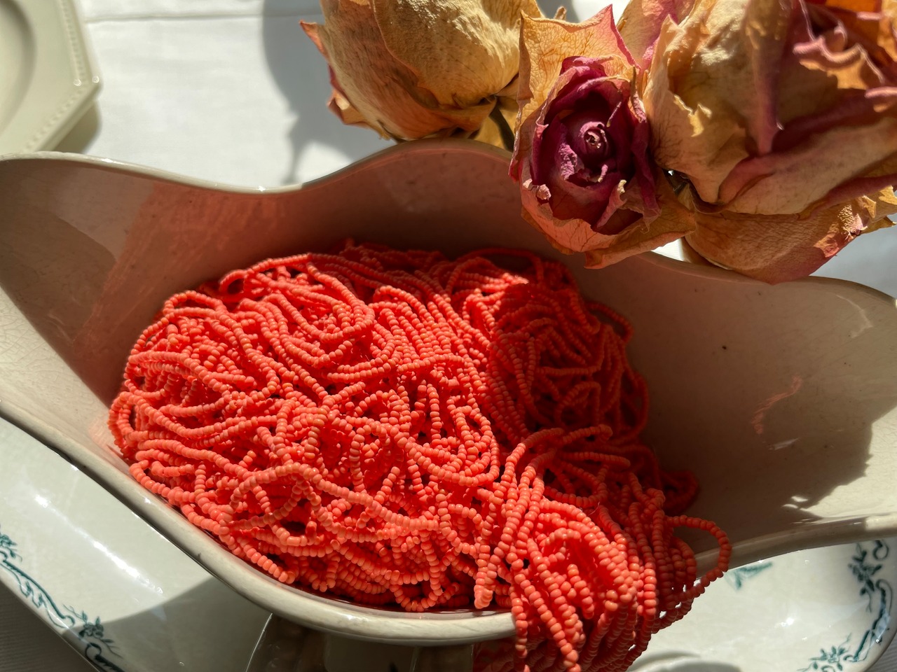 このコレクターさんは、当時、そのルサージュ刺繍の先生からアンティークビーズを購入されて、一部を、数十年間、そのまま持っていたとの事です。