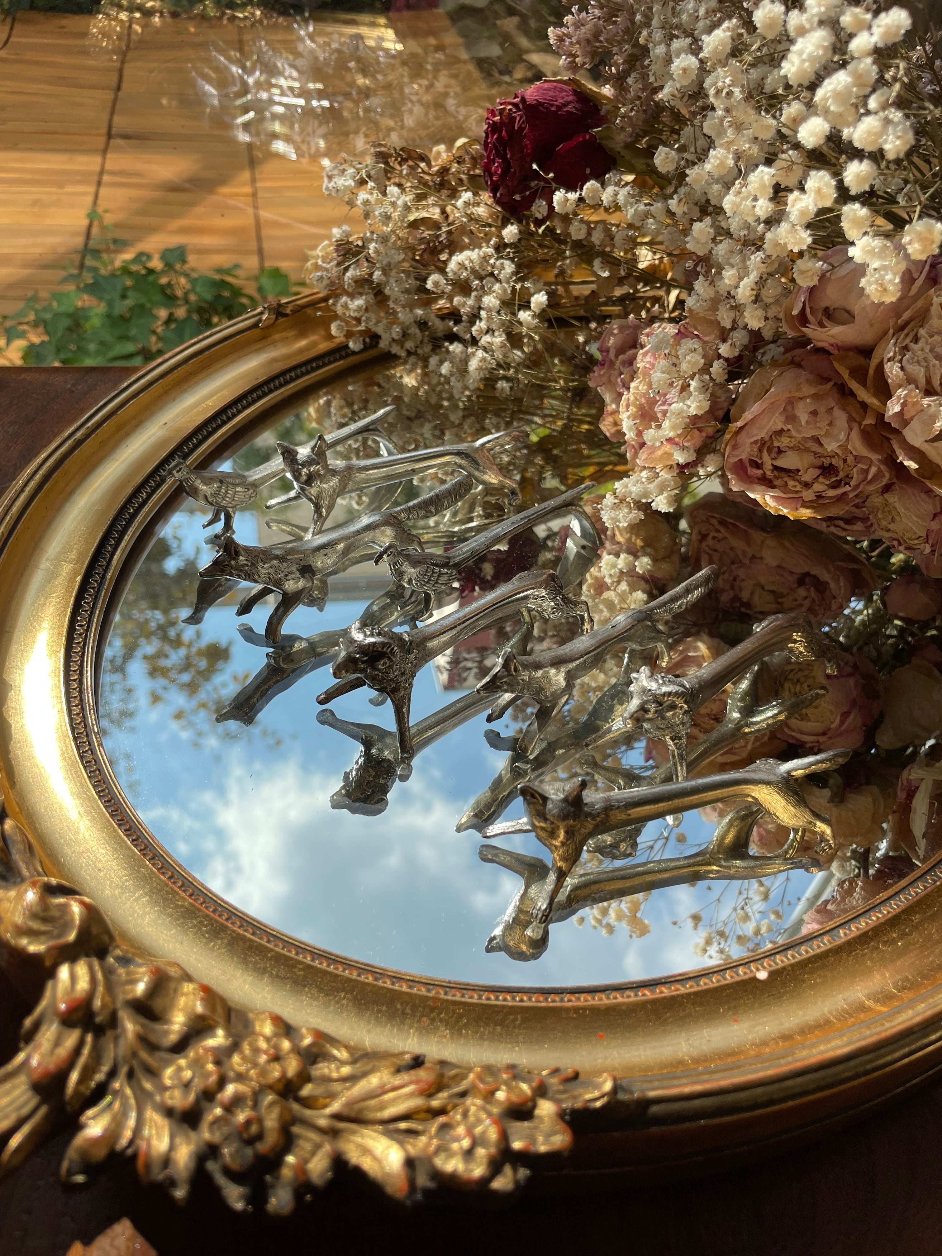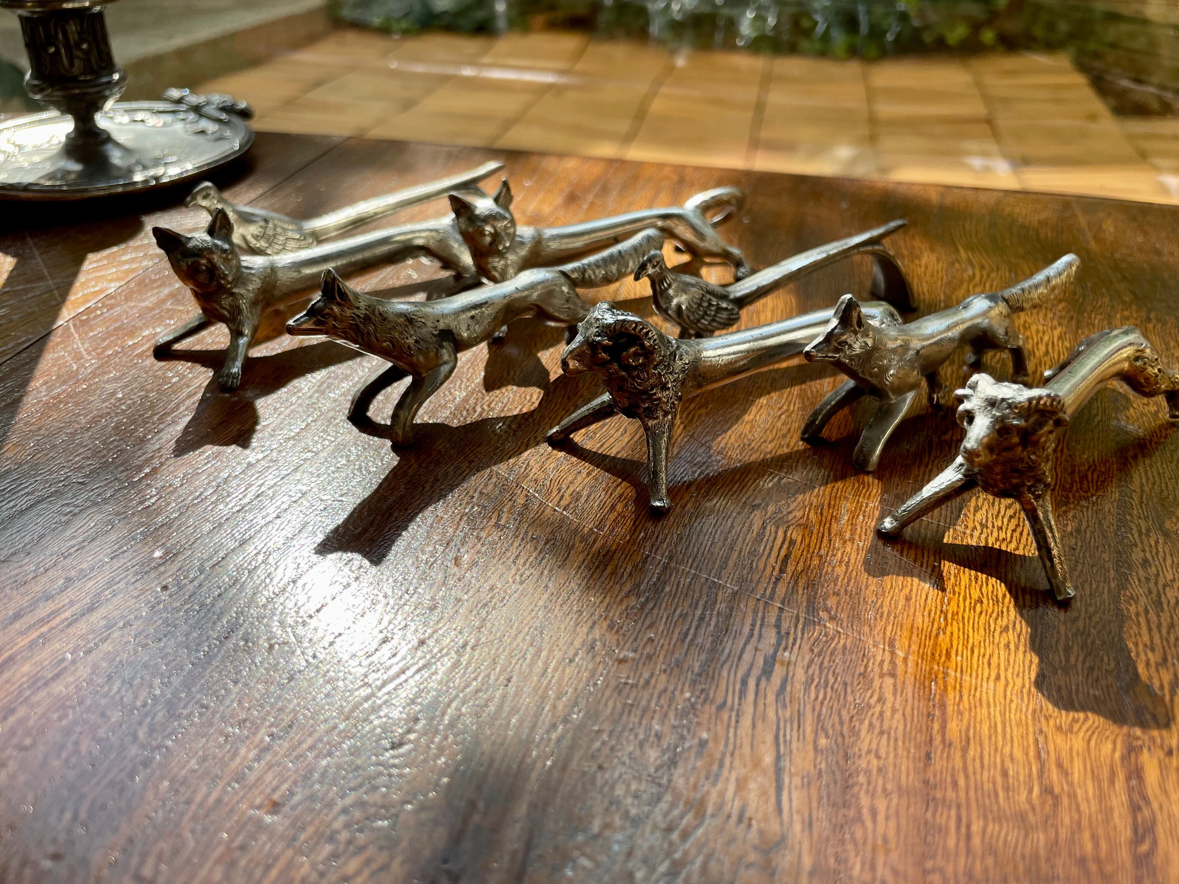 シックなメタル製、シルバー色のねこ、キツネ、ひつじ?ときじのデザインが可愛いカトラリーレストです。