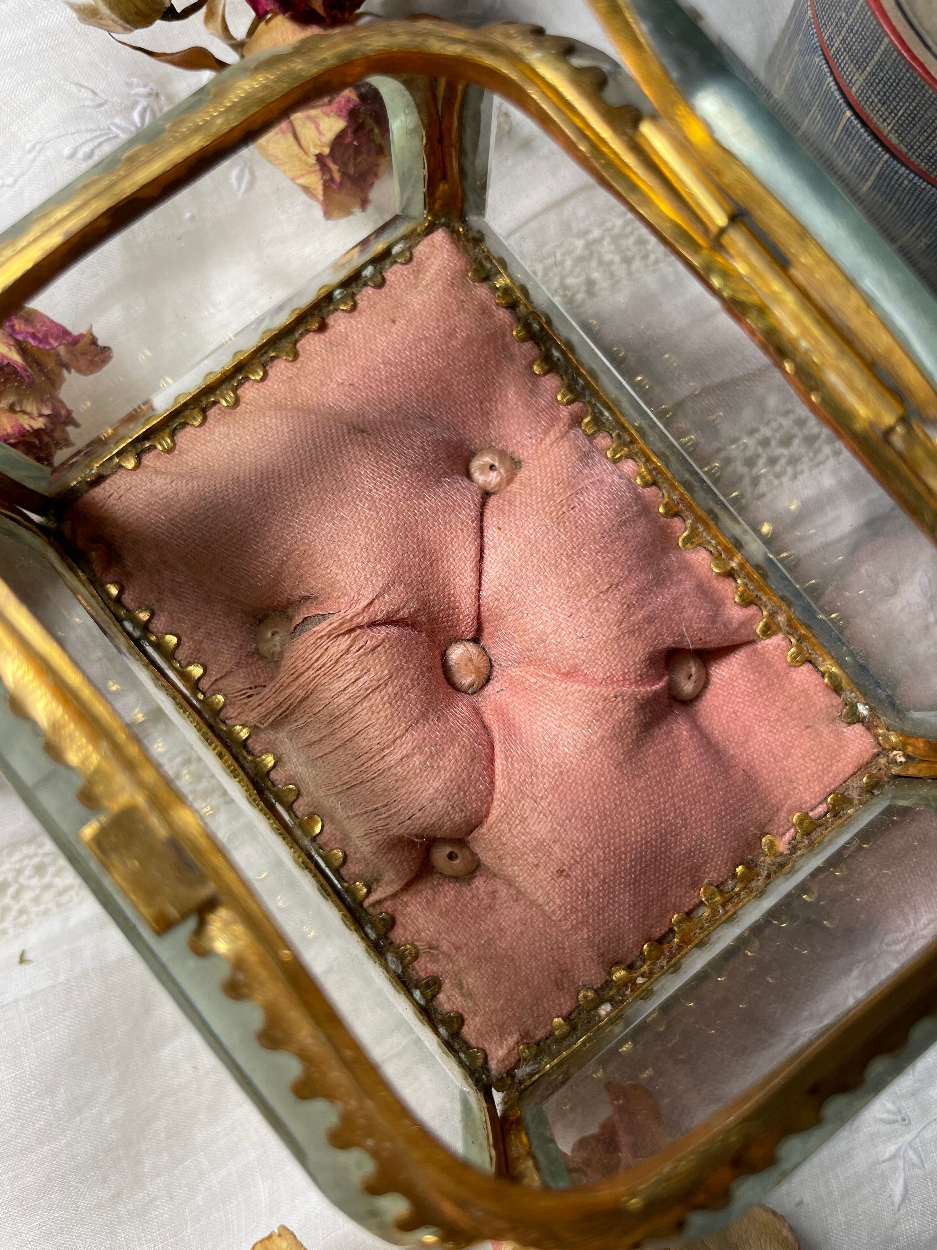 で覆われており、バベルガラスを囲む真鍮のゴールドの枯れたアンティークの風合いの素敵な、大変希少な形のジュエリーボックス です。