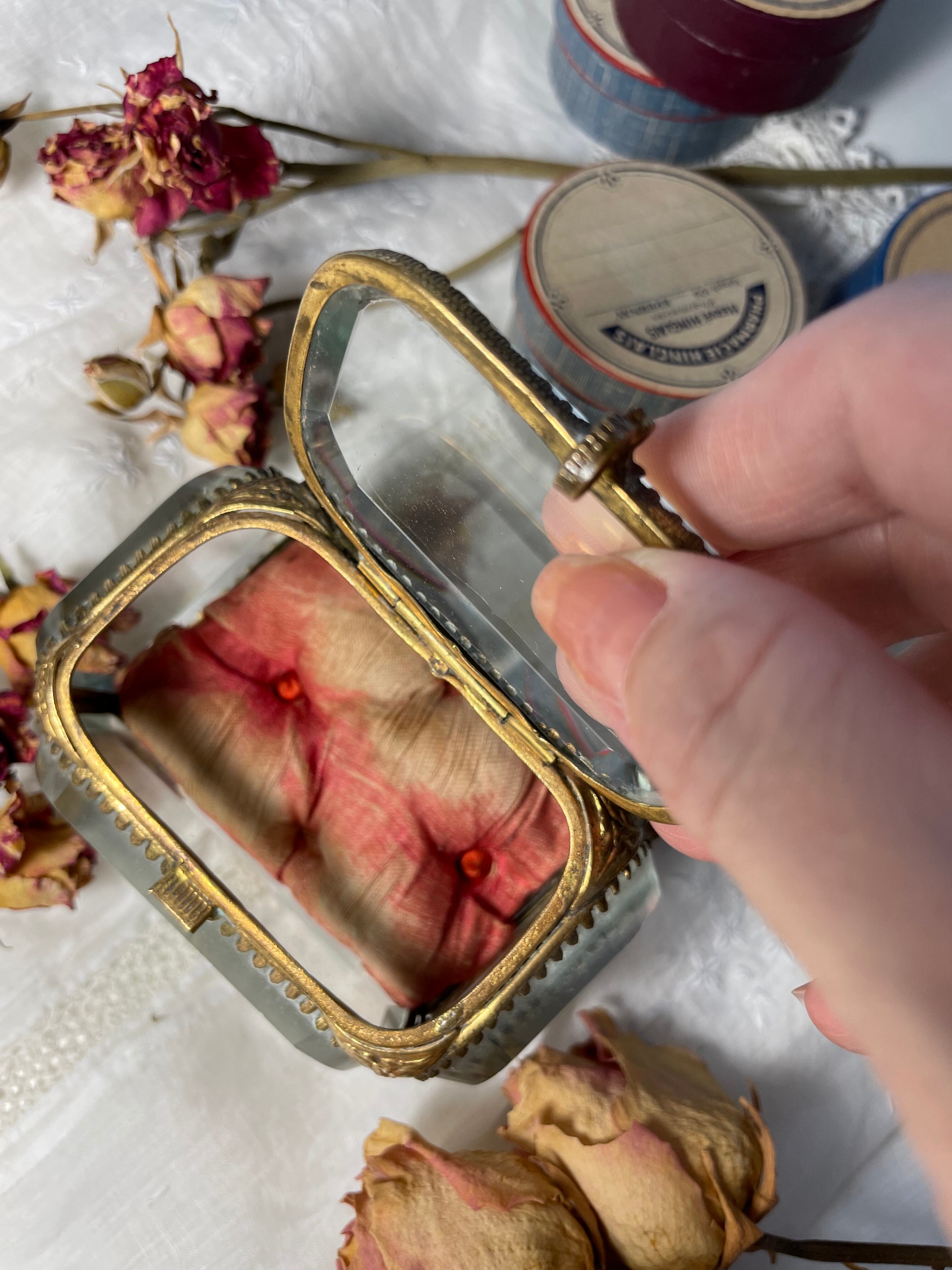 で覆われており、バベルガラスを囲む真鍮のゴールドの枯れたアンティークの風合いの素敵な、大変希少な形のジュエリーボックス です。