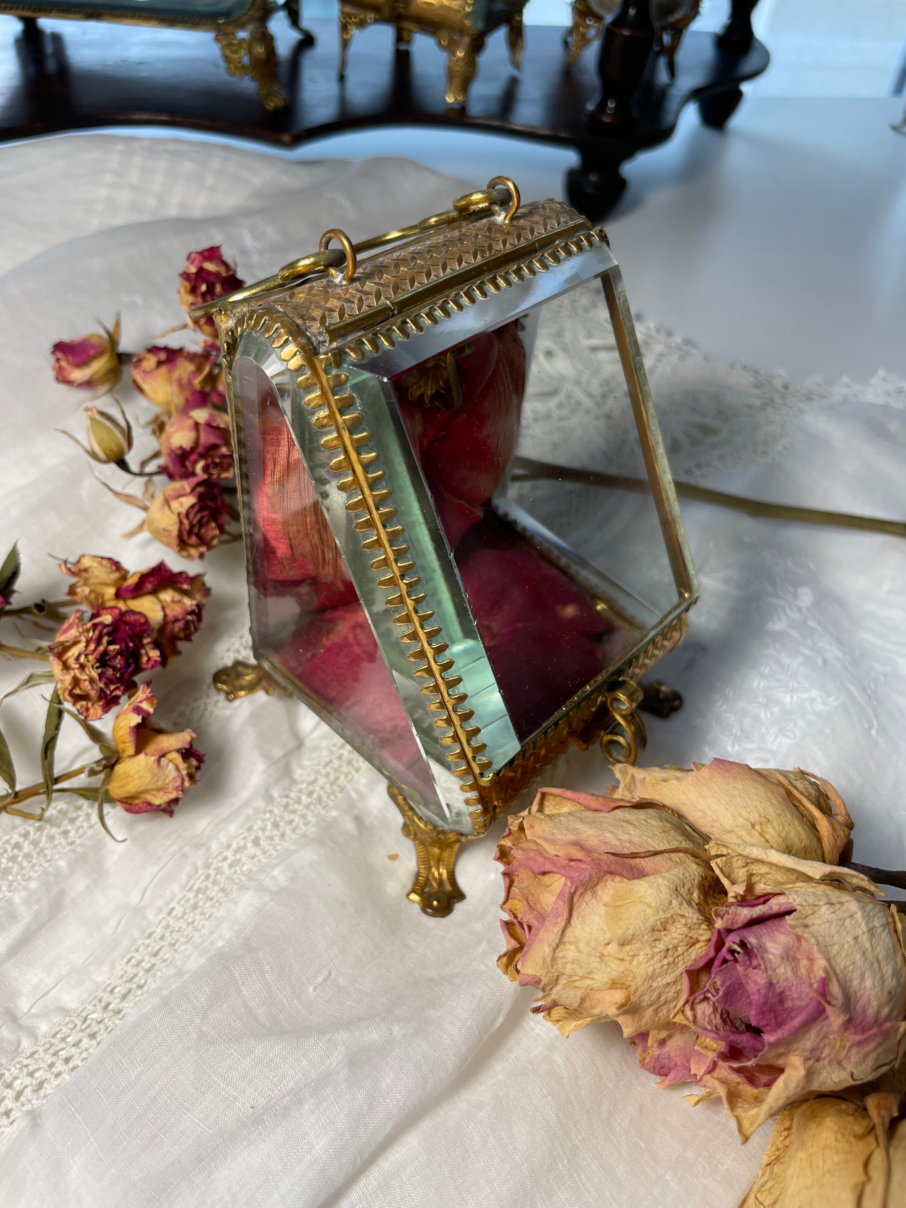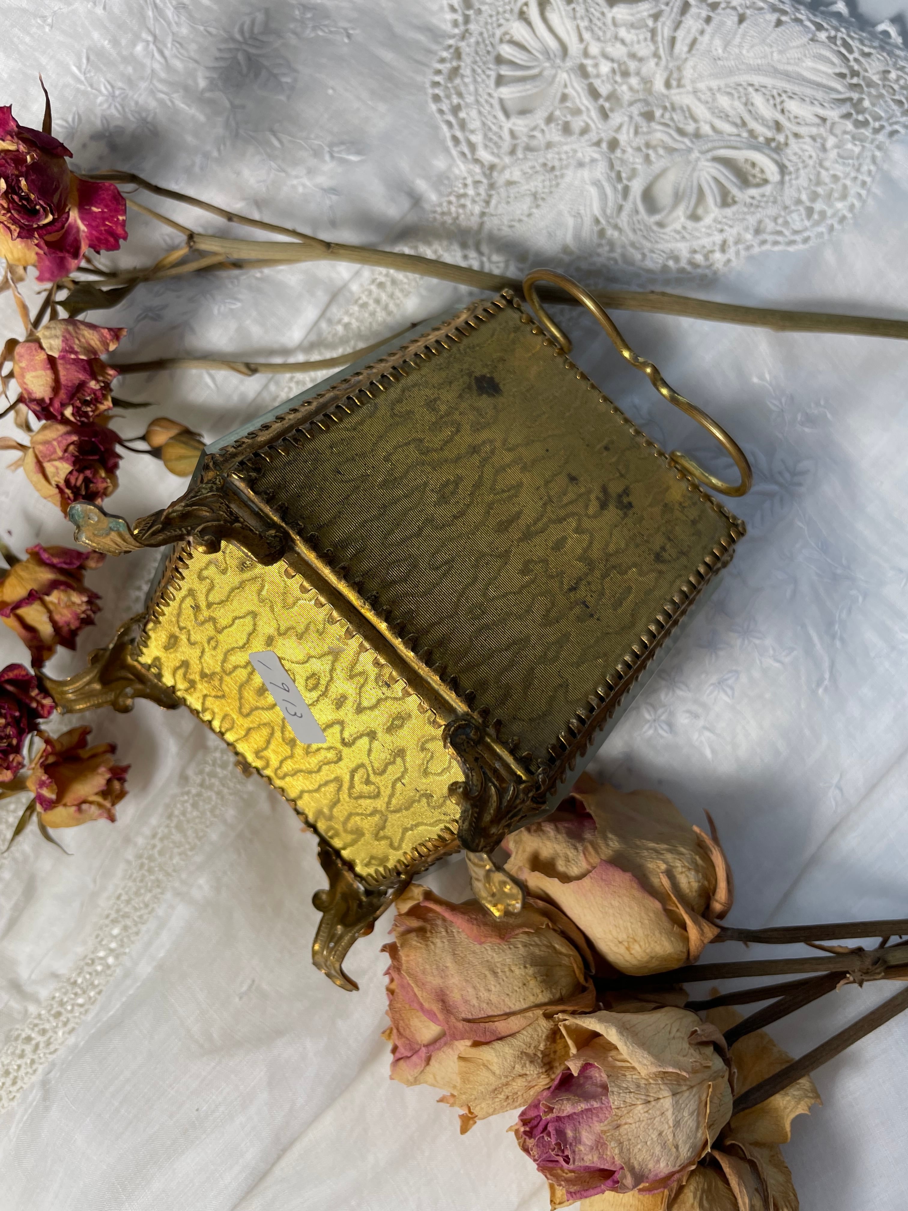 で覆われており、バベルガラスを囲む真鍮のゴールドの枯れたアンティークの風合いの素敵な、大変希少な形のジュエリーボックス です。