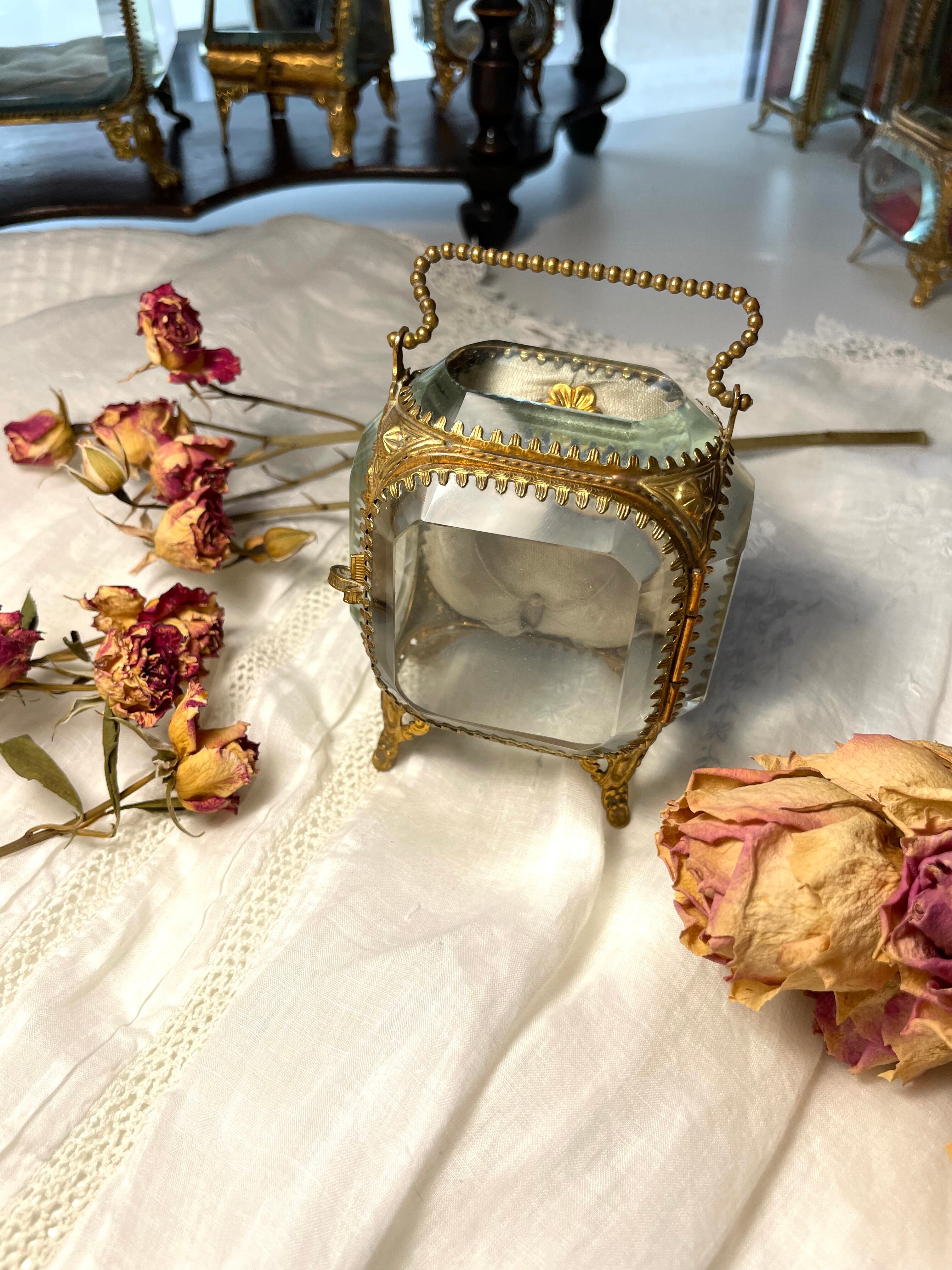 で覆われており、バベルガラスを囲む真鍮のゴールドの枯れたアンティークの風合いの素敵な、大変希少な形のジュエリーボックス です。