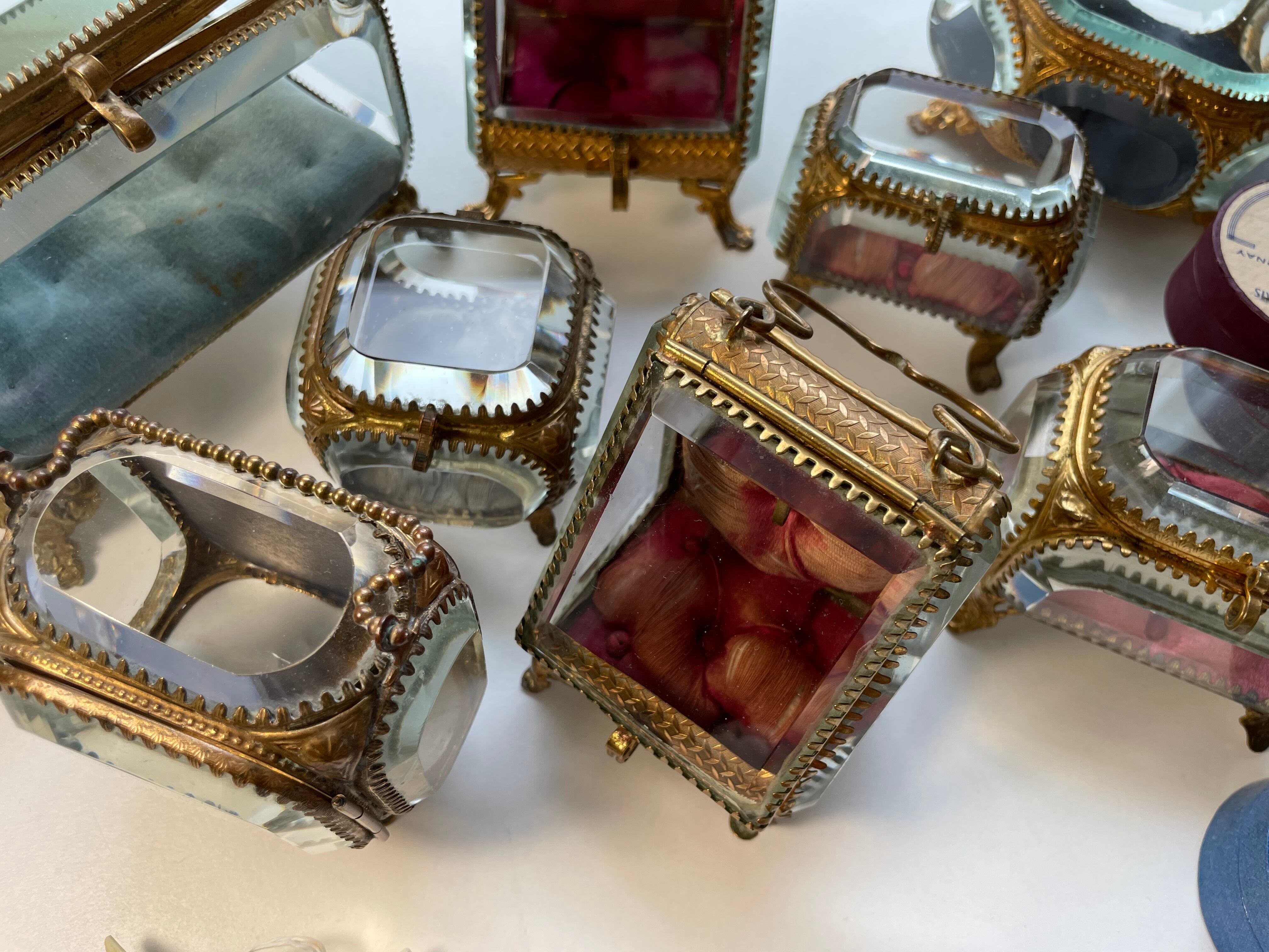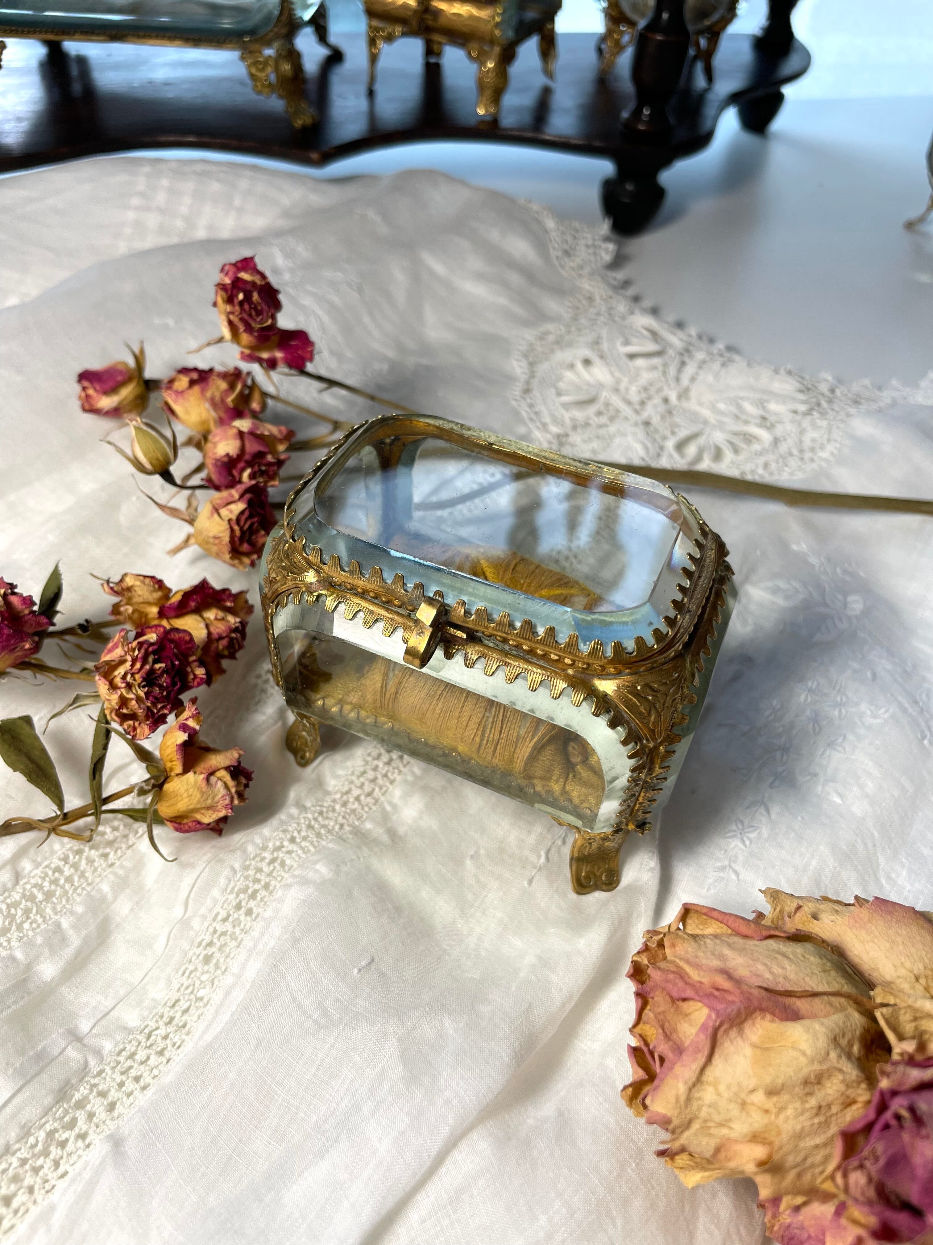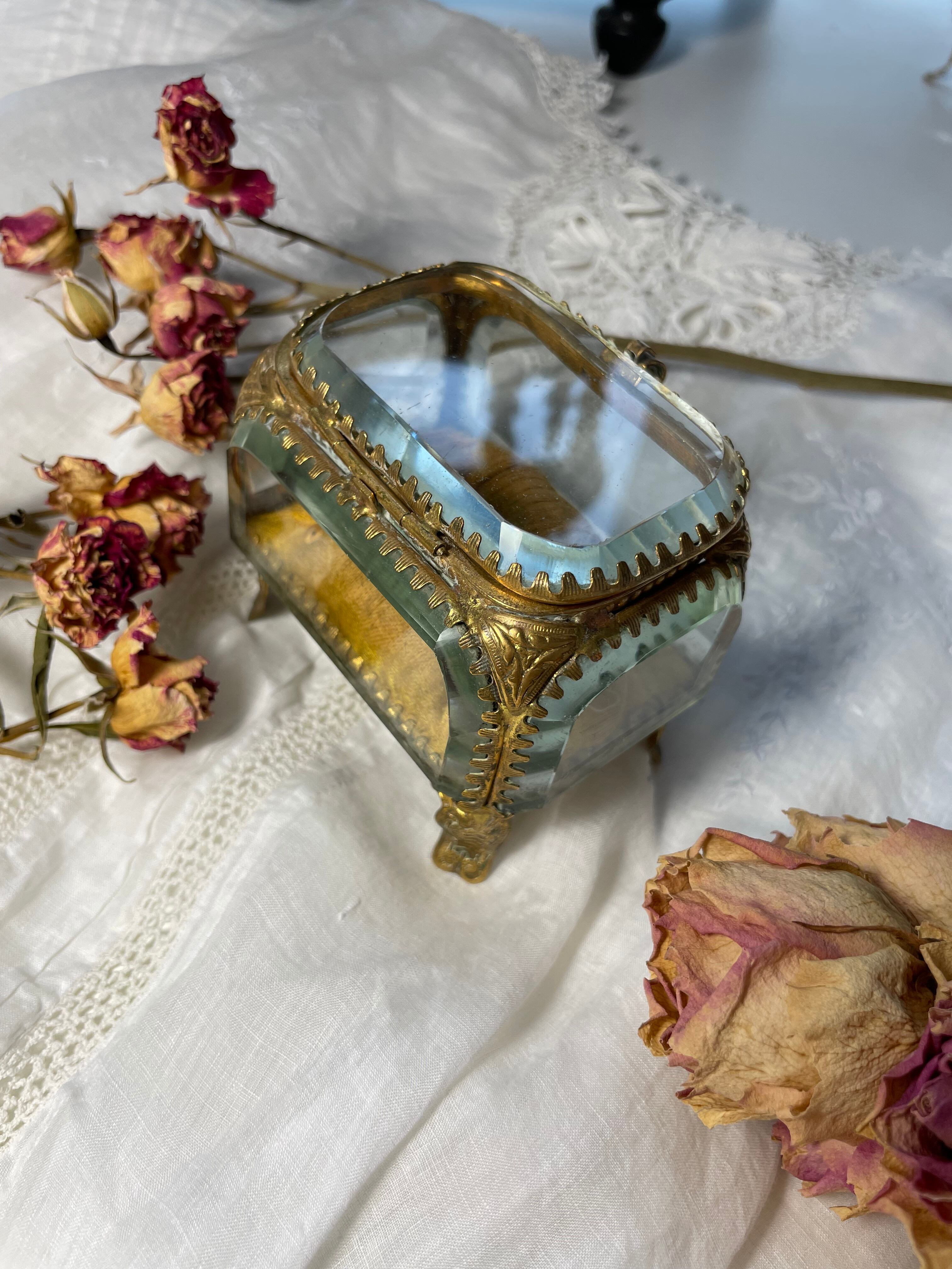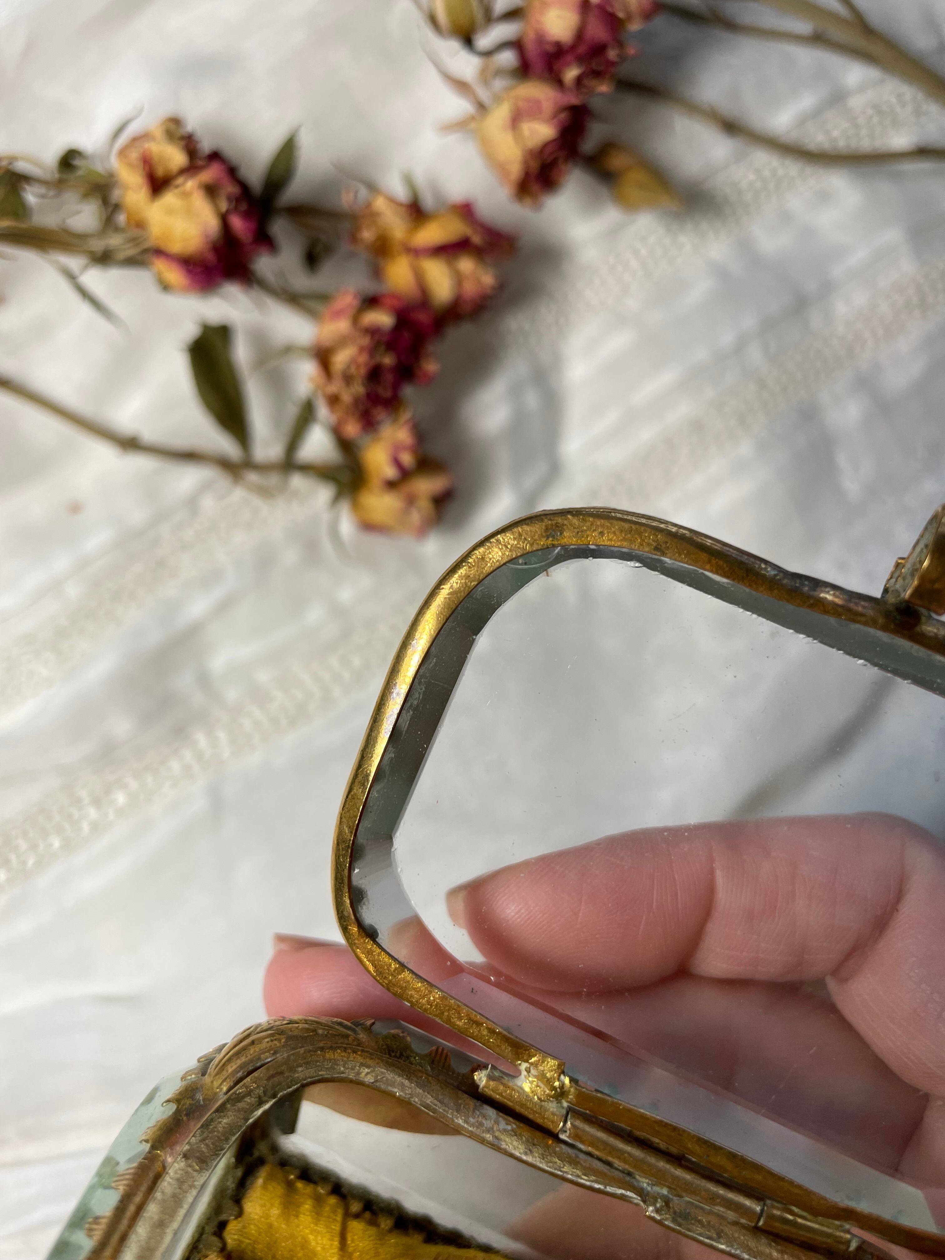 で覆われており、バベルガラスを囲む真鍮のゴールドの枯れたアンティークの風合いの素敵な、大変希少な形のジュエリーボックス です。