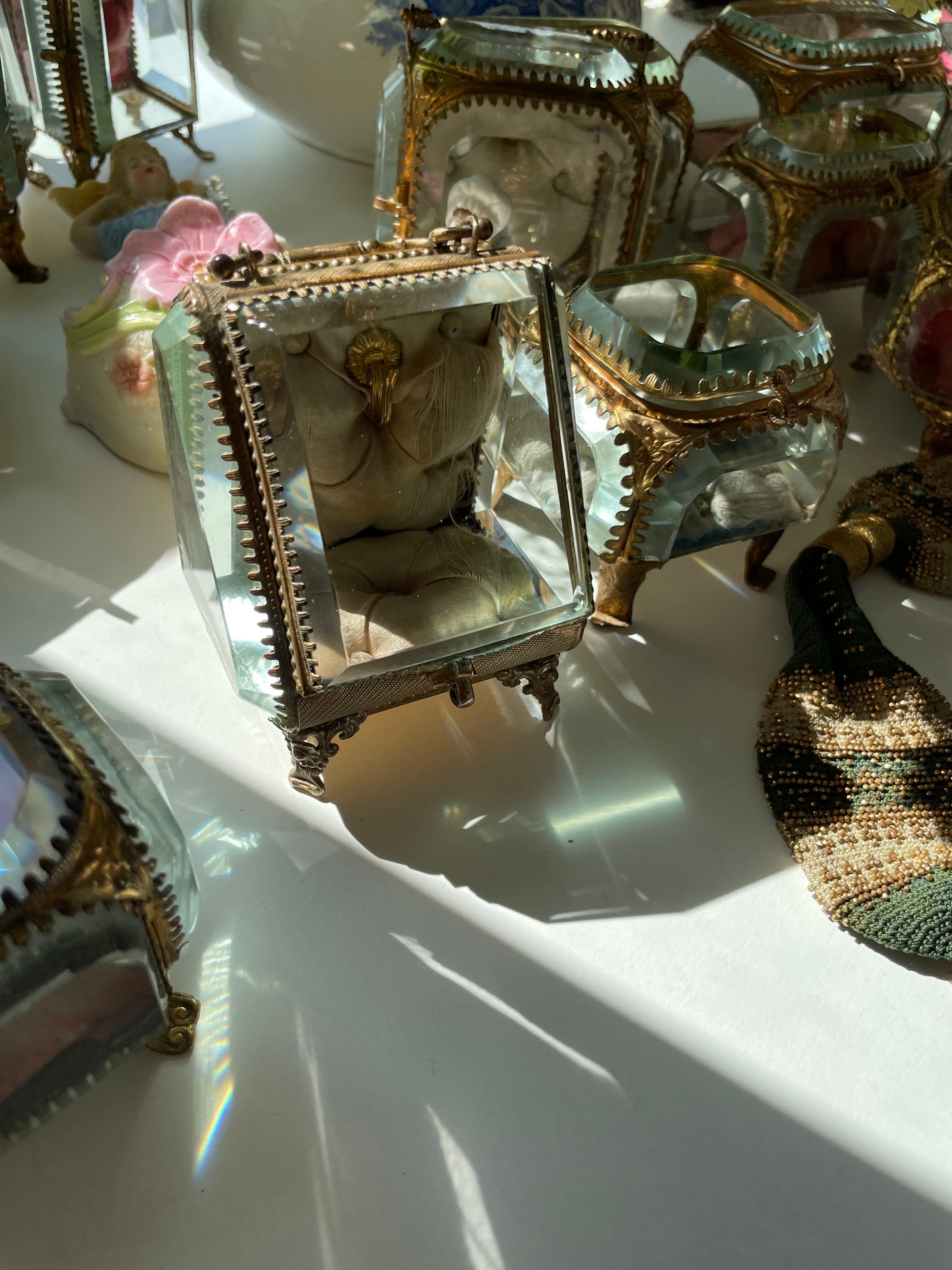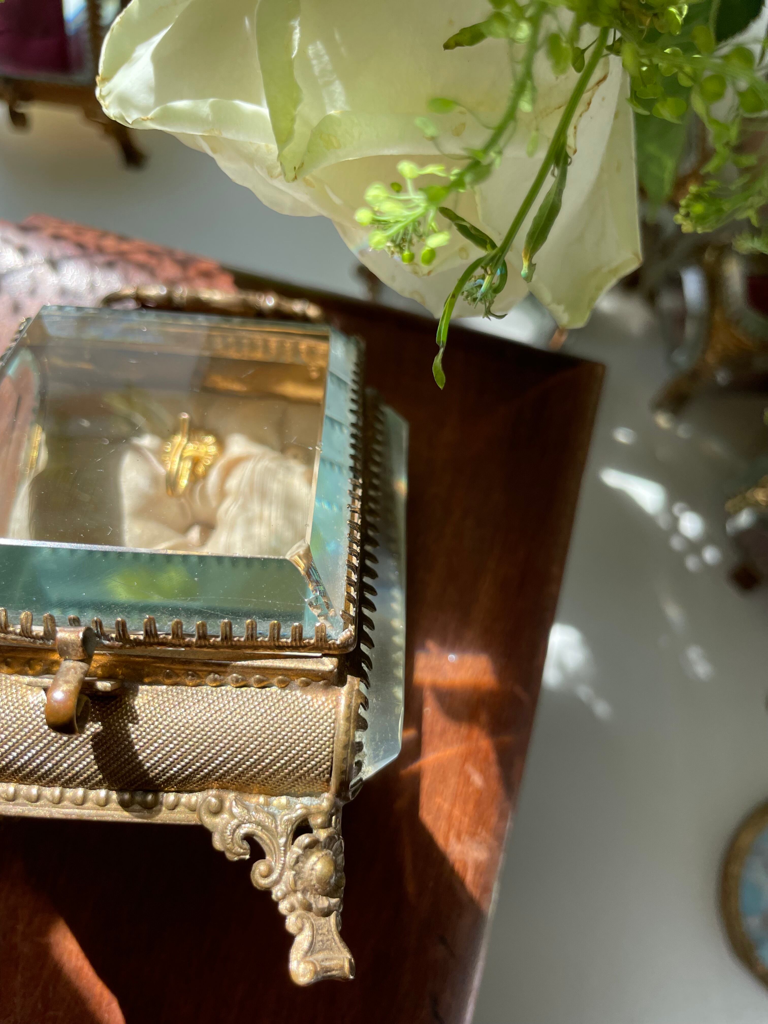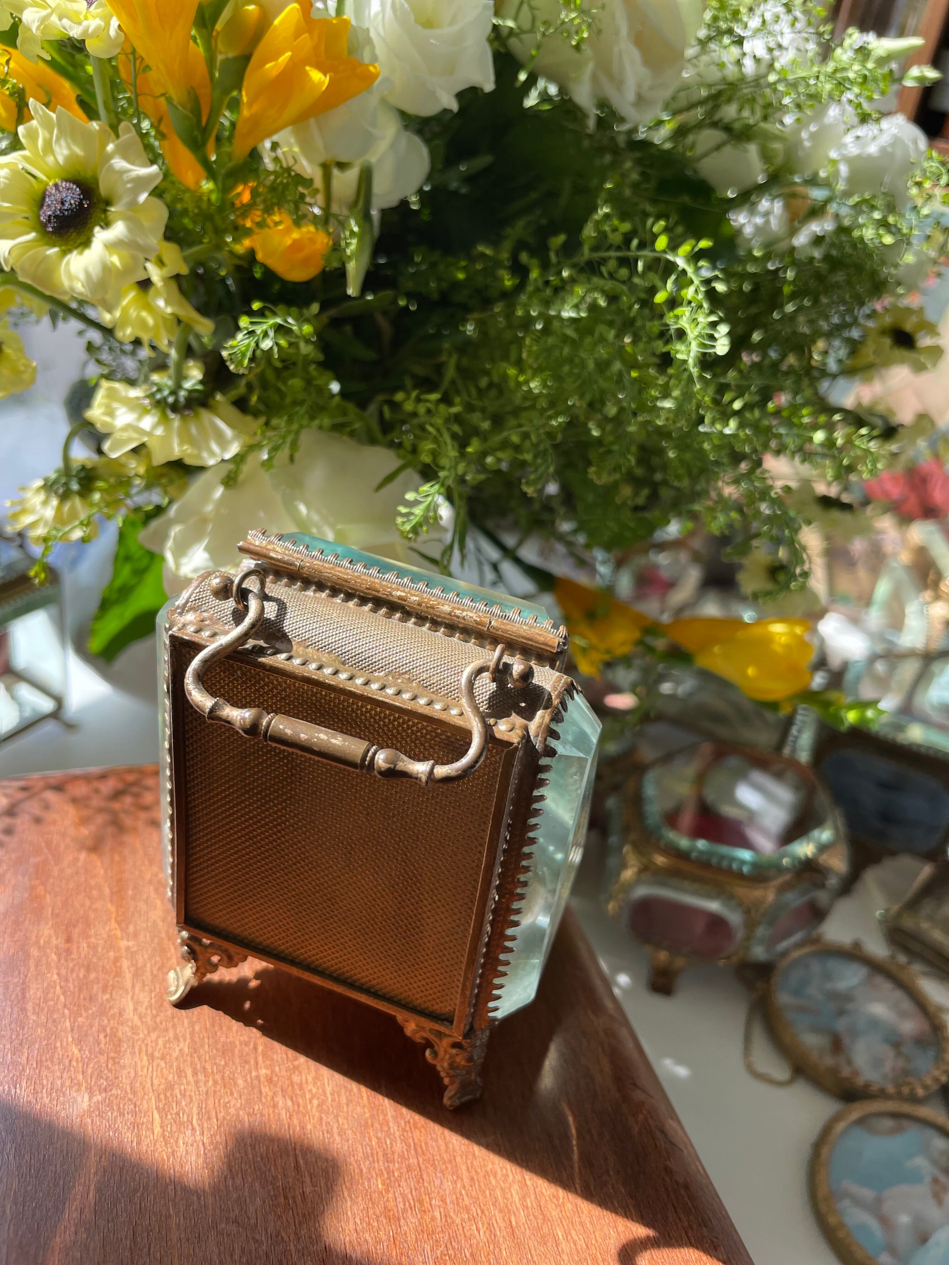 3面をバベルガラス【面取りされた分厚く美しいガラス】で覆われており、バベルガラスを囲む真鍮のゴールドの枯れた風合いと、さらには、側面の底の擦り切れたエクリューカラーのクッションのアンティークの風合いの素敵な、大変希少な形のジュエリーボックス です。