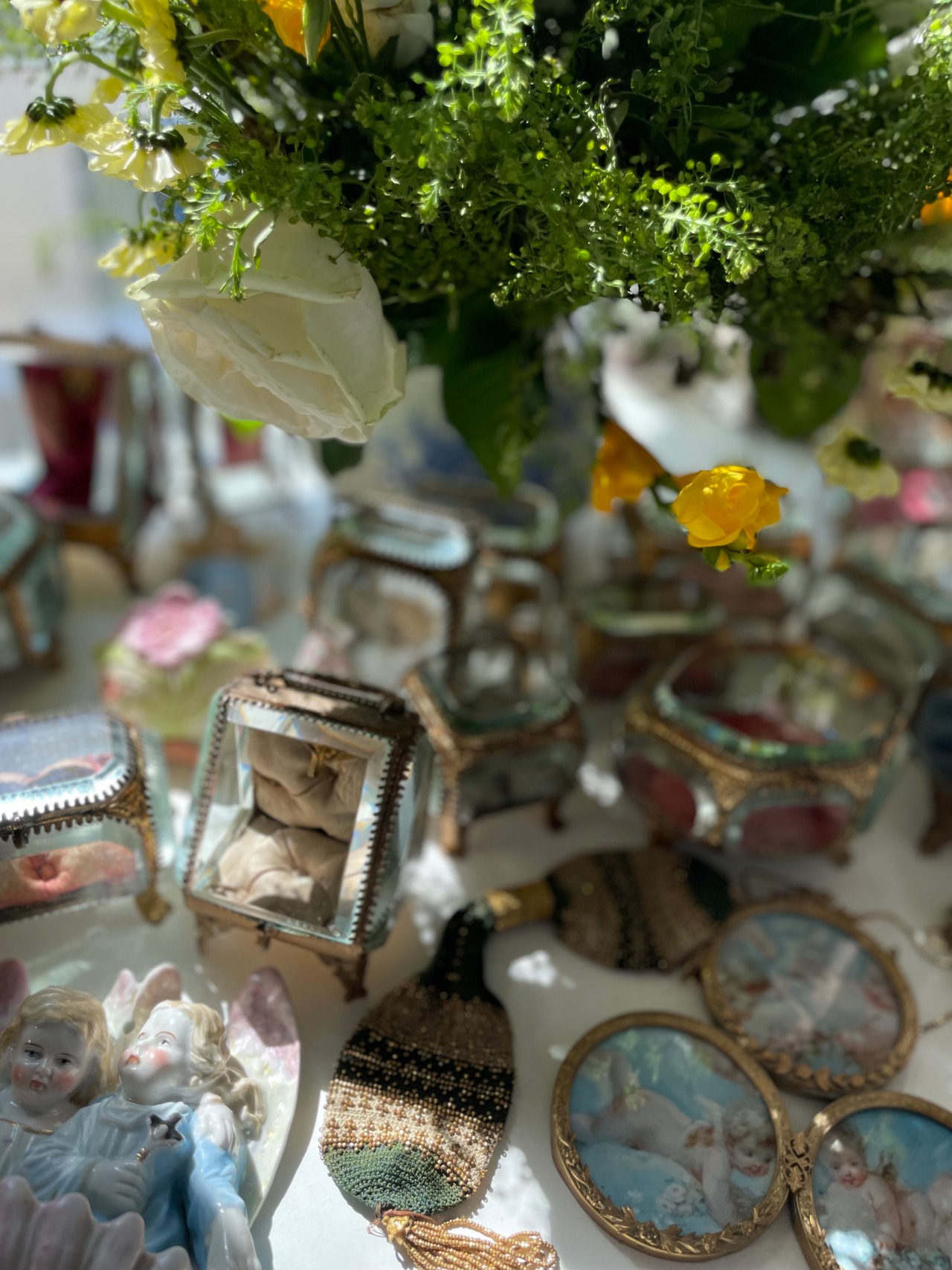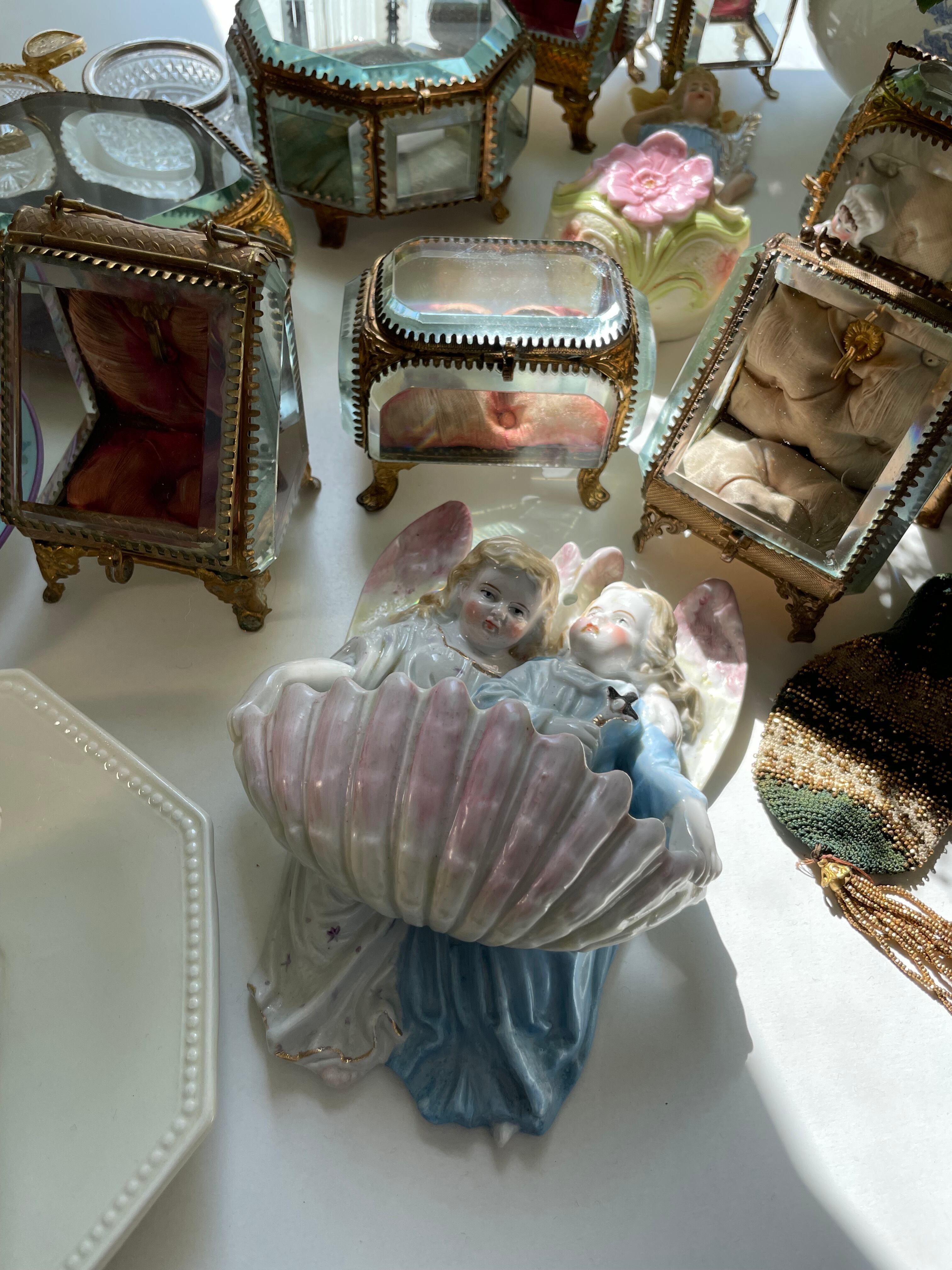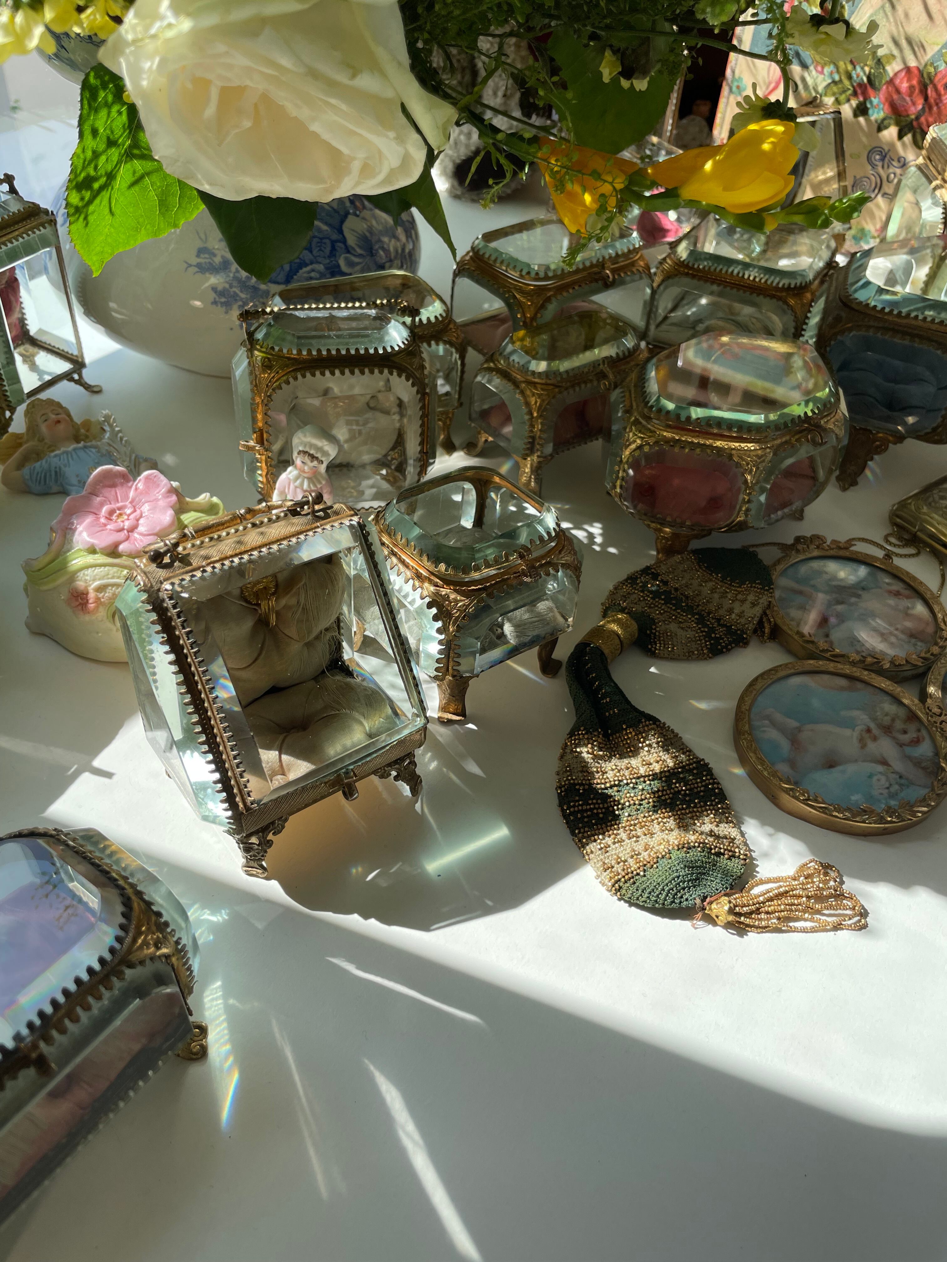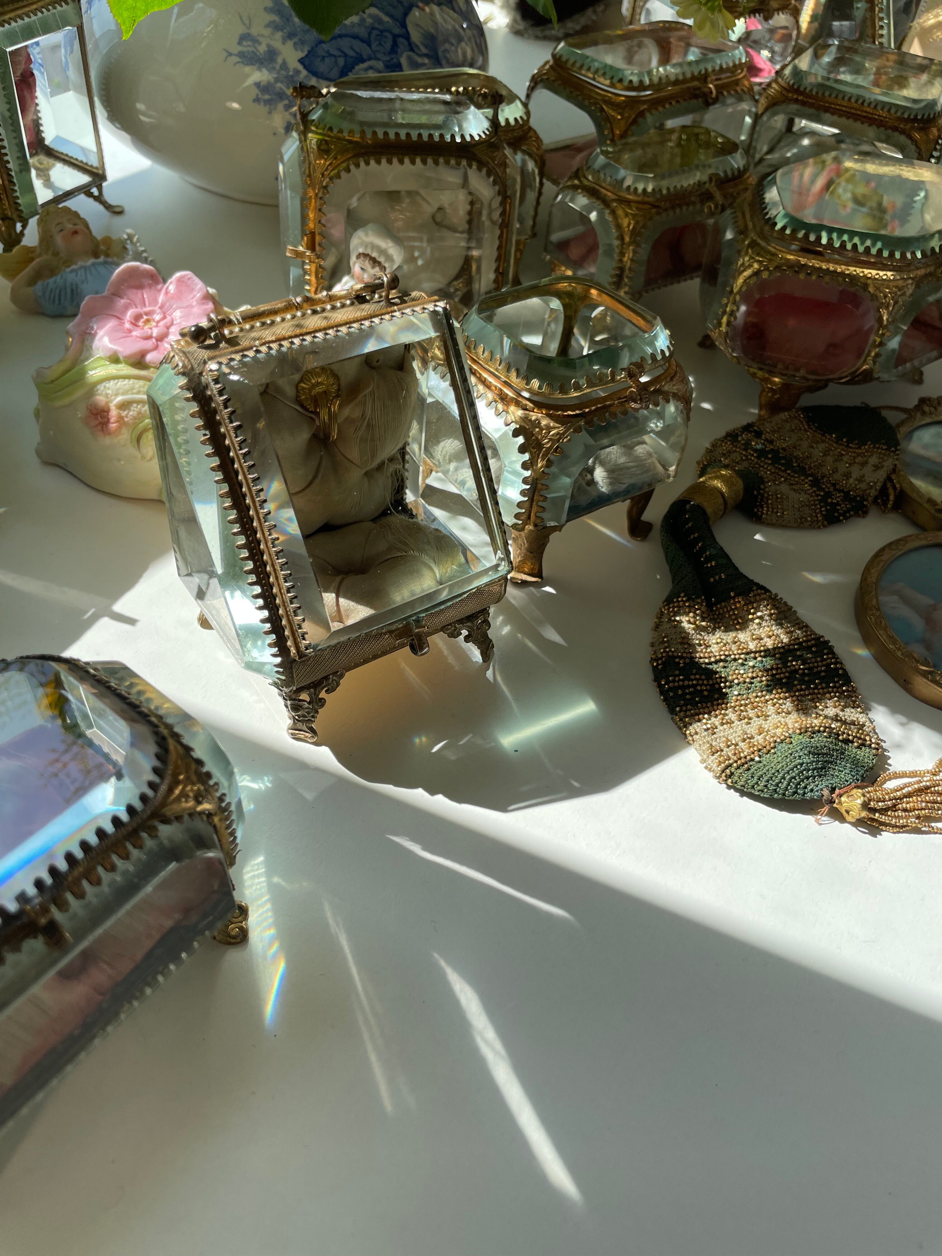3面をバベルガラス【面取りされた分厚く美しいガラス】で覆われており、バベルガラスを囲む真鍮のゴールドの枯れた風合いと、さらには、側面の底の擦り切れたエクリューカラーのクッションのアンティークの風合いの素敵な、大変希少な形のジュエリーボックス です。