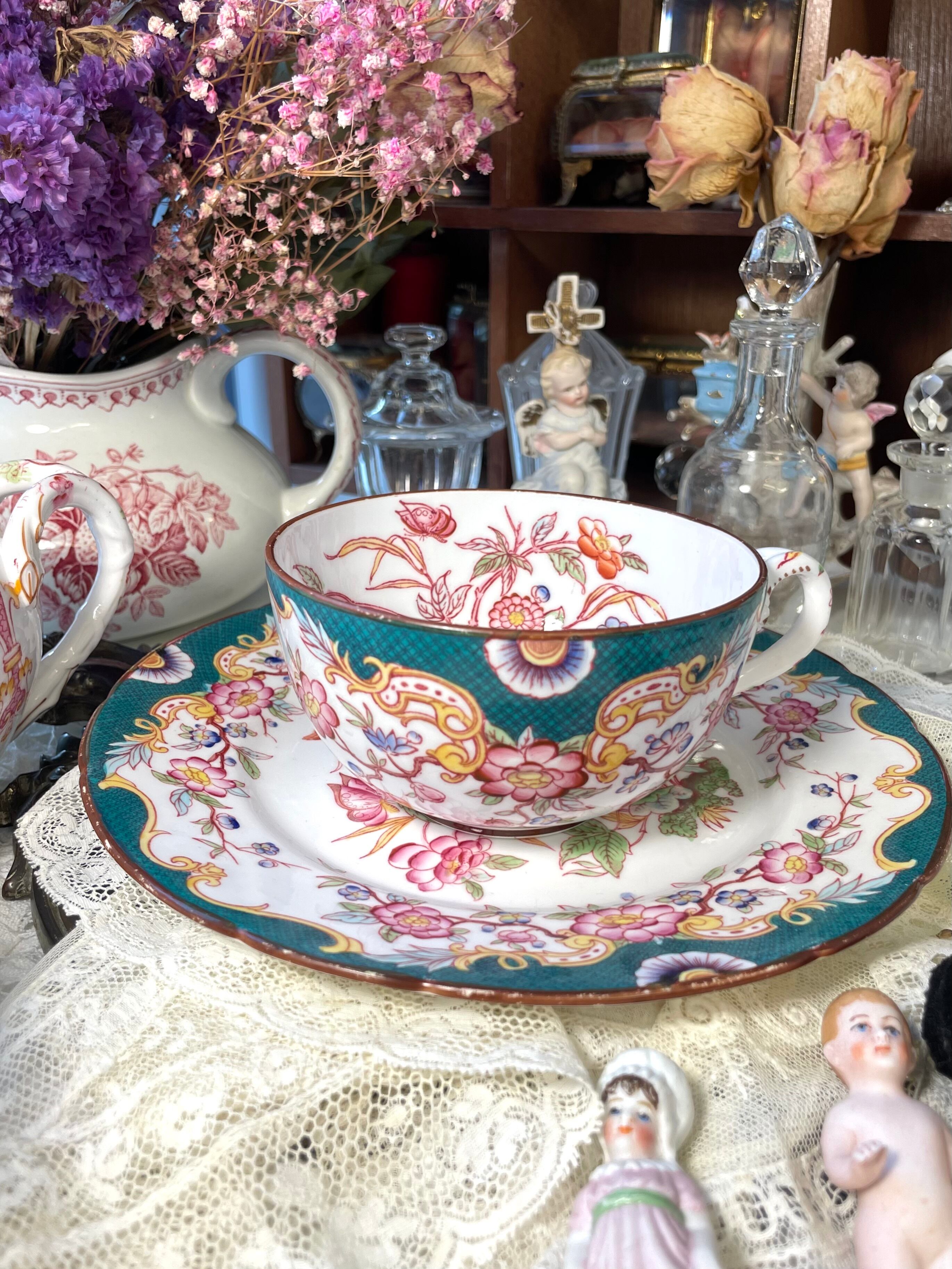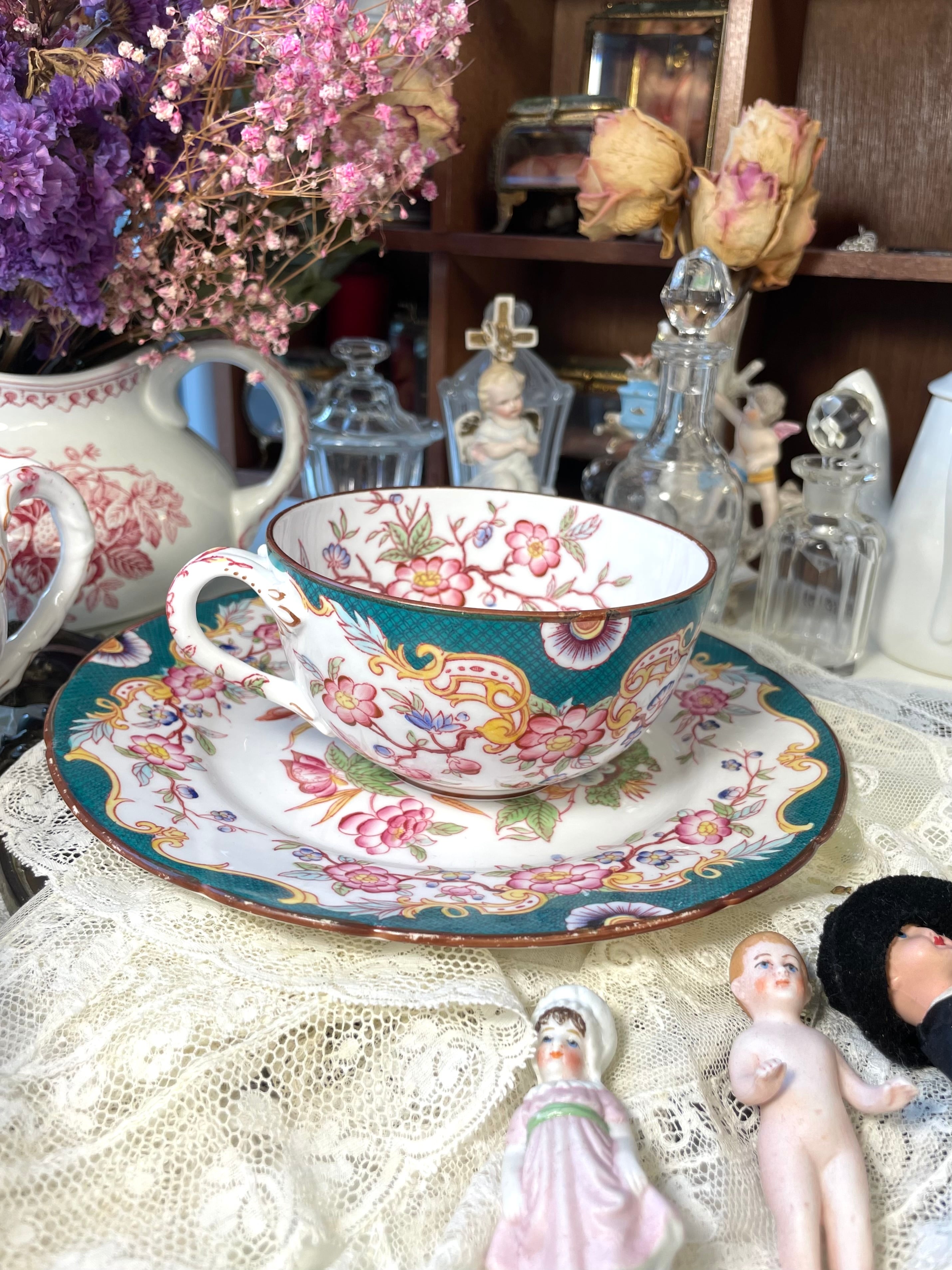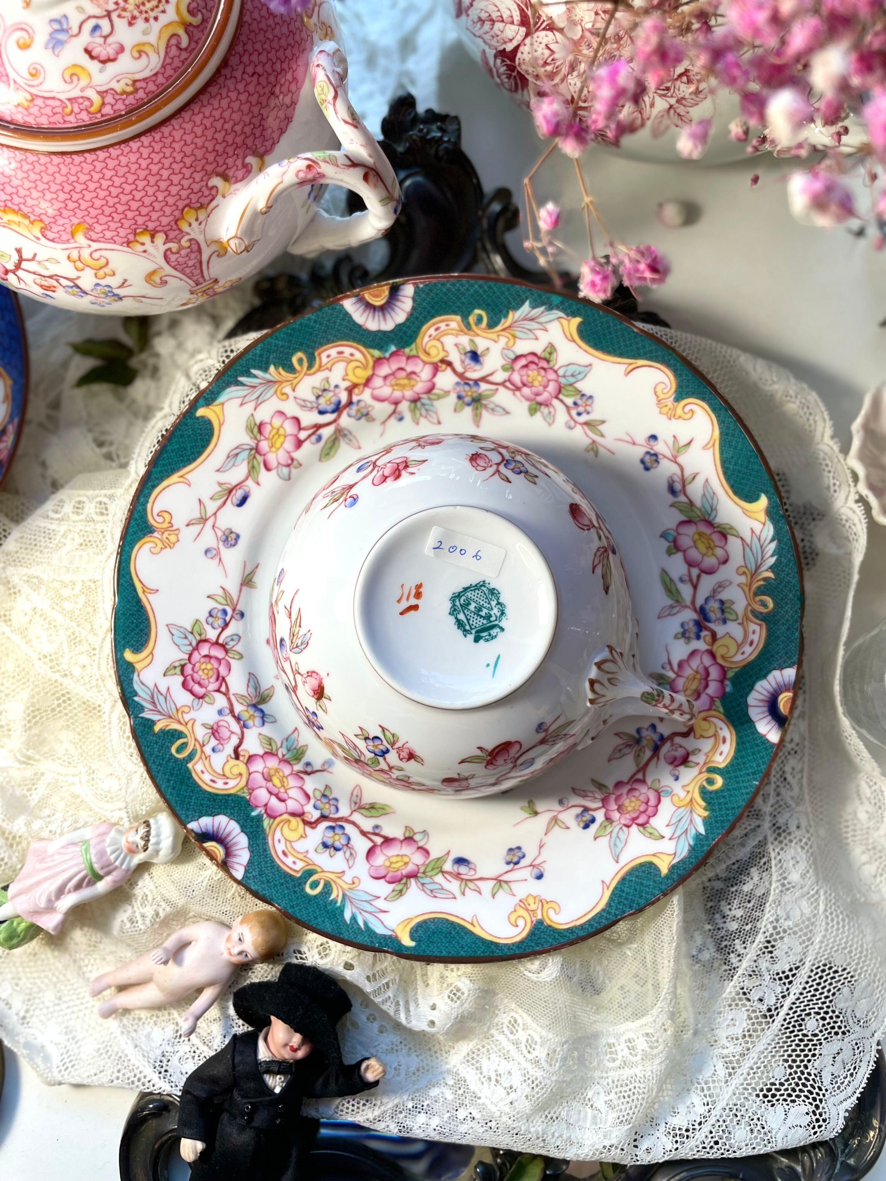 サルグミン製陶所による "ミントン "柄の美しい手描きのファイアンス製ティーカップとソーサーです。