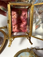で覆われており、バベルガラスを囲む真鍮のゴールドの枯れたアンティークの風合いの素敵な、大変希少な形のジュエリーボックス です。