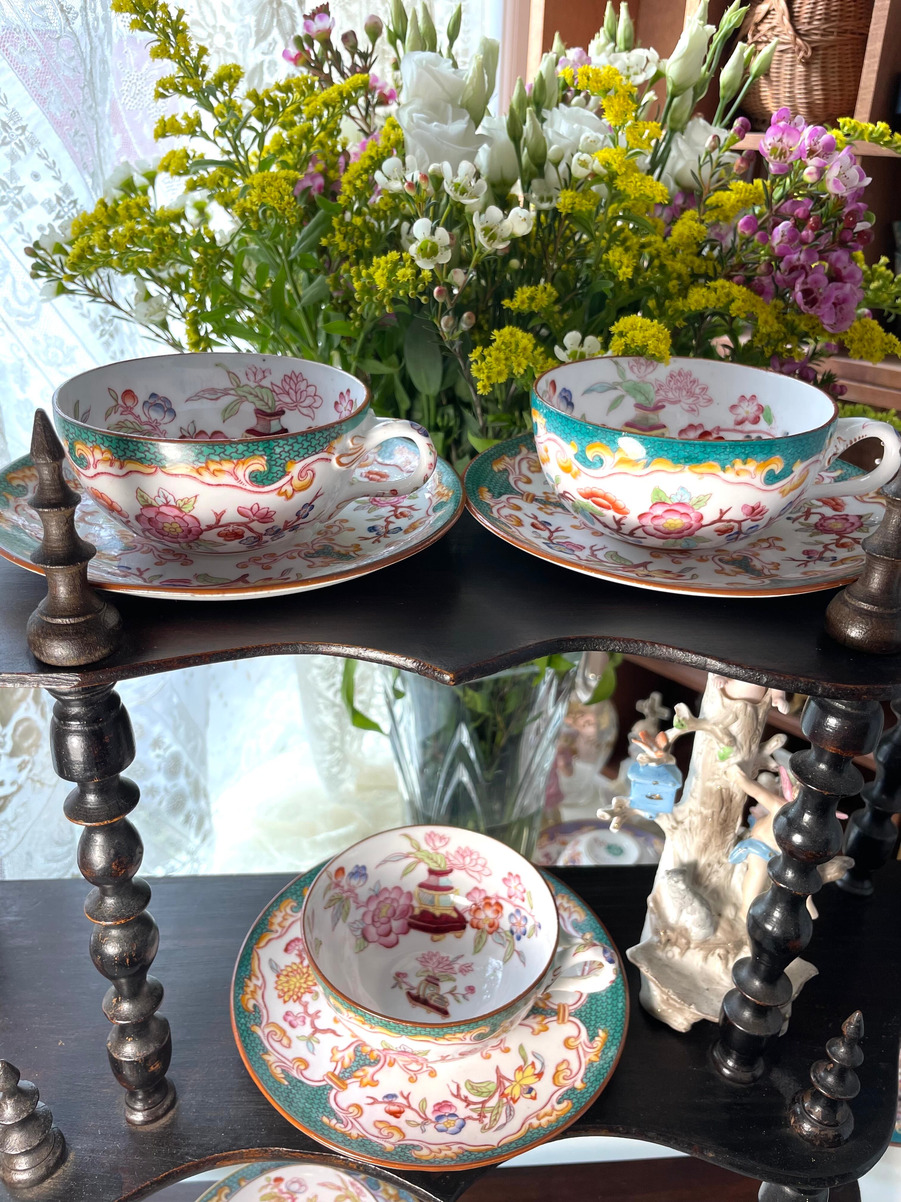 サルグミン製陶所による "ミントン "柄の美しい手描きのファイアンス製ティーカップとソーサーです。