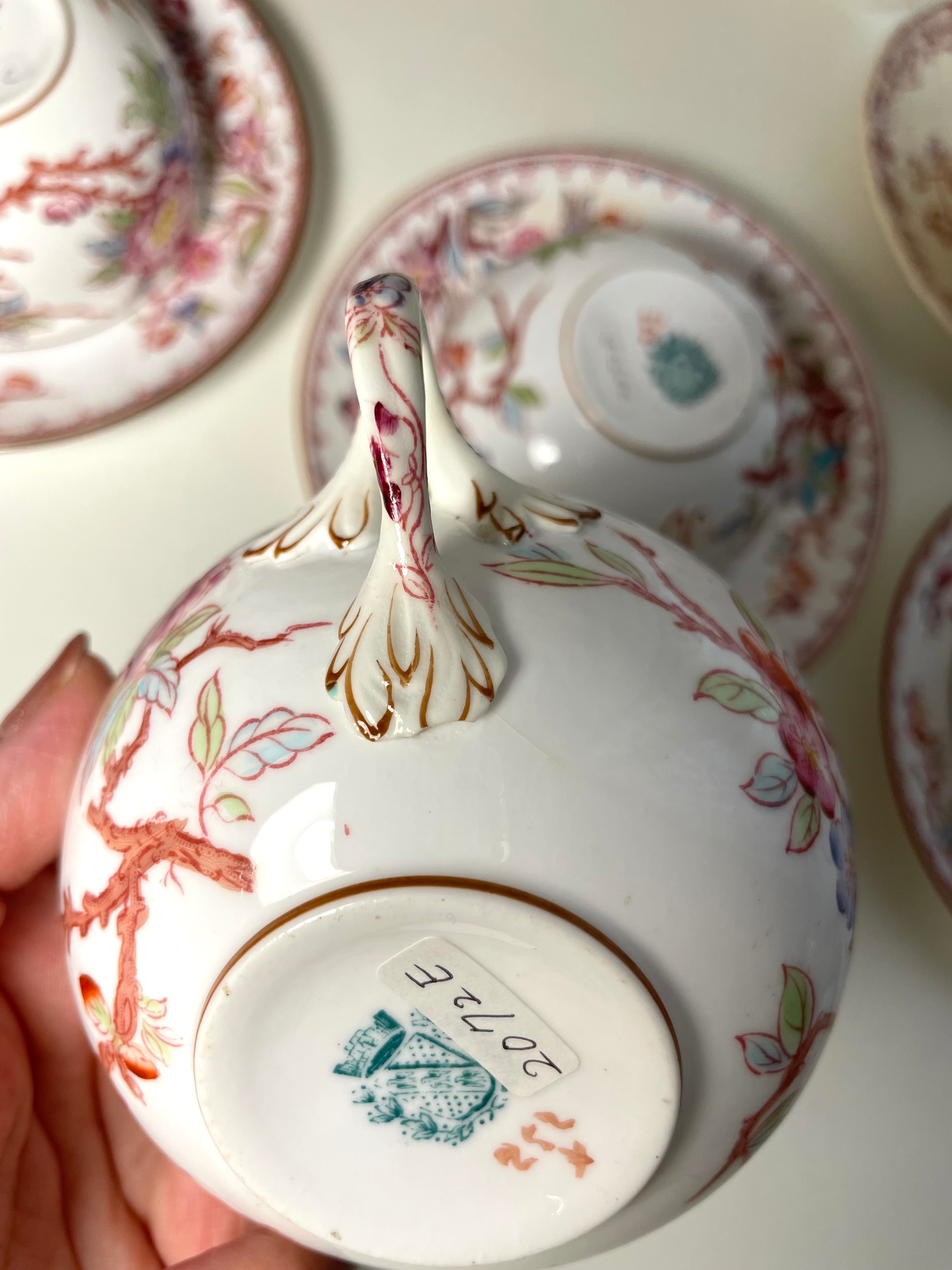 サルグミン製陶所による "ミントン "柄の美しい手描きのファイアンス製ティーカップとソーサーです。